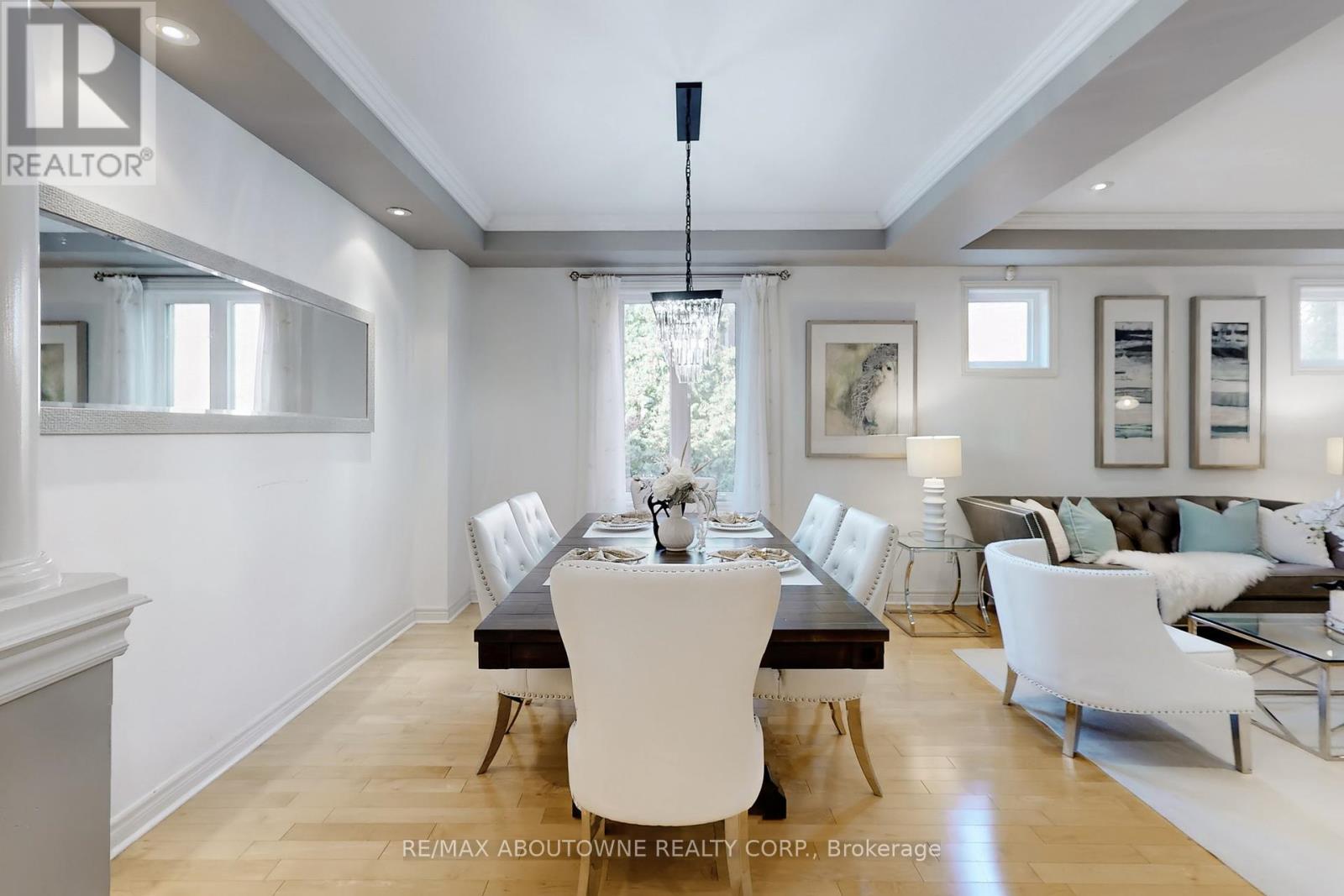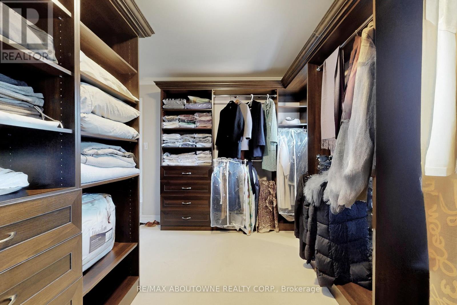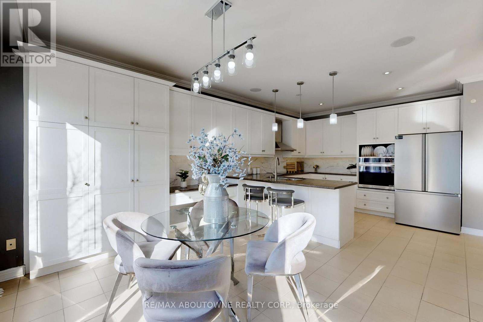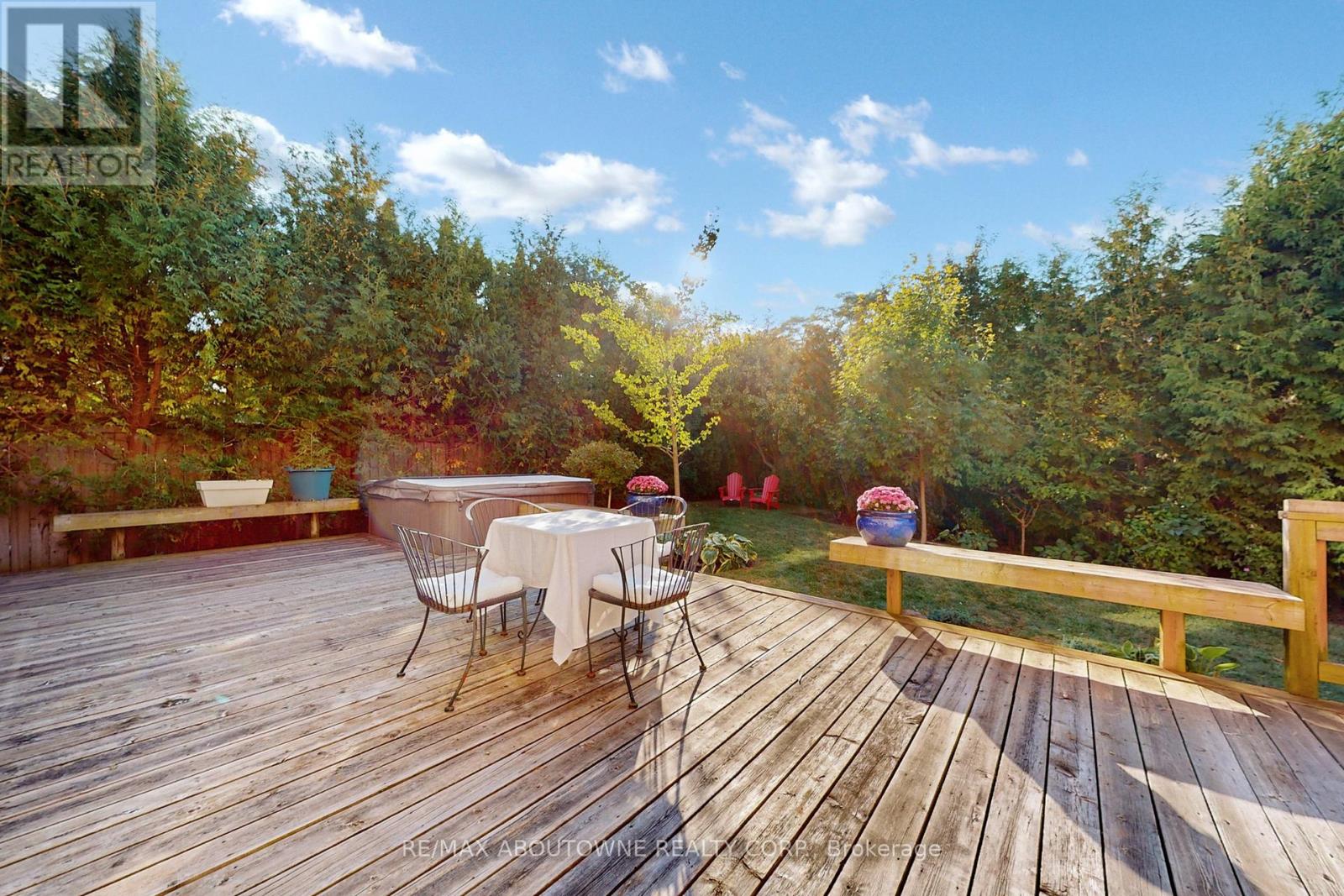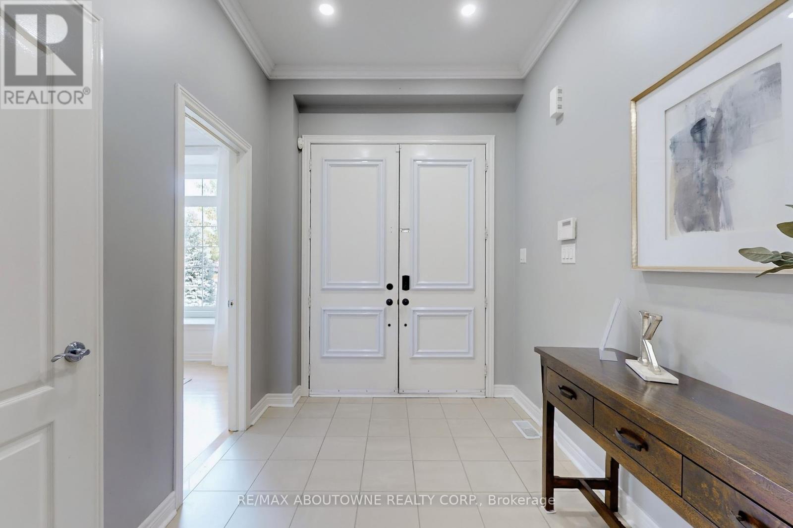 Prestigious Lakeshore Woods community! This exceptional residence sits on a rare pie-shaped lot that widens at the back, offering one of the largest and most private yards in the neighbourhood. With over 5000 sq ft of elegant living space plus a tandem 3-car garage, the home combines timeless curb appeal with modern comfort. A double-door entry leads to a soaring 10 ft foyer with walk-in closet, flanked by a bright front office. Formal living and dining rooms with coffered ceilings provide an elegant setting, while the gourmet white kitchen features granite counters, induction cooktop, LG built-in oven, newer fridge, chefs desk and triple pantry. The adjoining breakfast area is filled with natural light and overlooks the backyard, opening to the family room with two-sided fireplace, soaring windows and chandelier. A large laundry/mudroom and powder room complete the main level. Upstairs, four spacious bedrooms each have ensuite baths and walk-in closets. The luxurious primary retreat offers a king-sized bedroom, sitting area with decorative columns, sunroom-style alcove, two walk-in closets with built-ins and windows, and a spa-like ensuite with dual vanities, makeup station, soaker tub, glass shower, private toilet room and bonus storage. A generous walk-in linen closet adds practicality. The professionally finished lower level expands living space with a recreation and billiards area, media/TV lounge, fitness zone, kitchenette, guest bedroom, full bath and storage. Outdoor living includes a multi-level deck with gas line for BBQ, hot tub and outdoor sauna (both in as is condition), a half basketball court and mature trees for complete privacy. A reinforced pad at the front allows boat parking. Steps from Lake Ontario, Shell Park, trails and dog park, this is a rare lifestyle opportunity in one of Oakvilles most desirable neighbourhoods. (id:51158)