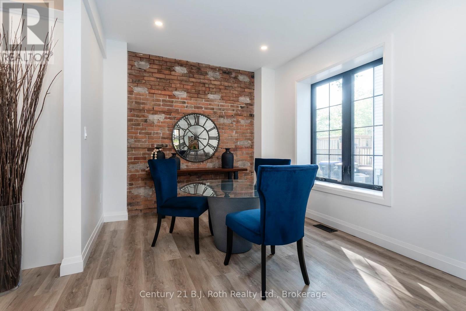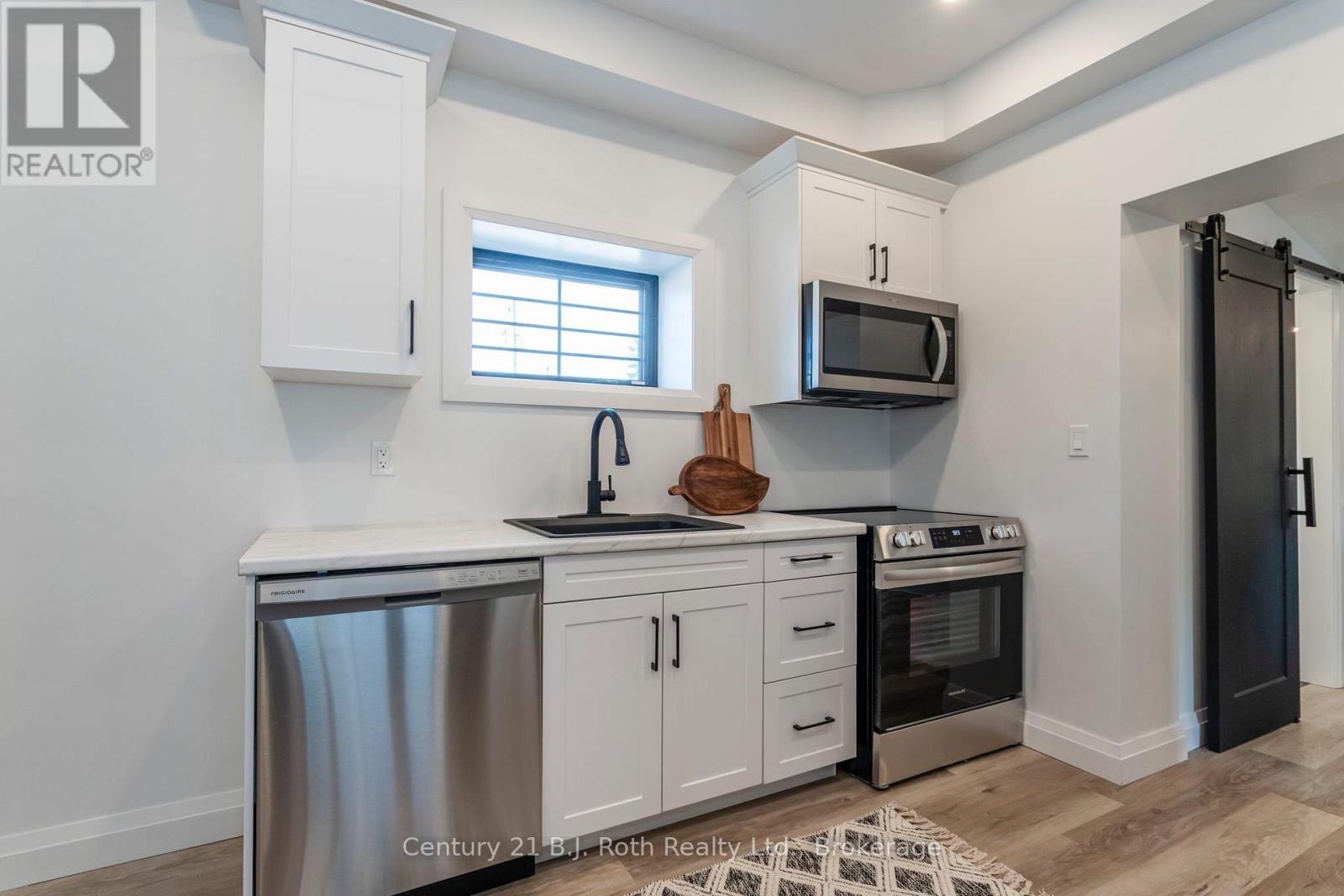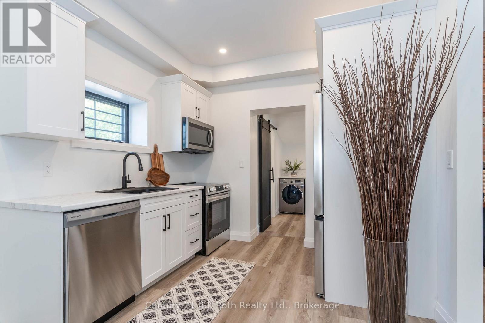 Chic Downtown Midland Retreat, located in Beautiful Georgian Bay. Fully Renovated, Zoned Commercial/Residential. Welcome to a home that truly checks all the boxes for modern living and prime location. Take a stroll to Midlands vibrant downtown core, cafés, boutiques, restaurants, waterfront and Marina. You'll be living in the heart of it all while enjoying the peace and charm of this home. Fully renovated 2-bedroom, 2-bathroom with a finished basement gem offers the perfect blend of barn-house charm and urban sophistication. 1,000 + sq.ft. of beautifully designed space. Stylish & Smart Living. Step inside to discover 9-foot ceilings, sleek black-framed windows, and a stunning exposed brick feature wall that anchors the home with warmth and character. Black barn doors and modern black hardware throughout the kitchen and baths complete the Barnhouse aesthetic. Bright, Airy, & Inviting. Natural light fills the open-concept living and dining area, creating a vibrant atmosphere that feels as good as it looks. Whether you're enjoying a quiet morning or hosting friends this summer, the layout is both functional and stylish. The main-floor laundry and all-new appliances add even more everyday convenience. Finished Basement for a home office, media room or great play-room. Turn your 115 ft deep backyard to a summer retreat. This home offers exceptional flexibility for professionals, young family or entrepreneurs looking to live and work in one dynamic space. (id:51158)