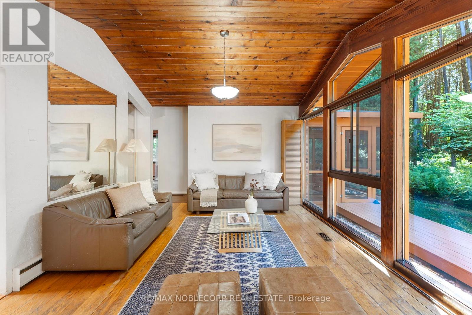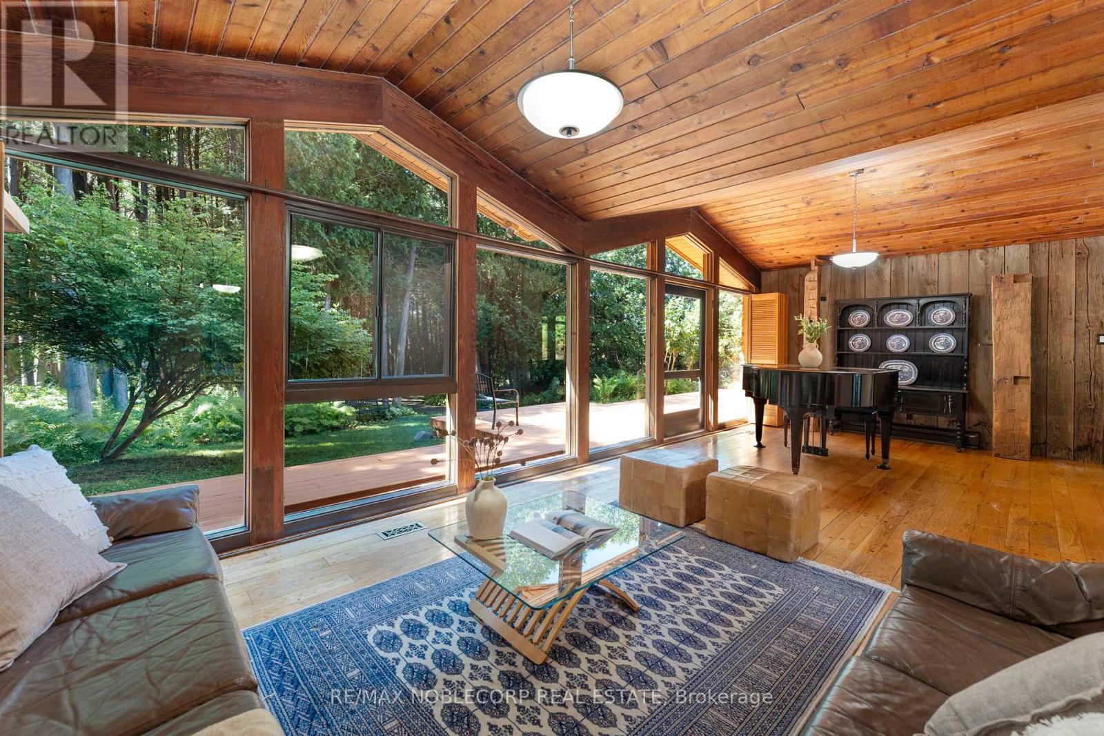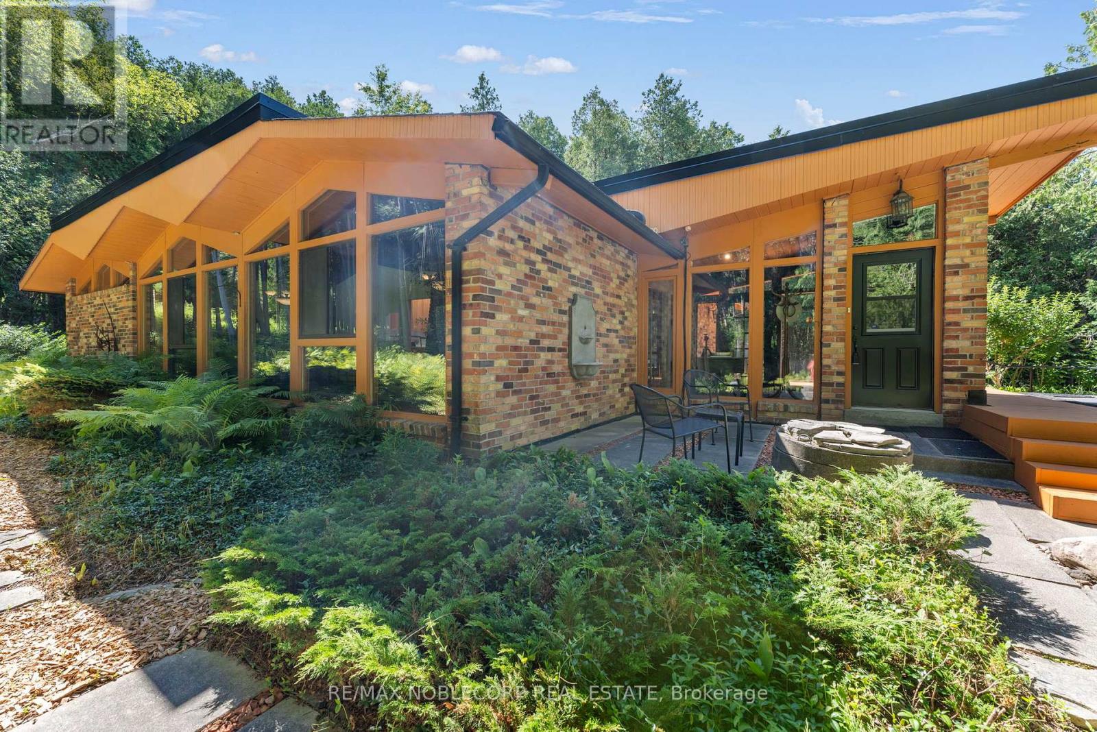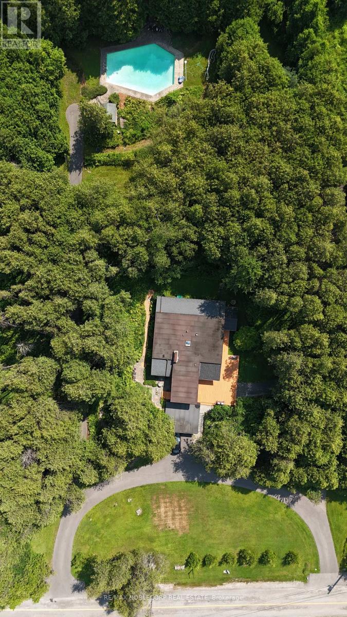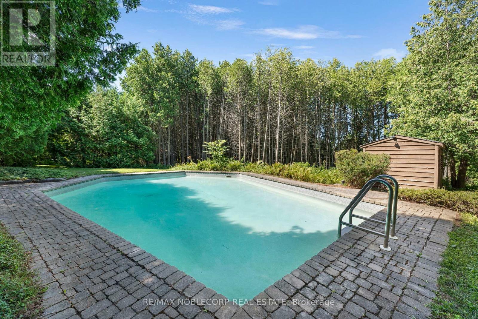 Welcome to 3435 Greenwood Rd sitting on this distinguished private lot (235.20 ft x 377.76 ft). Nestled in the peaceful village of Greenwood, this one-of-a-kind architectural custom-built home offers privacy, character, and outdoor beauty on a lush 2.01 acres. With 2,505 sq ft of finished living space, this home blends timeless design with natures tranquilly. Inside, enjoy floor-to-ceiling windows, solid cedar ceilings, and a sunken seating area with a natural gas fireplace. The living room features historic Casa Loma oak pegged hardwood, while the skylit kitchen flows into open-concept dining and living areas. Three spacious bedrooms are on the main floor, plus a private lower-level 4th bedroom perfect for guests or in-laws. Outdoor living is a dream with 925 sq ft of decking, a screened gazebo, a 335 sq ft patio, a 755 sq ft pool patio with casita, and a stunning 30' x 40' hexagonal pool. The grounds include mature trees, garden patios, and a second well providing an unlimited water supply. A spacious outbuilding with Hydro service provides an additional 490 sq feet of vehicle storage /workshop space **Key features: Circular, double driveway (repaved 2023)Two-door garage (490 sq ft) + tool storage. Detached 2-car outbuilding/workshop (465 sq ft) with hydro service. Pool hut for storage (80 sq ft) Natural gas furnace and central A/C New asphalt & commercial-grade roofs (2015 & 2023) Updated plumbing & electrical (dates unknown)Underground Electric and High Speed Internet Cable Walk to Greenwood Conservation Area, Valley View Public School, and the future Pickering Heritage Centre (2026). Quick access to Hwy 407/401.A rare offering where history, privacy, and lifestyle converge in one of Pickering's most treasured communities. (id:51158)