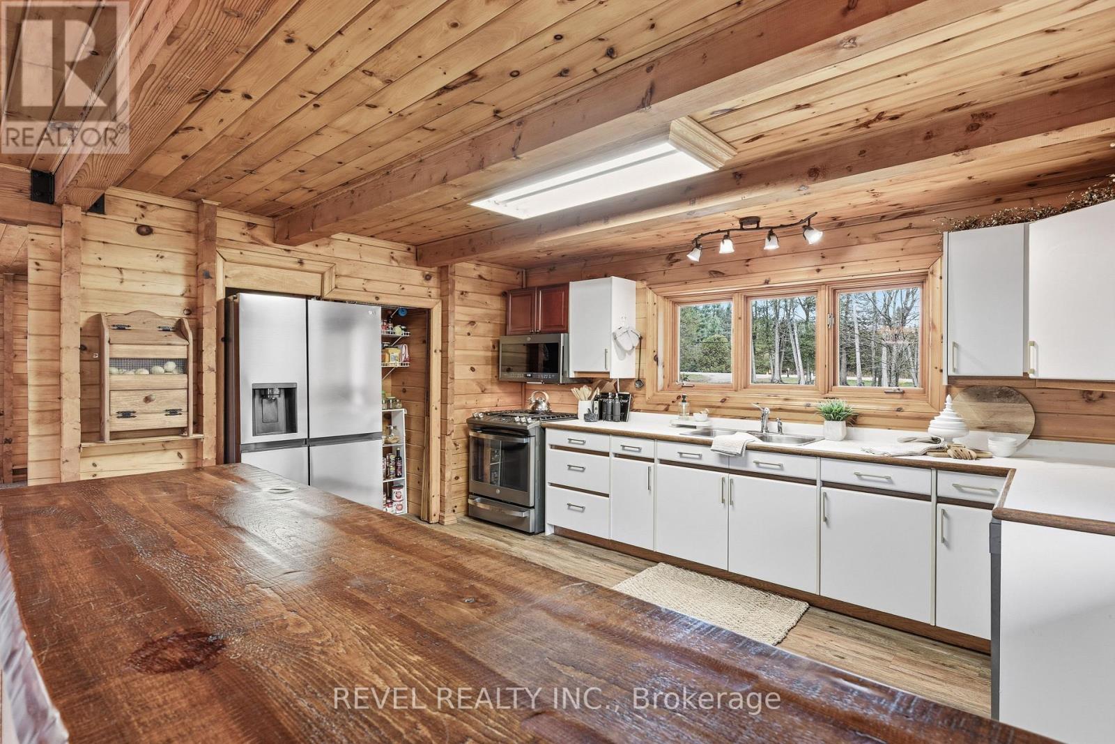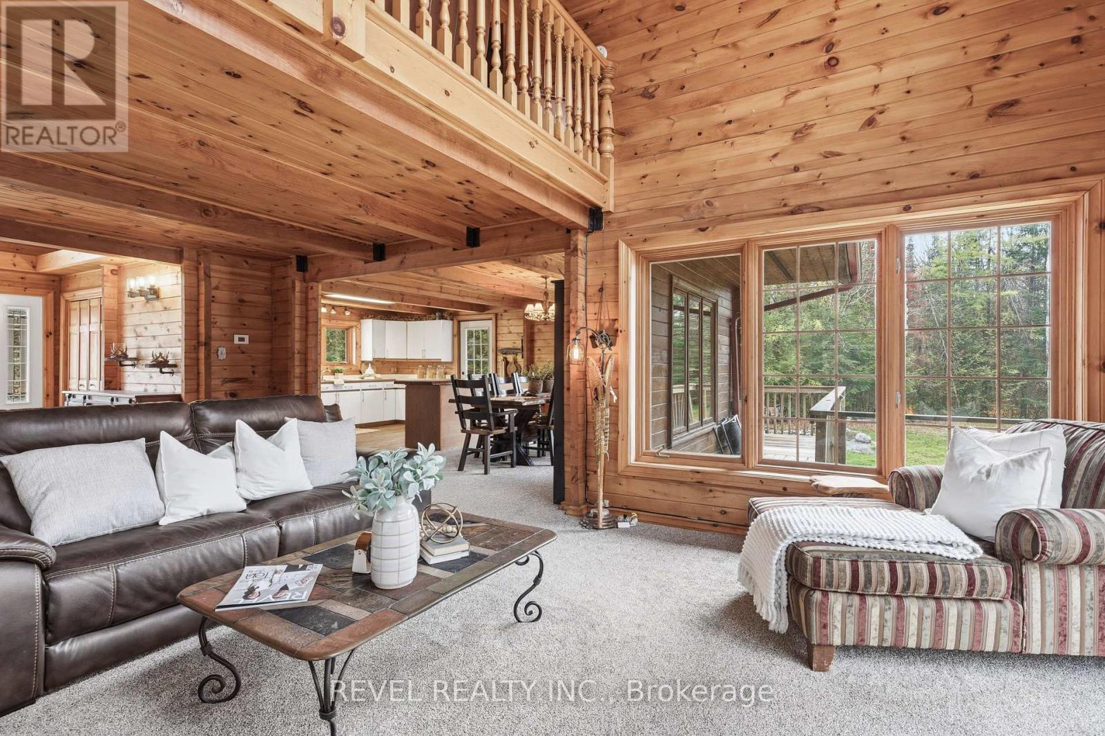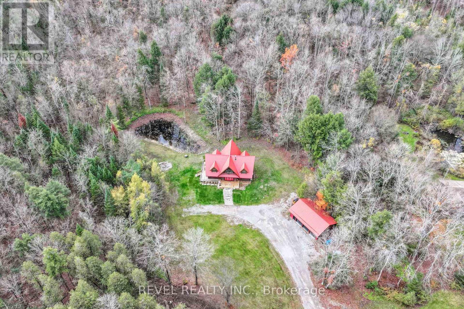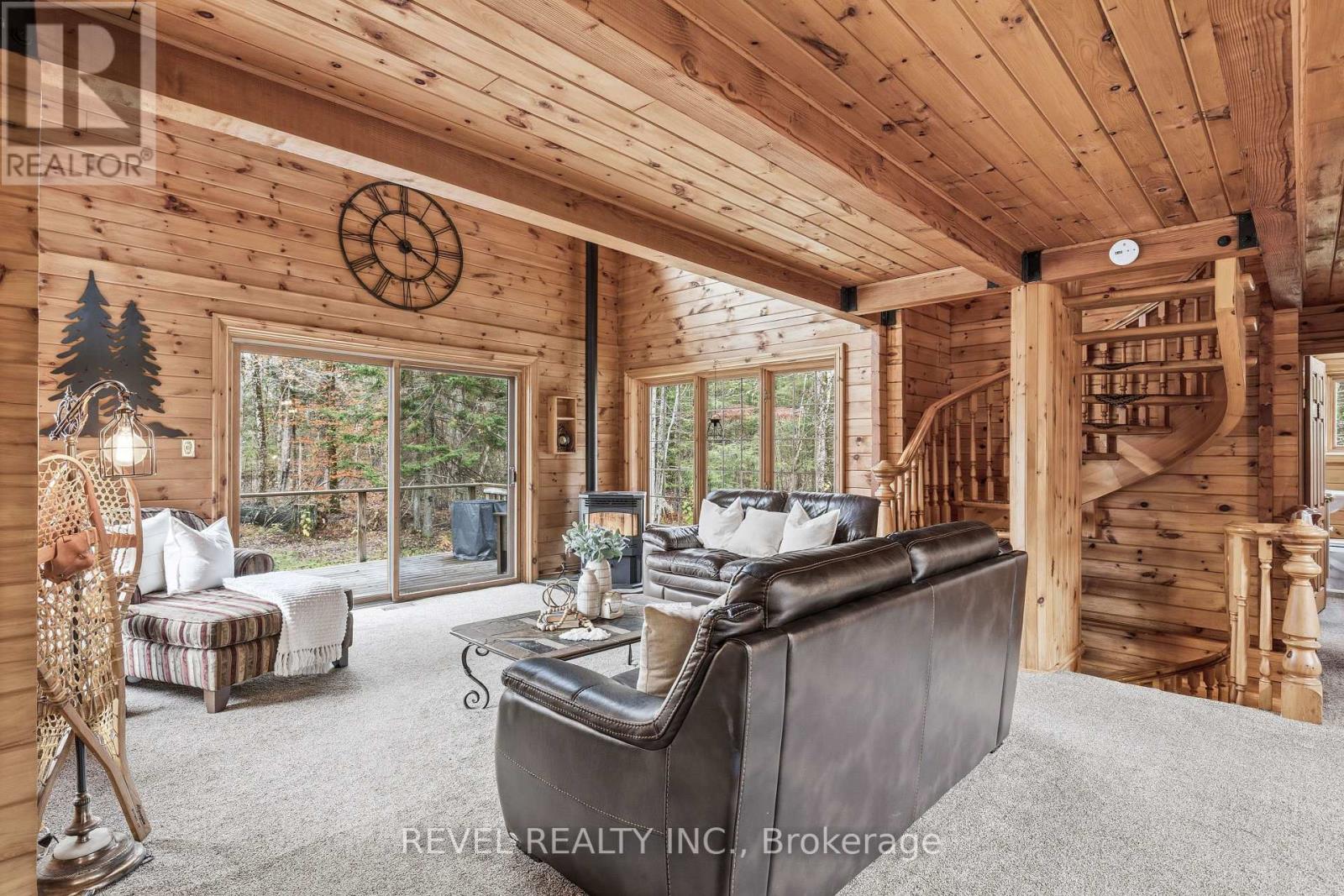 4+1 bedroom 3 bathroom log home with metal roof, offers the perfect balance of rustic charm and modern comfort. Walk in and be mesmerized by the grand foyer & living area, cathedral wood ceilings, cozy fireplace and abundant natural light from picturesque windows creating a warm and inviting atmosphere.The kitchen/dining combo is a cooking paradise, featuring newer appliances, propane stove, OTR microwave, pantry and ideal for both daily living and entertaining. Gorgeous spiral natural wood staircase leading you to the upper level of the home with additional bedrooms, full bathroom and sitting area loft. Primary Suite with walk out Juliet Deck. Lower level with full recreational room, laundry area, sauna, work out area, bathroom and walk out to yard. Step outside to the expansive wraparound deck with breathtaking views of the pond and surrounding 1.89 acres of forest. Bonus three car detached garage with hydro. Fully Furnished One Year Lease. (id:51158)