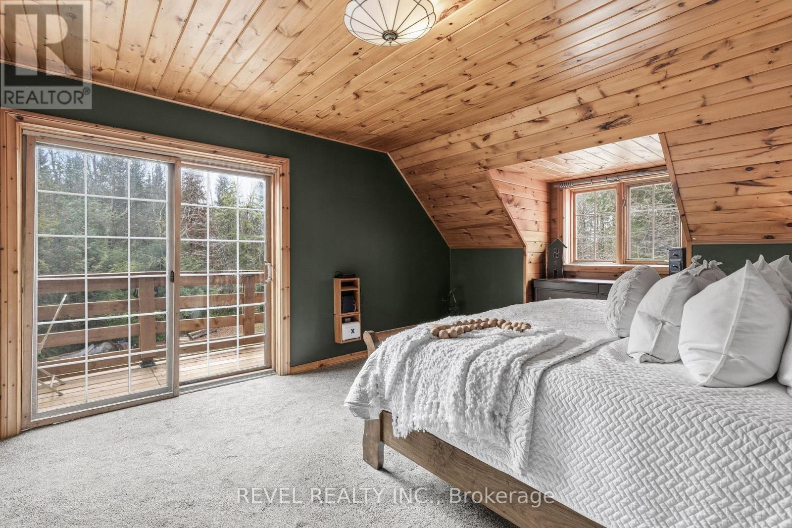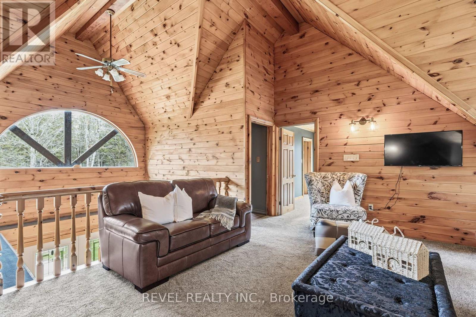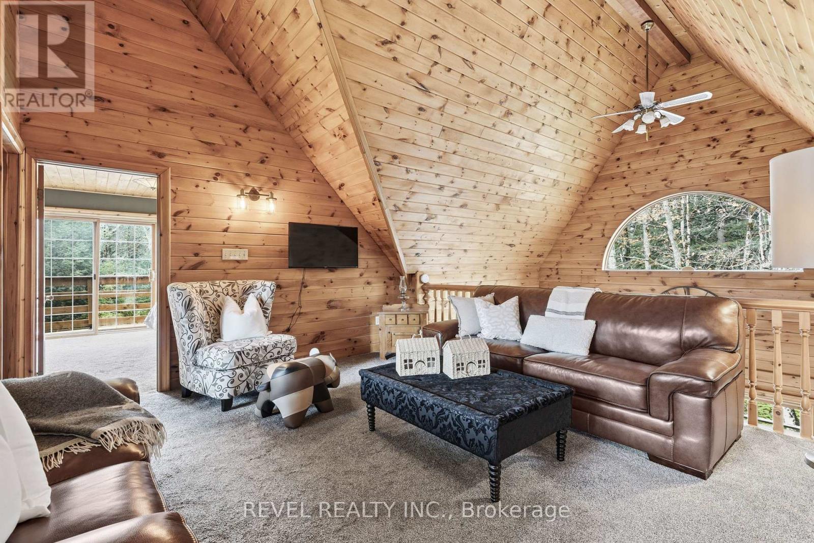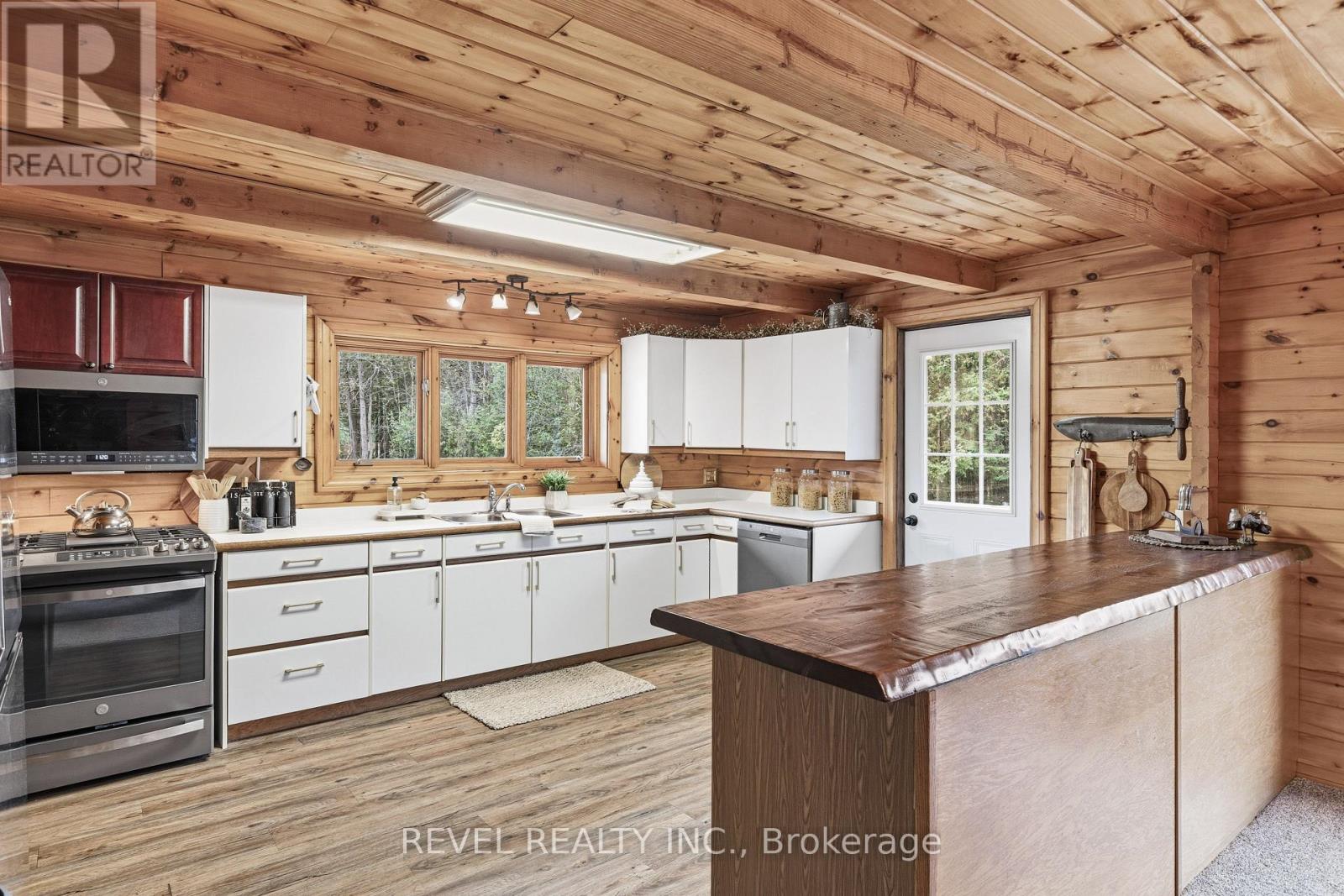4+1 bedroom 3 bathroom log home with metal roof, offers the perfect balance of rustic charm and modern comfort. Walk in and be mesmerized by the grand foyer & living area, cathedral wood ceilings, cozy fireplace and abundant natural light from picturesque windows creating a warm and inviting atmosphere.The kitchen/dining combo is a cooking paradise, featuring newer appliances, propane stove, OTR microwave, pantry and ideal for both daily living and entertaining. Gorgeous spiral natural wood staircase leading you to the upper level of the home with additional bedrooms, full bathroom and sitting area loft. Primary Suite with walk out Juliet Deck. Lower level with full recreational room, laundry area, sauna, work out area, bathroom and walk out to yard. Step outside to the expansive wraparound deck with breathtaking views of the pond and surrounding 1.89 acres of forest. Bonus three car detached garage with hydro. Fully Furnished One Year Lease. (id:51158)