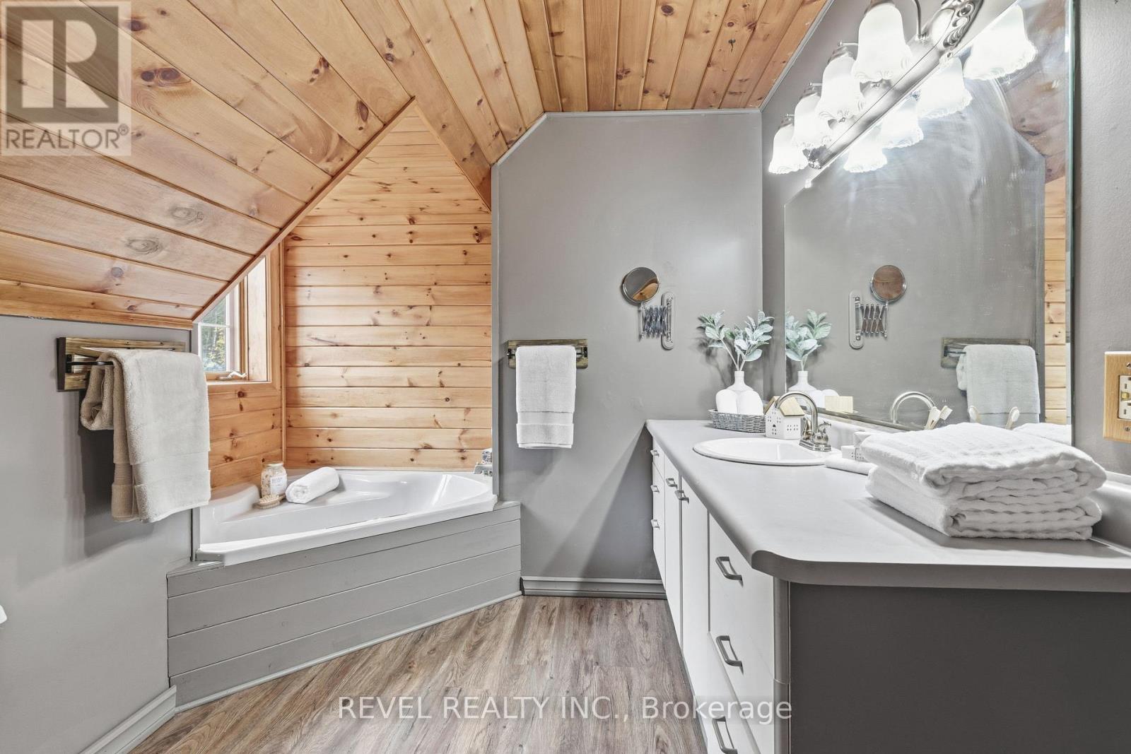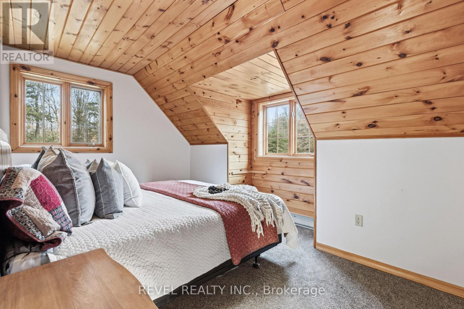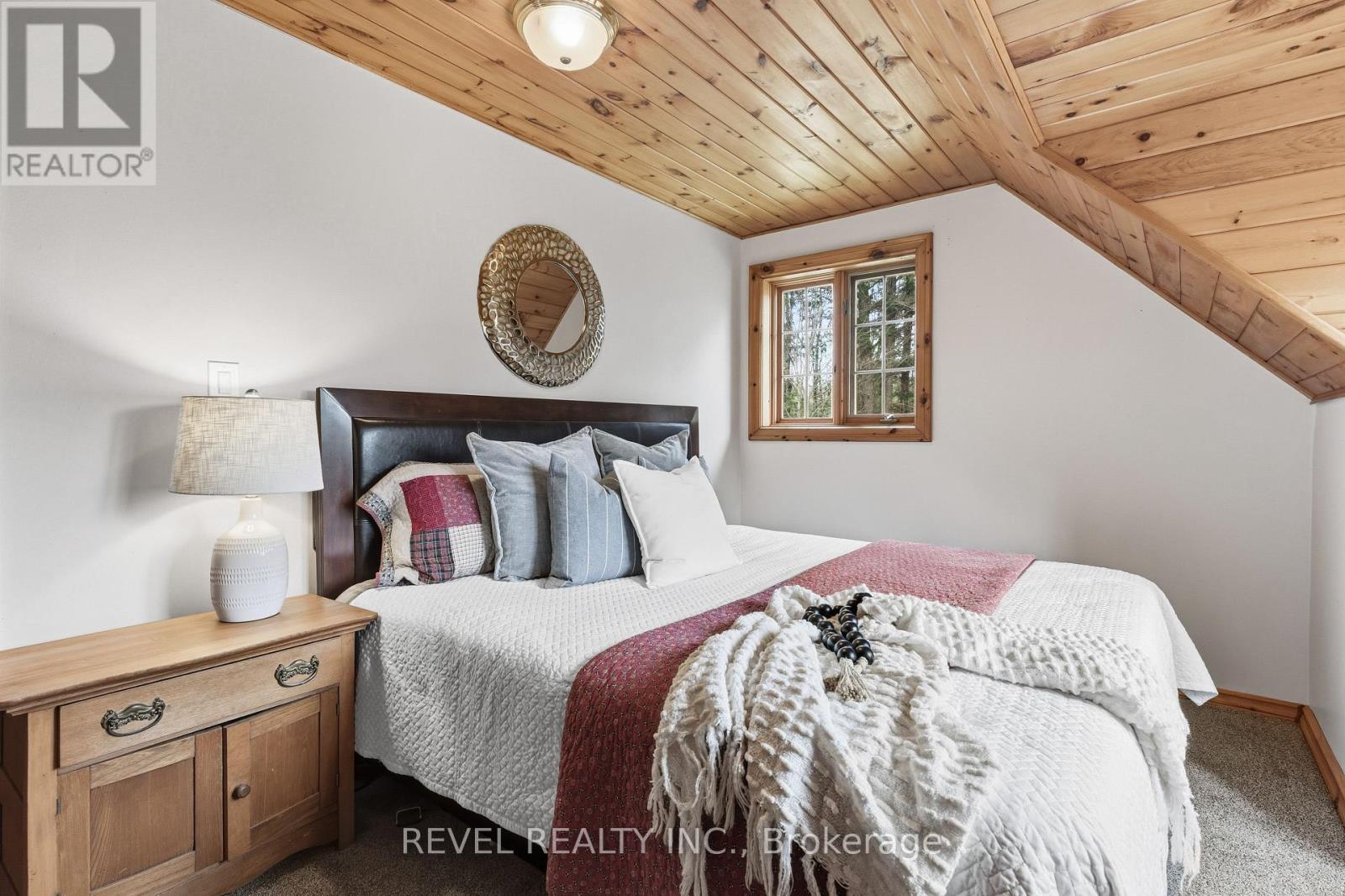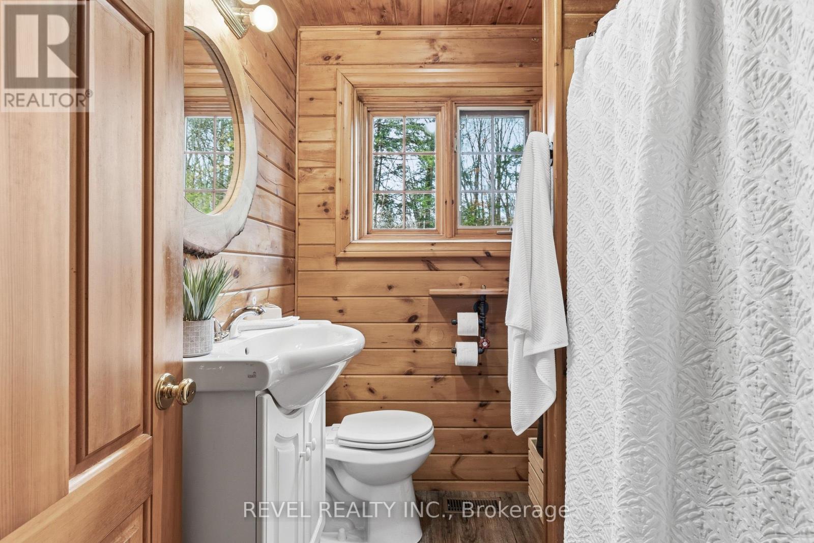 4+1 bedroom 3 bathroom log home with metal roof, offers the perfect balance of rustic charm and modern comfort. Walk in and be mesmerized by the grand foyer & living area, cathedral wood ceilings, cozy fireplace and abundant natural light from picturesque windows creating a warm and inviting atmosphere.The kitchen/dining combo is a cooking paradise, featuring newer appliances, propane stove, OTR microwave, pantry and ideal for both daily living and entertaining. Gorgeous spiral natural wood staircase leading you to the upper level of the home with additional bedrooms, full bathroom and sitting area loft. Primary Suite with walk out Juliet Deck. Lower level with full recreational room, laundry area, sauna, work out area, bathroom and walk out to yard. Step outside to the expansive wraparound deck with breathtaking views of the pond and surrounding 1.89 acres of forest. Bonus three car detached garage with hydro. Fully Furnished One Year Lease. (id:51158)