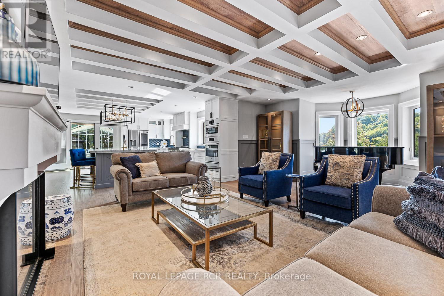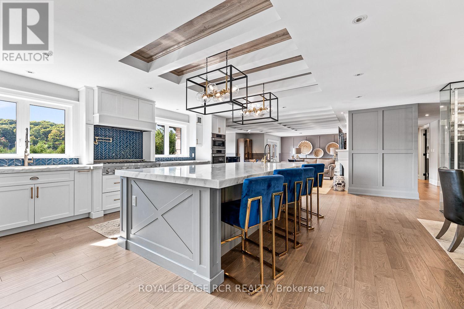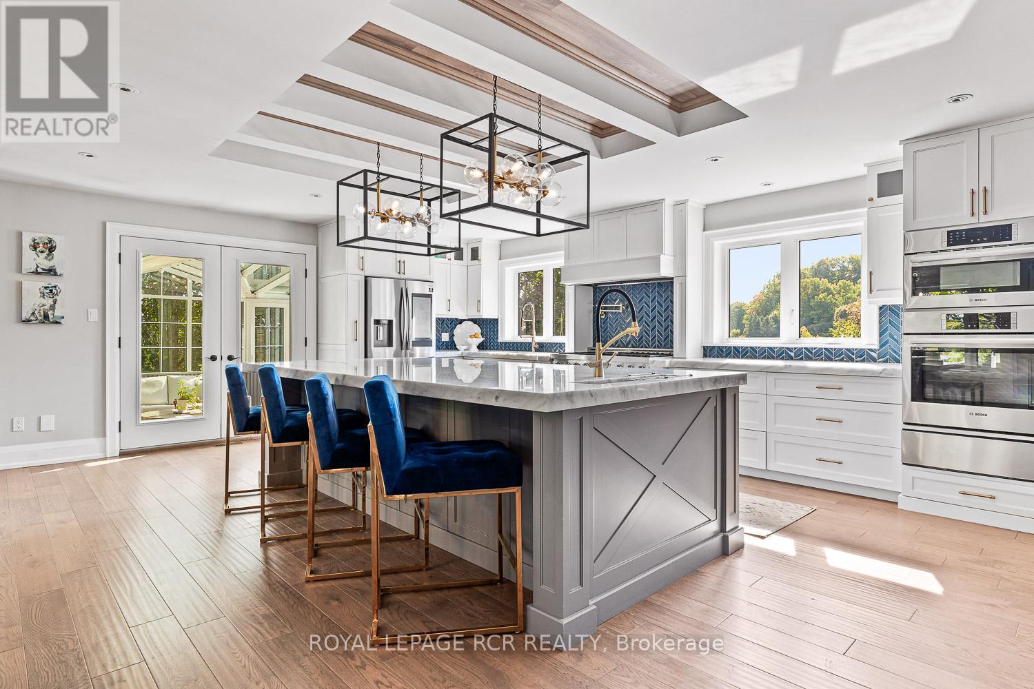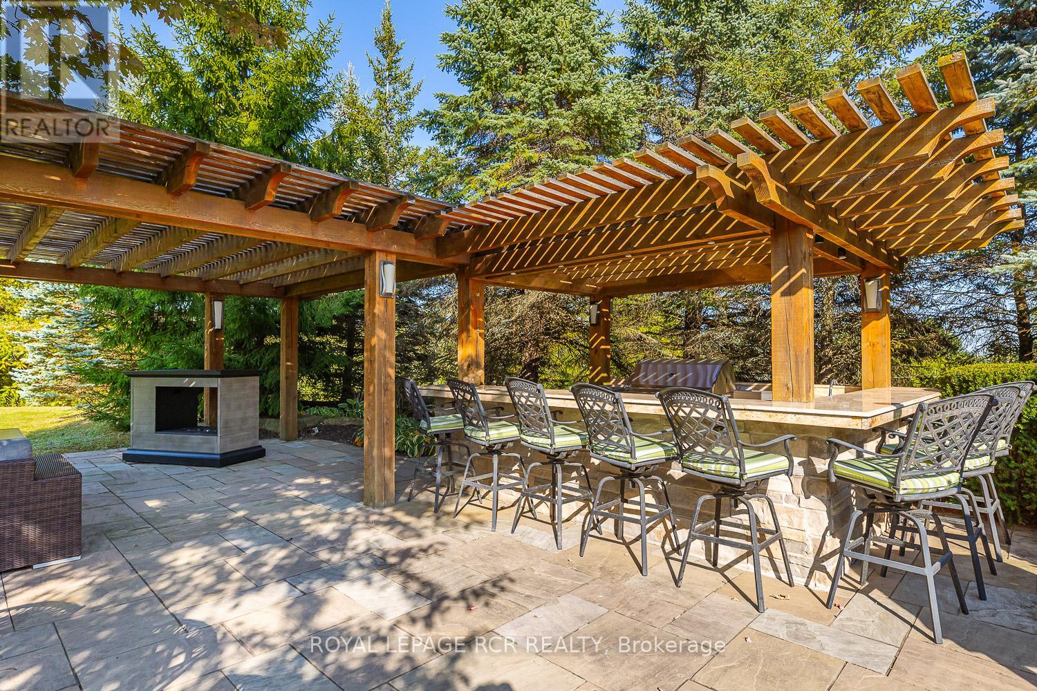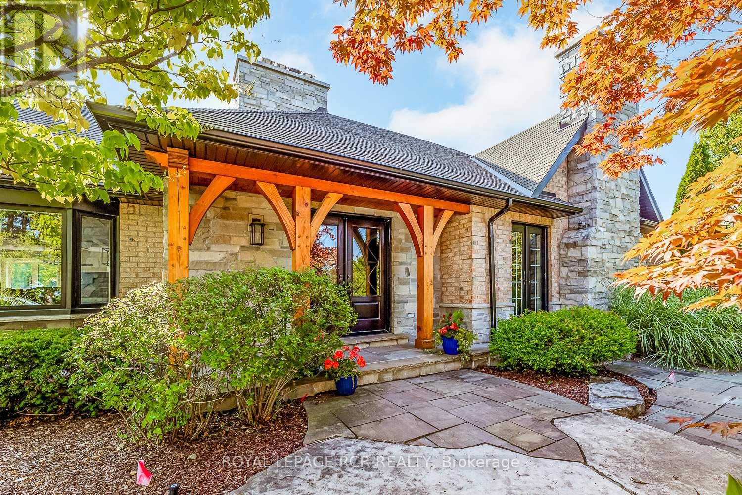 Architectural Design by David Small, Expansive Light filled Exec Bungalow offers wonderful sweeping panoramic 360 views of Caledon, unprecedented privacy and an abundance of custom details. Entertainers Dream inside & out- over 400k spent interior renos and another 400k in Landscape/Hardscape featuring a Grand Outdoor Kitchen/ Bar Patio area. All 4 bdrms w 4 ensuite baths, 4 fireplaces. Lavish millwork & coffered ceilings with wood inlay. Custom Light Fixtures, Inspirational Foyer with Herringbone floors, Custom Doors thru out. Grand Living Rm w Antique brick fireplace, B/ I wall Cabinets, Double French Dr Walkouts to Breathtaking front gardens, walkways, waterfall pond. Floor to ceiling glass shelves and exquisite custom wall cabinetry in Dining Rm with B/I Miele Coffee/ wet bar, B/I wine fridge. Sensational Gourmet Kitchen, 10 ' Island with Marble c-tops & B/I sink, 6 burner Gas Range, Bosch double ovens, w/o to South facing sun-filled Solarium. Enjoy Hot Tub & Massive Composite decking w glass handrails off main floor overlooking 2nd outdoor patio area. Escape to the luxurious master retreat w electric fireplace, & stunning views from Bay window or w/o to perfectly sheltered sitting area on deck to enjoy sunshine & countryside views, Gorgeous Spa bathroom, large glass walk in shower, freestanding tub, functional closet design w B/I drawers, beautiful light fixtures. Light -filled Lower level living space awesome wet bar w Quartz c-tops, B/i Oven , Fireplace/Woodstove insert, B/I shelves, large workshop and storage space w high ceilings, Car Enthusiasts Dream 3 car Garage finished space/ workshop. 6195 Total space as per attached floor plans. (id:51158)