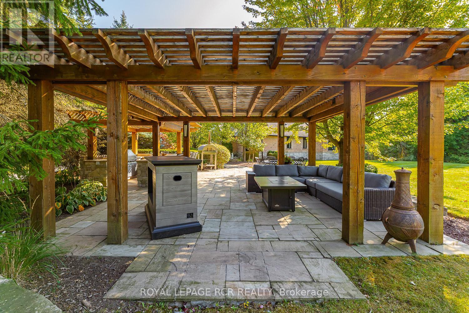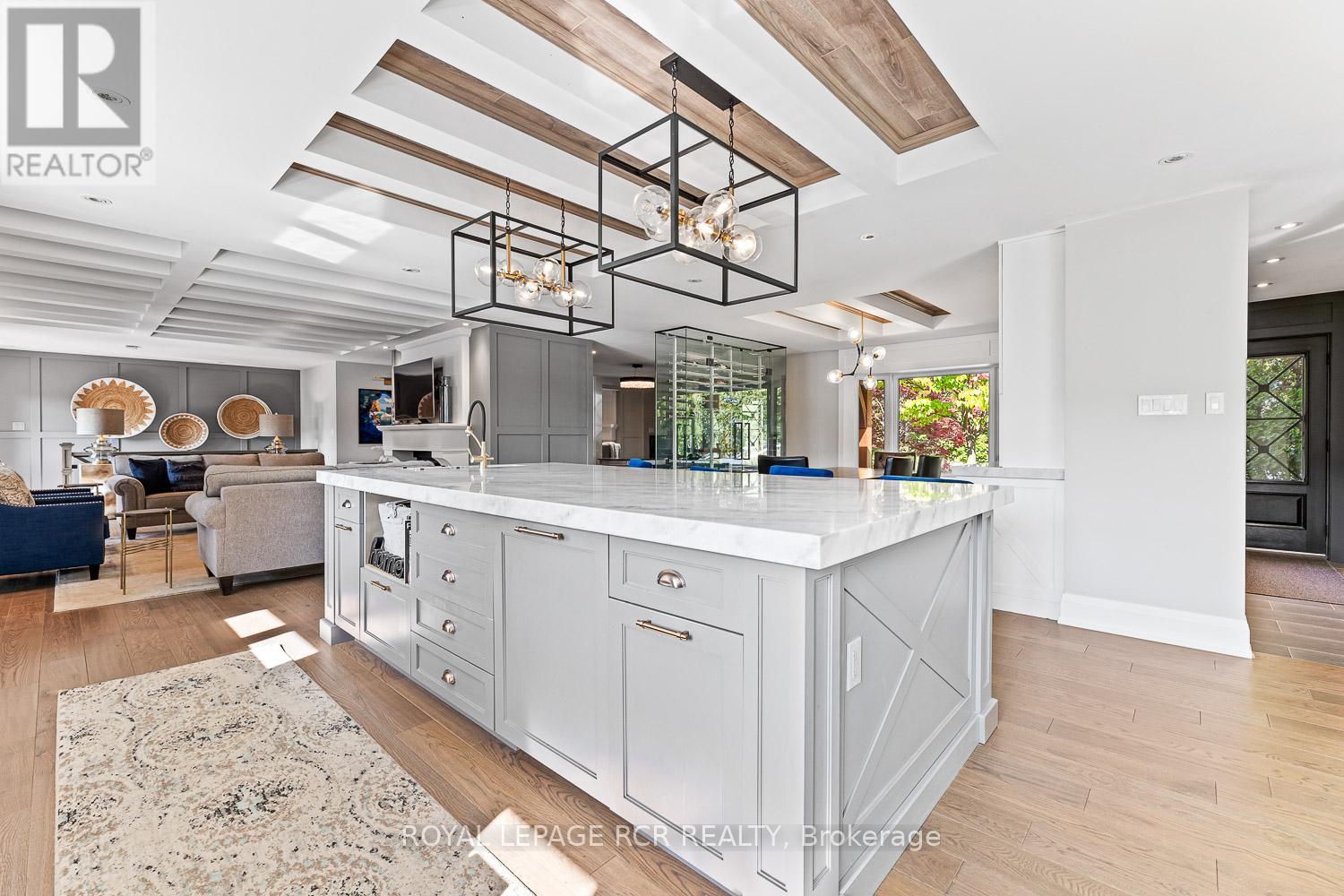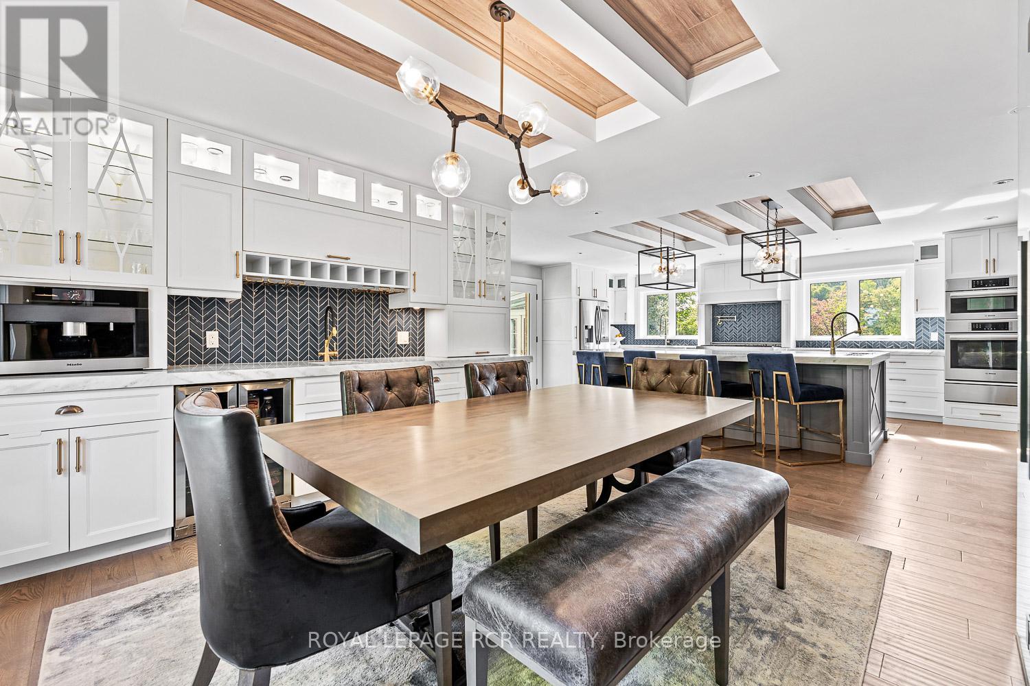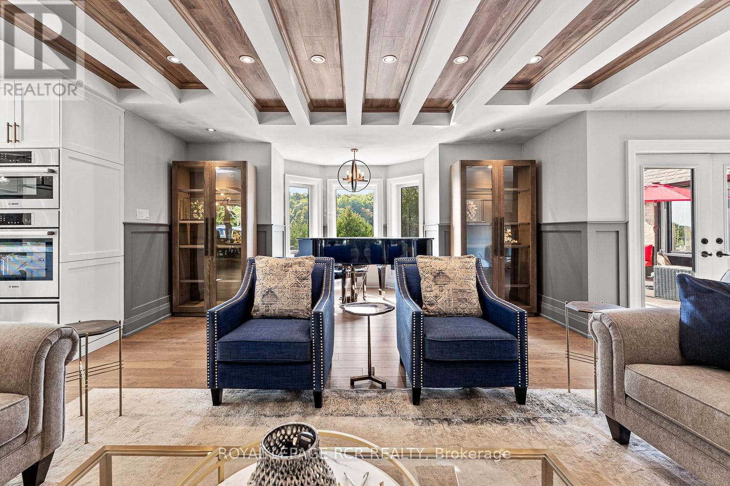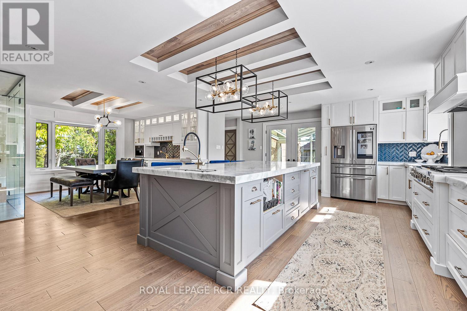 Architectural Design by David Small, Expansive Light filled Exec Bungalow offers wonderful sweeping panoramic 360 views of Caledon, unprecedented privacy and an abundance of custom details. Entertainers Dream inside & out- over 400k spent interior renos and another 400k in Landscape/Hardscape featuring a Grand Outdoor Kitchen/ Bar Patio area. All 4 bdrms w 4 ensuite baths, 4 fireplaces. Lavish millwork & coffered ceilings with wood inlay. Custom Light Fixtures, Inspirational Foyer with Herringbone floors, Custom Doors thru out. Grand Living Rm w Antique brick fireplace, B/ I wall Cabinets, Double French Dr Walkouts to Breathtaking front gardens, walkways, waterfall pond. Floor to ceiling glass shelves and exquisite custom wall cabinetry in Dining Rm with B/I Miele Coffee/ wet bar, B/I wine fridge. Sensational Gourmet Kitchen, 10 ' Island with Marble c-tops & B/I sink, 6 burner Gas Range, Bosch double ovens, w/o to South facing sun-filled Solarium. Enjoy Hot Tub & Massive Composite decking w glass handrails off main floor overlooking 2nd outdoor patio area. Escape to the luxurious master retreat w electric fireplace, & stunning views from Bay window or w/o to perfectly sheltered sitting area on deck to enjoy sunshine & countryside views, Gorgeous Spa bathroom, large glass walk in shower, freestanding tub, functional closet design w B/I drawers, beautiful light fixtures. Light -filled Lower level living space awesome wet bar w Quartz c-tops, B/i Oven , Fireplace/Woodstove insert, B/I shelves, large workshop and storage space w high ceilings, Car Enthusiasts Dream 3 car Garage finished space/ workshop. 6195 Total space as per attached floor plans. (id:51158)