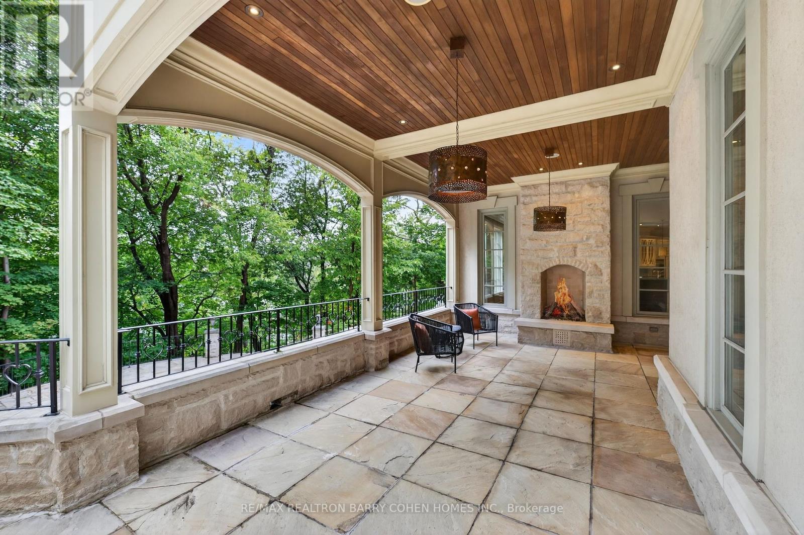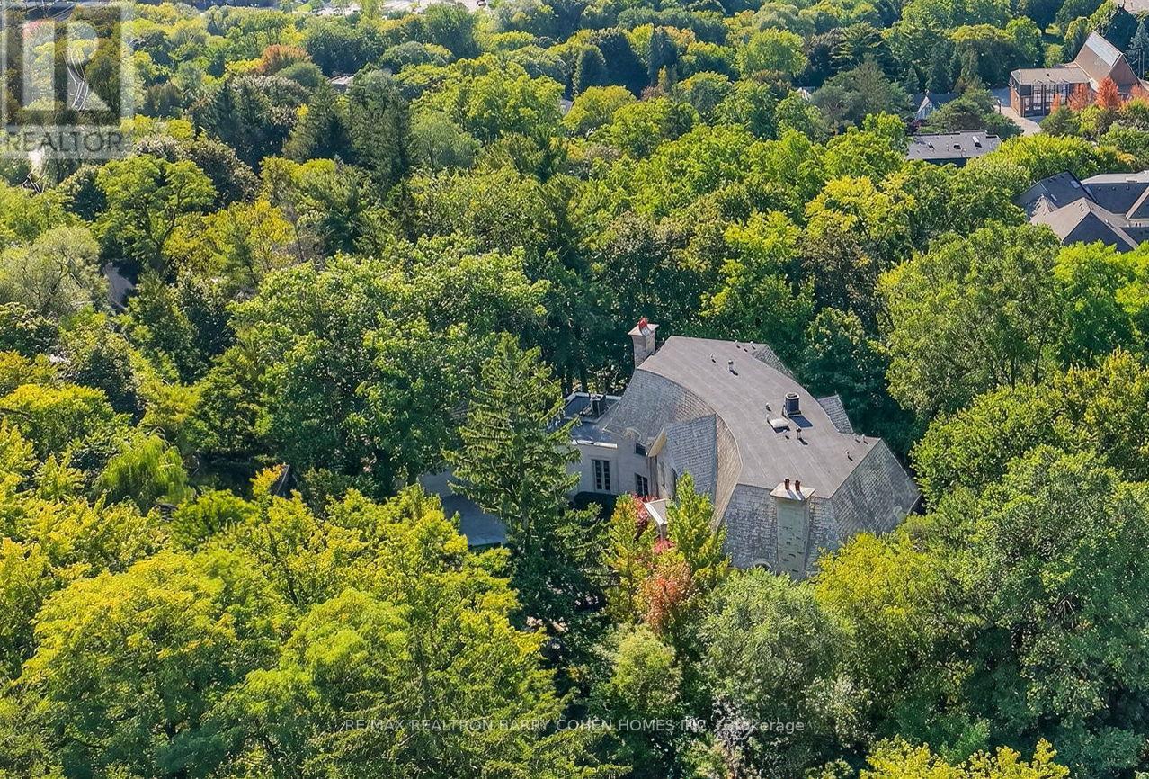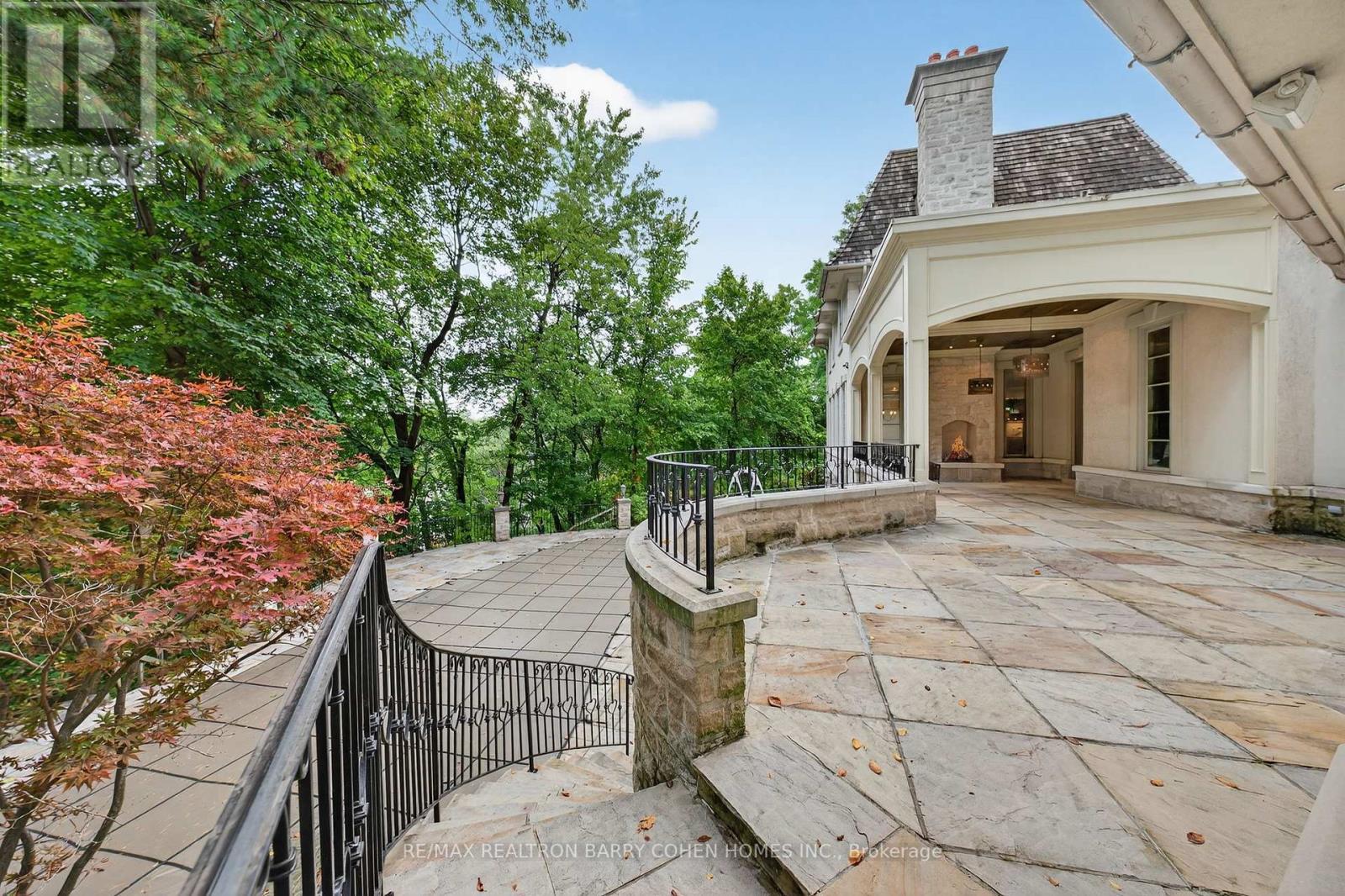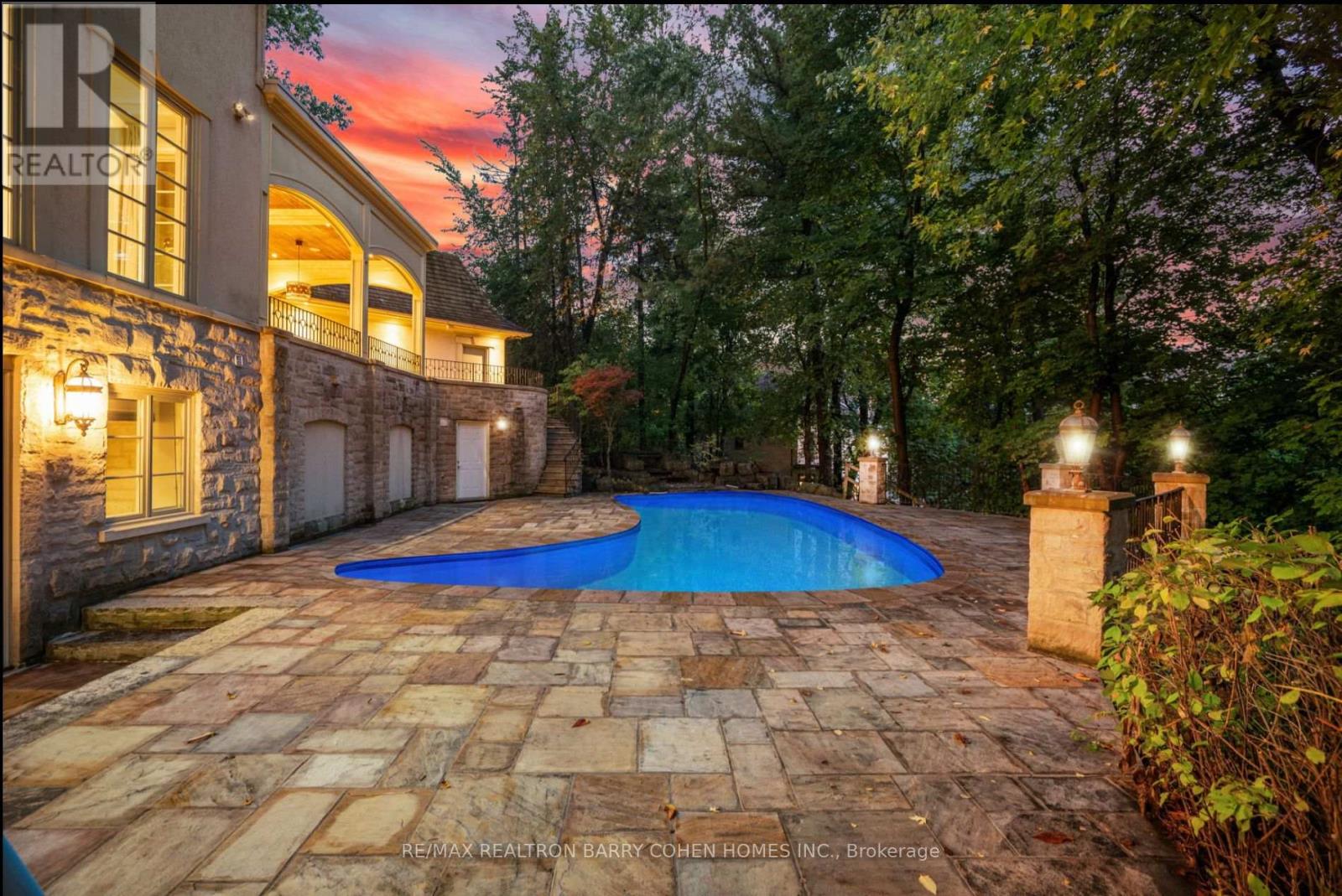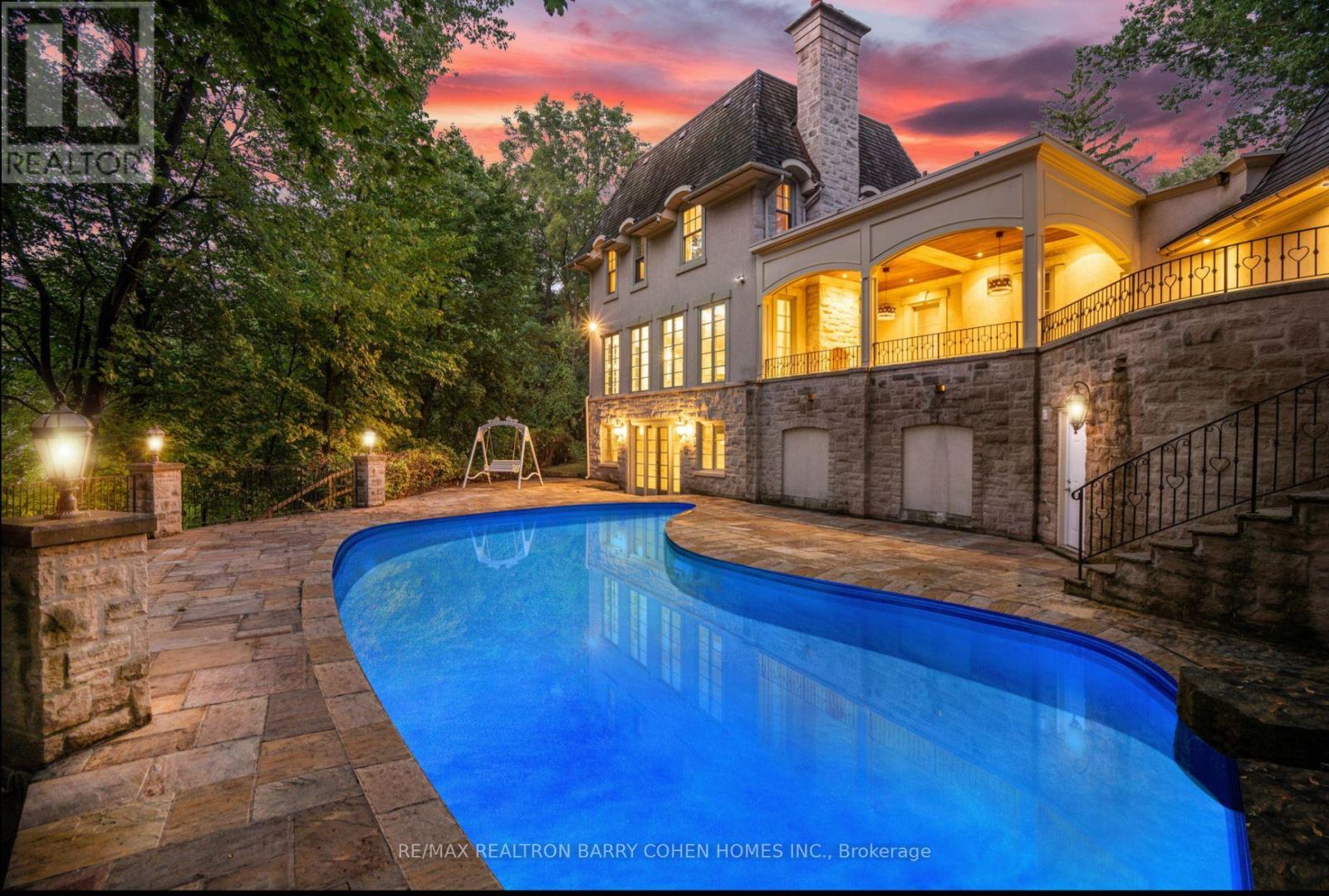 Backs Onto Ravine! Perched gracefully at the highest point of Hoggs Hollow, this French Château inspired masterpiece sits on a spectacular 239.08 x 207.81 ft ravine lot (approx. 1.14 acres). Designed by Dee Dee Taylor Hannah and built by award-winning builder Michael Rossini, this timeless stone estate offers over 10,000 sq.ft. of luxurious living space, blending European elegance with modern comfort. The homes distinctive curved and symmetrical design showcases architectural artistry rarely seen today. Featuring 4 bedrooms with ensuites, 9 washrooms, and a 3-car garage with a circular driveway accommodating up to 15 cars, all principal rooms face west, overlooking the serene ravine. A grand marble foyer, curved hallways, and custom millwork opens to elegant living and dining rooms that walk out to the ravine and garden. Two libraries on main floor, five fireplaces, built-in speakers, 10-ft ceilings, and hardwood floors throughout. The gourmet kitchen with double granite islands and an open-concept family room with motorized curtains creates a warm and inviting space for entertaining.Step out to a 700 sq.ft. patio with outdoor fireplace and panoramic ravine views. The primary suite features a lavish 7-piece ensuite, his & her walk-in closets, and heated bathroom floors. The walk-out lower level wth heated floors includes a home theatre, wine cellar, sauna, wet bar, nanny/guest ensuite, and a recreation room with fireplace opening directly to the backyard oasis.The heated concrete pool with cascading waterfall, framed by mature trees, creates a private, resort-like retreat. A rare offering combining elegance, privacy, and tranquility, just moments from the Granite Club, top private schools (Crescent, TFS, Havergal, UCC, BSS), fine dining, and Rosedale & Don Valley Golf Clubs.A true statement of taste, craftsmanship, and enduring luxury in one of Torontos most prestigious enclaves. (id:51158)