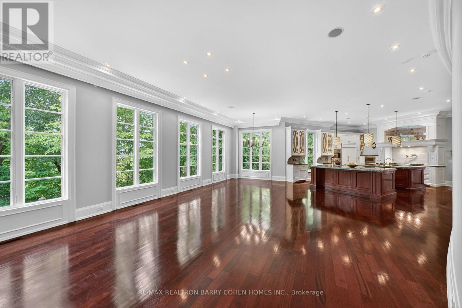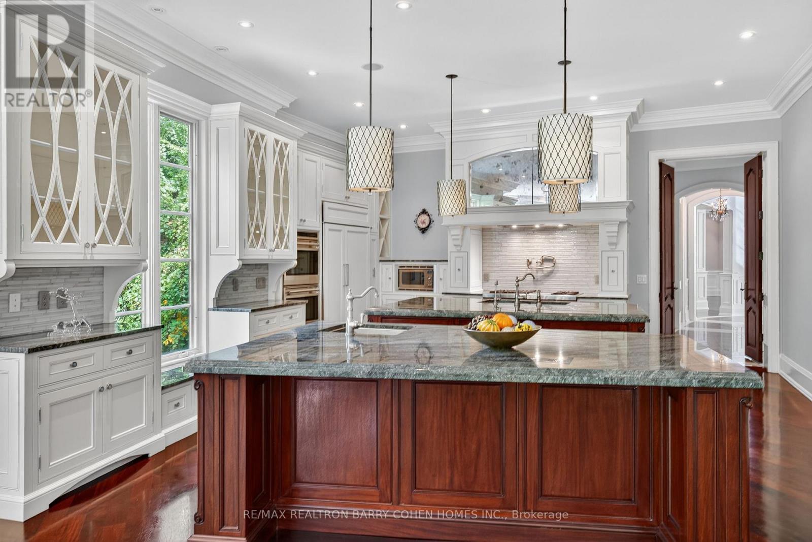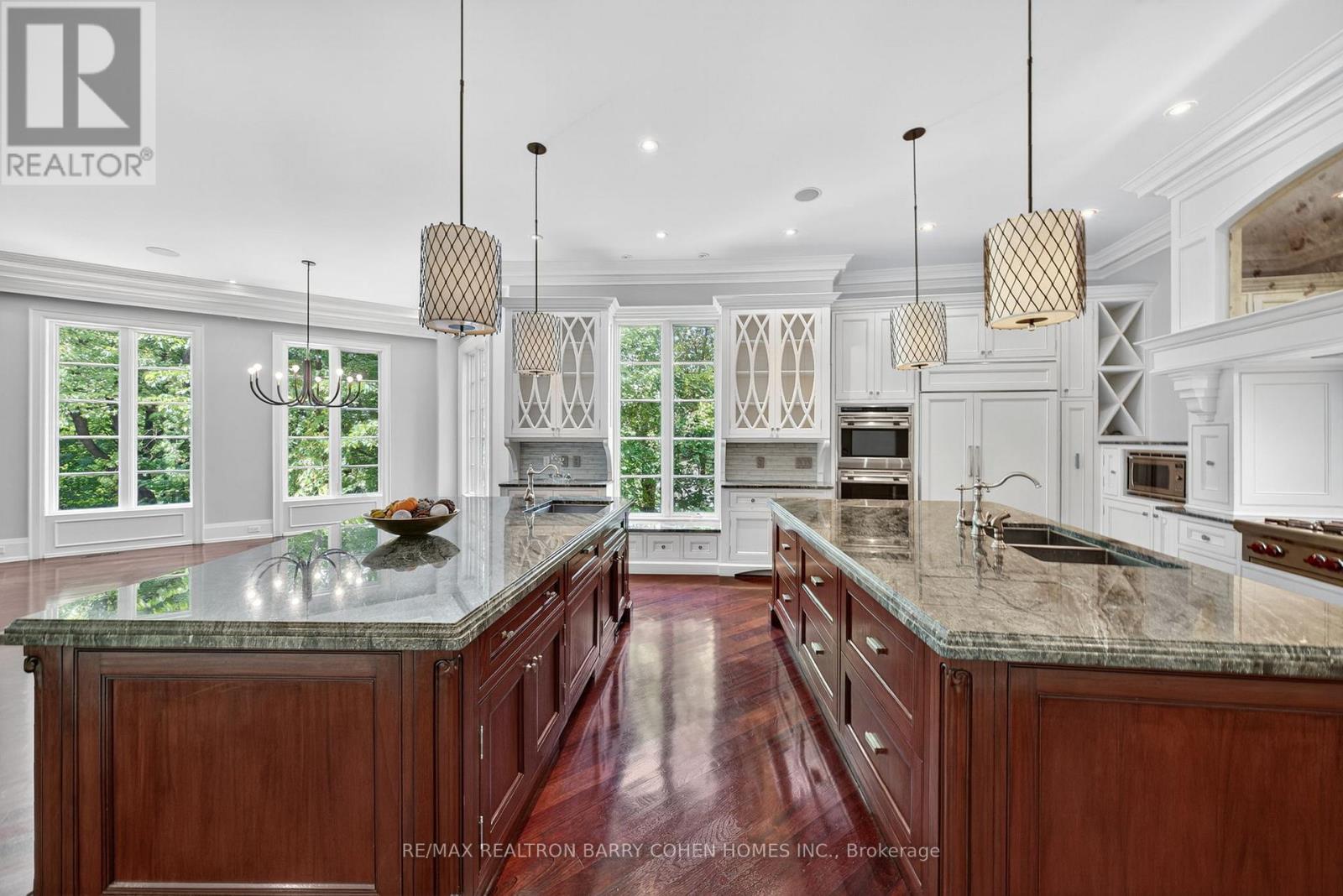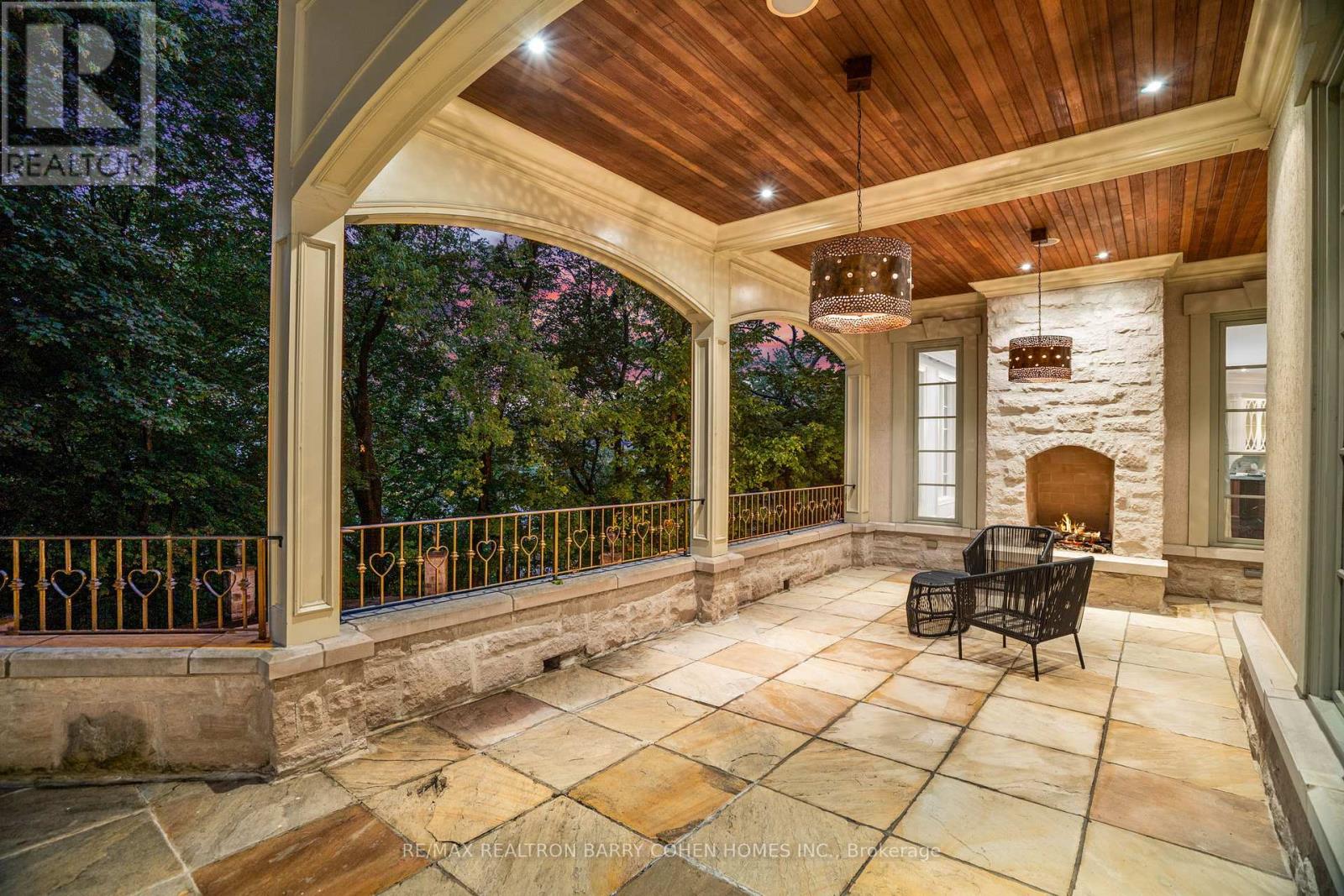 Backs Onto Ravine! Perched gracefully at the highest point of Hoggs Hollow, this French Château inspired masterpiece sits on a spectacular 239.08 x 207.81 ft ravine lot (approx. 1.14 acres). Designed by Dee Dee Taylor Hannah and built by award-winning builder Michael Rossini, this timeless stone estate offers over 10,000 sq.ft. of luxurious living space, blending European elegance with modern comfort. The homes distinctive curved and symmetrical design showcases architectural artistry rarely seen today. Featuring 4 bedrooms with ensuites, 9 washrooms, and a 3-car garage with a circular driveway accommodating up to 15 cars, all principal rooms face west, overlooking the serene ravine. A grand marble foyer, curved hallways, and custom millwork opens to elegant living and dining rooms that walk out to the ravine and garden. Two libraries on main floor, five fireplaces, built-in speakers, 10-ft ceilings, and hardwood floors throughout. The gourmet kitchen with double granite islands and an open-concept family room with motorized curtains creates a warm and inviting space for entertaining.Step out to a 700 sq.ft. patio with outdoor fireplace and panoramic ravine views. The primary suite features a lavish 7-piece ensuite, his & her walk-in closets, and heated bathroom floors. The walk-out lower level wth heated floors includes a home theatre, wine cellar, sauna, wet bar, nanny/guest ensuite, and a recreation room with fireplace opening directly to the backyard oasis.The heated concrete pool with cascading waterfall, framed by mature trees, creates a private, resort-like retreat. A rare offering combining elegance, privacy, and tranquility, just moments from the Granite Club, top private schools (Crescent, TFS, Havergal, UCC, BSS), fine dining, and Rosedale & Don Valley Golf Clubs.A true statement of taste, craftsmanship, and enduring luxury in one of Torontos most prestigious enclaves. (id:51158)