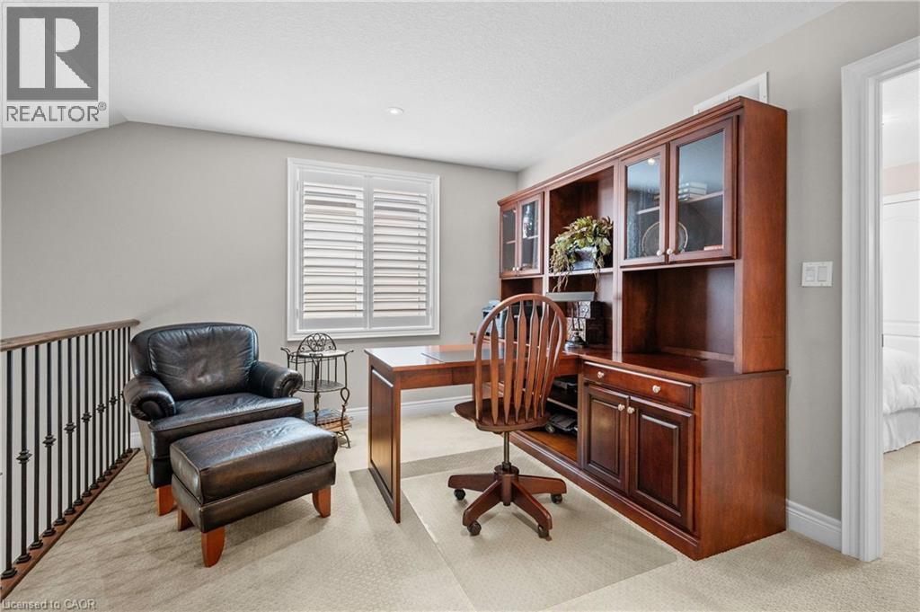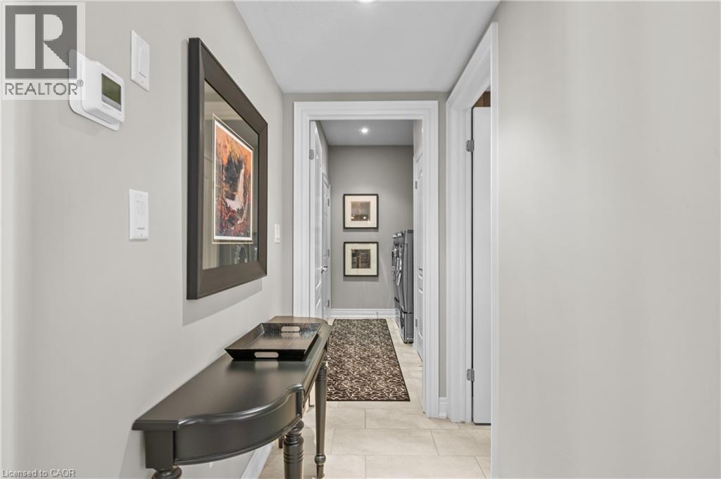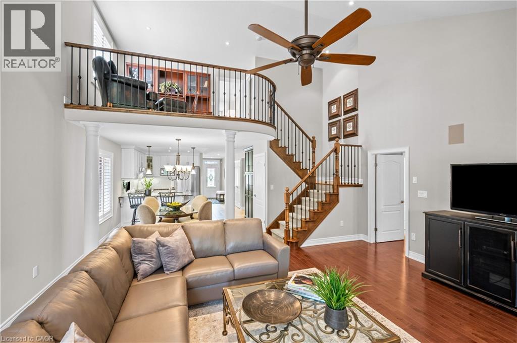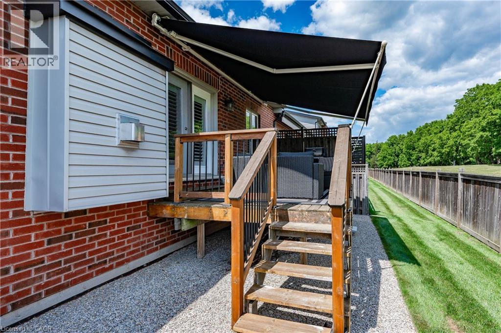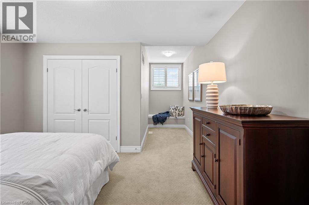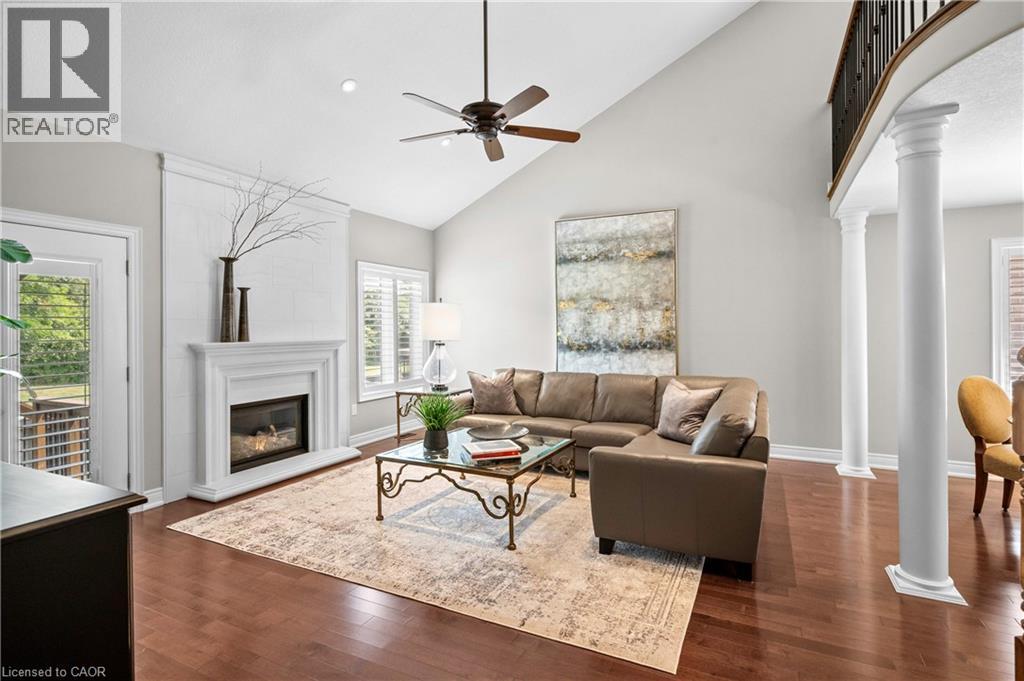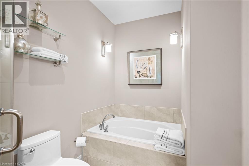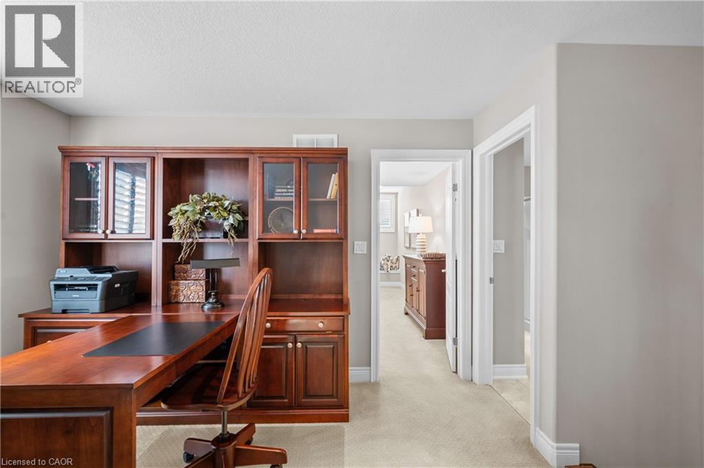Welcome to The Bungalows of Ancaster South - an exclusive enclave of executive homes tucked away in one of Ancasters most desirable locations. Built by Starward Homes in '12, this immaculate end-unit bungaloft offers 1993 sq ft (above grade), 2 bdrms, 2.5 baths, & the rare advantage of no immediate rear neighbours. A stone entrance & private drive off the main road lead into this meticulously maintained community. The homes striking facade of red brick, stone, & stucco is complemented by a 2 car grg w/ inside entry & 2 add surface parking spots. Step inside through the elegant front door w/ a transom window into a foyer that sets the tone for the rest of the home. The form din rm w/ crown moulding offers the perfect space for entertaining. The open-concept main lvl feat a bright kitch w/ timeless white cabinetry (including bonus dark pantry cabinetry), granite countertops, S/S app, undermount lighting, & breakfast bar seating for 3+. A dinette sits off to the side, framed by circular columns. The liv rm impresses w/ vaulted ceil, a gas FP w/ a cast stone surround & associated mantel, and French drs leading to an oversized raised deck - complete w/ Sunbrella awning for added shade. The main lvl primary bdrm incl crown moulding, a 4-pc spa-like ensuite w/ corner glass shower, soaker tub, granite vanity, & walk-in closet. The main-lvl laund & powder rm add convenience. Upstairs, the loft space overlooks the liv rm & is perfect as a home office, den, or other multi-purpose space. A lrg 2nd bdrm w/ a bonus reading nook & a 3-pc bath completes the upper lvl. Add feat: hrdwd flrs, Cali shutters, rounded drywall corners, elegant lighting, fresh paint, c-vac, updated furn & c-air (21), & an unspoiled bsmt w/ 2 oversized windows & a bath rough-in. Enjoy turn-key living w/ fees incl building insur, ext maint, parking, & access to common elements. Min to parks, shopping, restaurants, golf, highways, & top schools, this home offers upscale living w/ unbeatable amen. (id:51158)