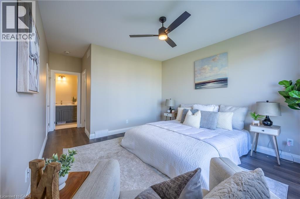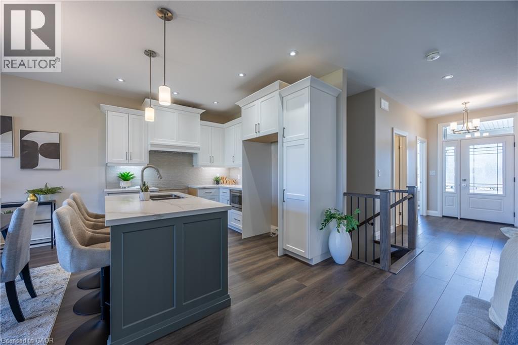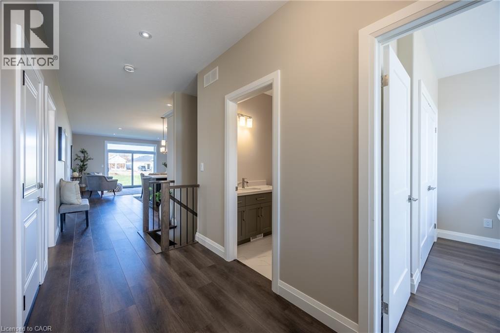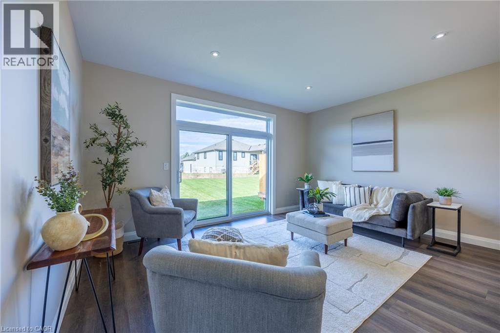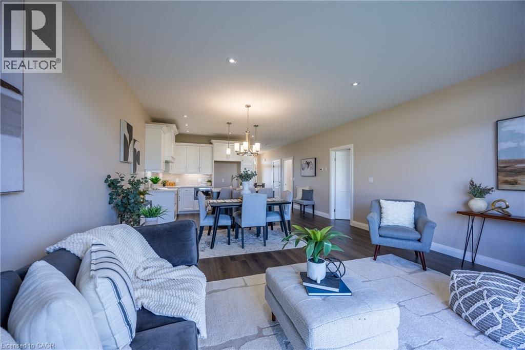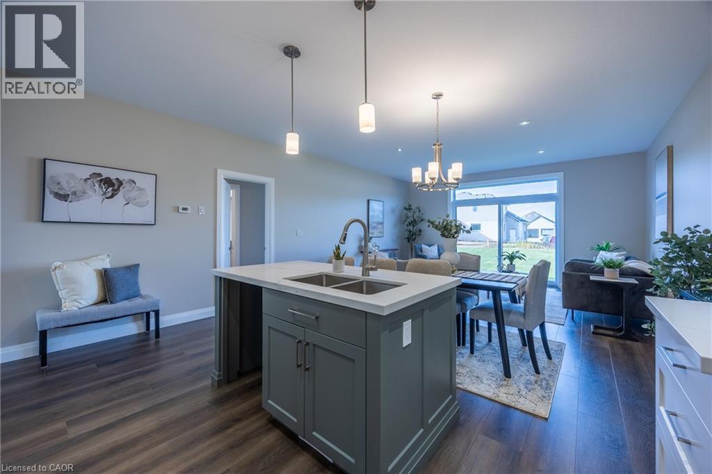 Beautiful custom-built semi-detached home offering 1,250 sq. ft. of modern main-floor living in the heart of Delhi. This thoughtfully designed 2-bedroom, 2-bathroom layout features an open-concept kitchen, dining, and living area—ideal for everyday living and entertaining. High-end standard finishes include quartz countertops, quality wood cabinetry, and a spacious island with seating. Neutral wood-tone luxury vinyl plank flooring flows seamlessly throughout, complemented by modern lighting and a bright, airy feel. The primary bedroom offers a walk-in closet and a private 4-piece ensuite. Additional features include a single-car garage with automatic door opener and hot/cold water taps. Immediate possession available. Appliance package available. A fantastic opportunity to own a new home in a growing community with small-town charm. (id:51158)