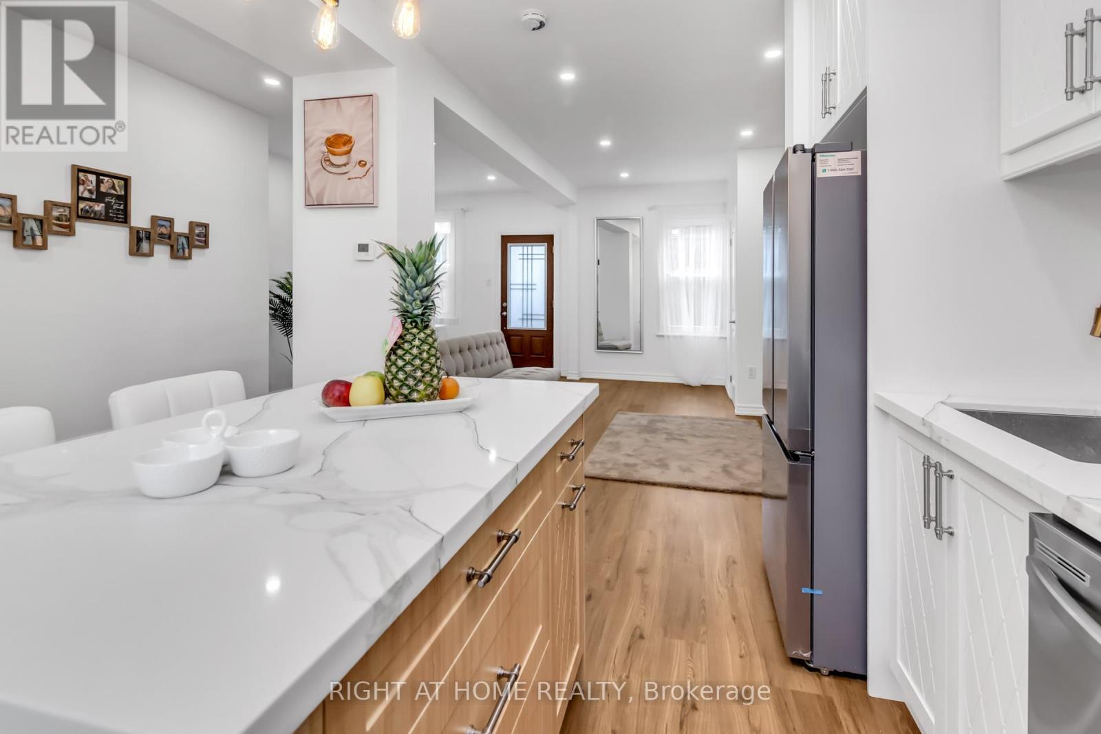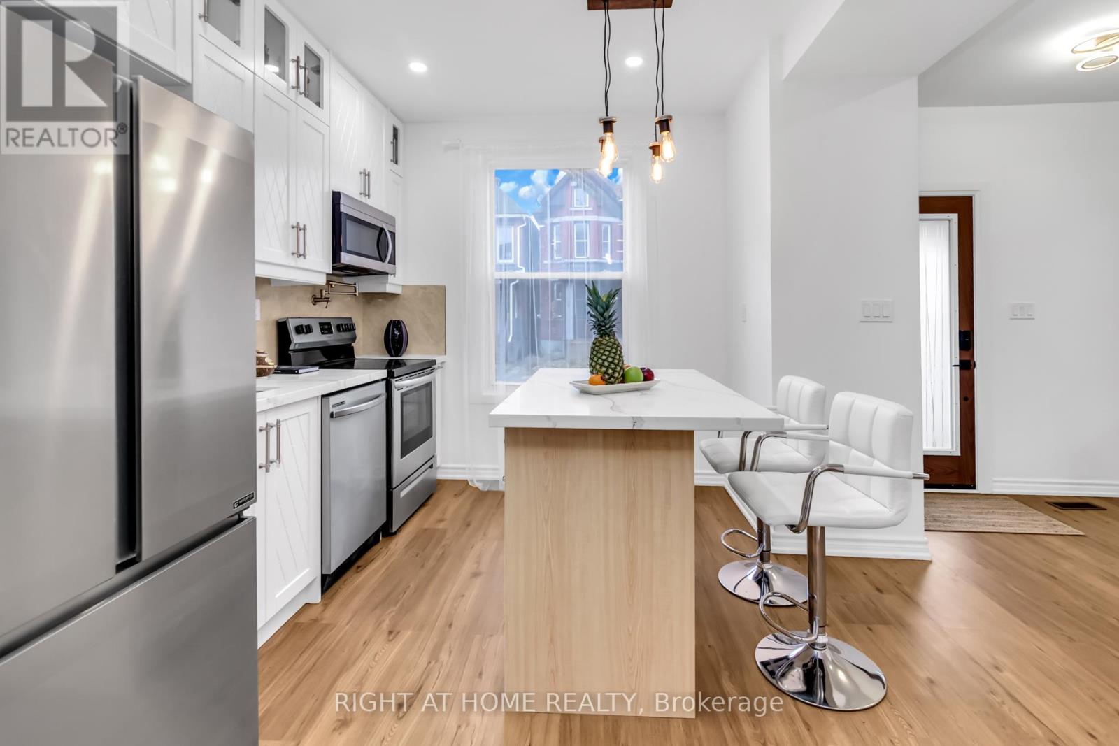 Move in and enjoy this brick home in the heart of a family-friendly neighbourhood in Hamilton. Fully renovated by an experienced team. Welcome to the open concept on the main floor with a tiled focal media wall with a 50-inch fireplace with abundant natural light, offering joy and relaxation for the whole family. Brand new modern kitchen/quartz counter and island with all soft-close doors and drawers in all fine cabinetry/top display cabinet with interior lights/under cabinet lights spice cabinets/two-compartment pull-out garbage bin/above stove pot filler/tiled backsplash. LED pot lights throughout the house, entrance closet, and 2-piece powder room on the main floor. Large Master bedroom complemented by an ensuite feature walk-in closet with custom storage, feature wall, ensuite luxury bathroom with glass enclosed shower with rainfall shower panel, linear drain, double sink vanity with quartz counter, LED mirror and HEATED floor. The 2nd bathroom has a high-profile soaker tub with a fall shower head and medicine mirror cabinets. Private backyard ideal for BBQs, pets or garden retreat. The basement is ready to be transformed into a rec room, gym or office. A blank canvas to add living space and future value! (id:51158)