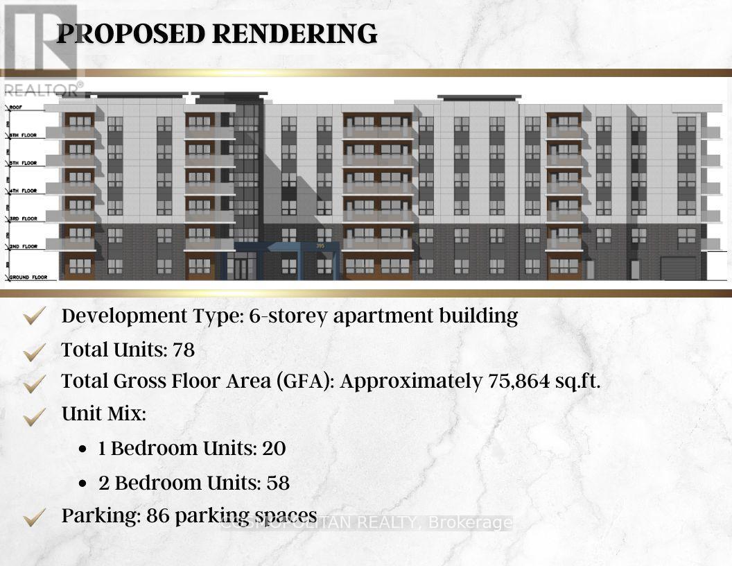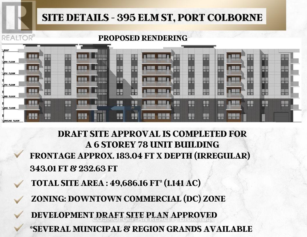 Attention Builders! Ready-to-build 78-unit apartment site in booming Niagara. Draft approved, CMHC Financing Eligible, minutes to downtown, beaches, and new $3.6B hospital. Rare $32K/ per door opportunity- act fast! An exceptional opportunity for builders and developers to secure a fully draft site plan approved apartment project in Port Colborne, one of Niagara's fastest-growing communities. This 1.14-acre downtown commercial site is approved for a 6-storey, 78-unit building (approx. 76,000 sq.ft. GFA) with 86 parking spaces and a modern mix of 1- and 2-bedroom layouts. Qualifying for CMHC financing, the project allows investors to maximize leverage and long-term stability. Port Colborne is on the rise, with nearly 25% population growth projected by 2031, the new $3.6B South Niagara Hospital opening in 2028, and a booming tourism economy with 70+ cruise ship visits in 2025. At just $2,500,000 (~$32,051/door), this rare, shovel-ready site offers approvals, incentives, and unmatched growth potential in one package. (id:51158)