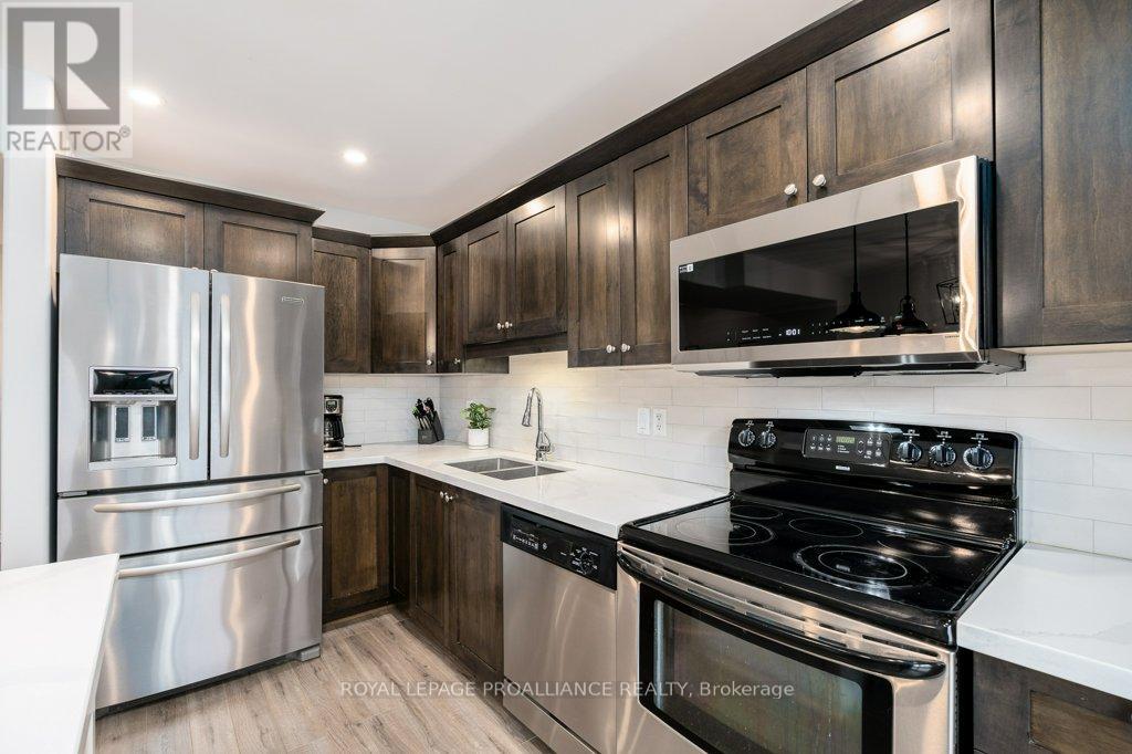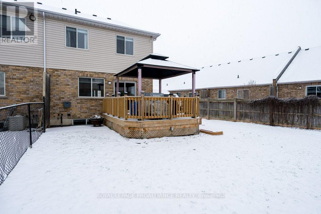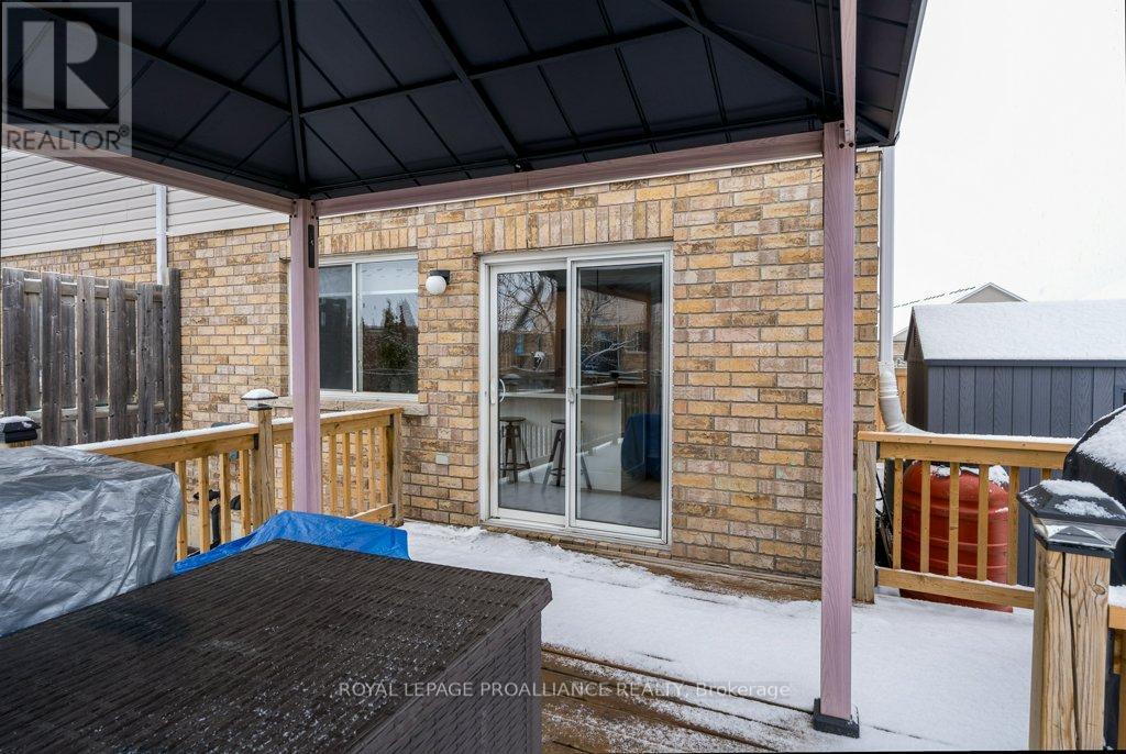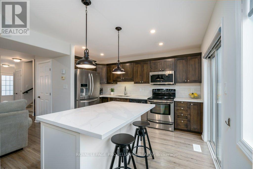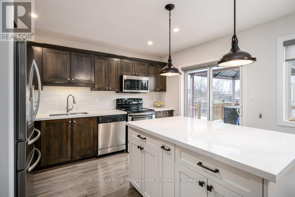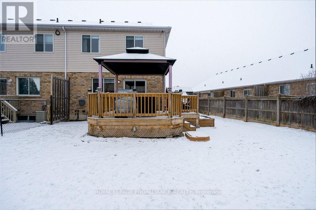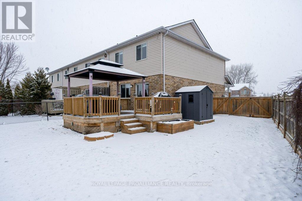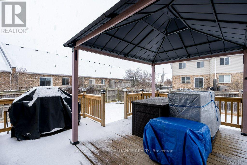 Welcome to this beautifully updated end-unit two-storey townhome located in the heart of Belleville. This bright, open-concept home features a stunning updated kitchen complete with quartz countertops, a new large centre island showcasing elegant pendant lighting, stylish new backsplash and complemented by new pot lighting. Upstairs, you'll find three spacious bedrooms, including a generous primary suite with a walk-in closet, along with a fully renovated bathroom and immaculate walnut hardwood flooring that adds warmth and sophistication. The unfinished basement offers potential for a home gym, additional living space, and even plenty of room for storage. Step outside to your fully fenced-in backyard oasis featuring a newly installed expansive interlocking patio (starting from the front home entrance) a large resurfaced deck (natural gas BBQ hook up available) with gazebo, with west-facing exposure, perfect for soaking in those breathtaking sunsets. Additional upgrades: Shingles 2023, new light switches, porcelain tile in the foyer and main bathroom. This move-in-ready home truly checks all the boxes and is waiting for you! (id:51158)