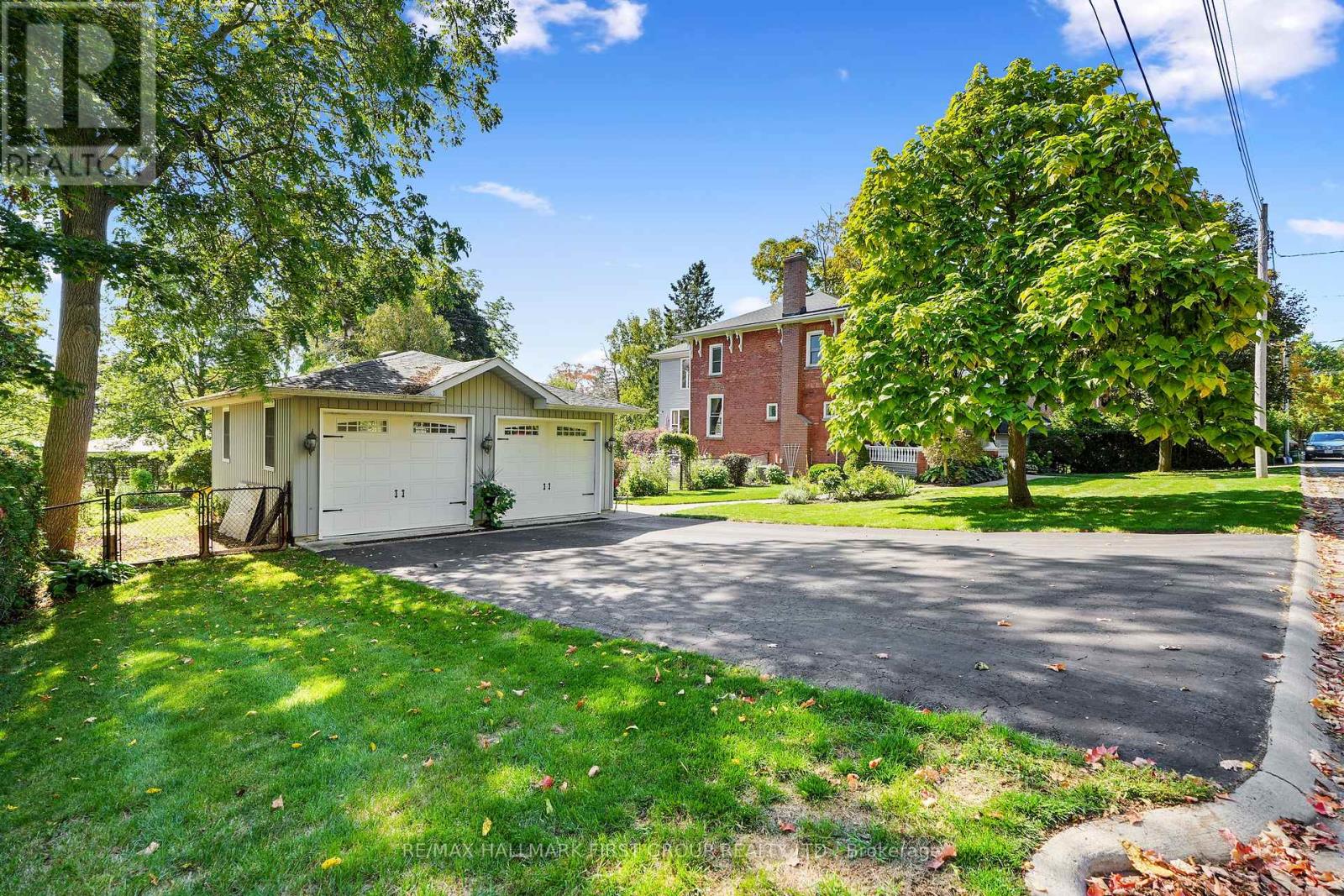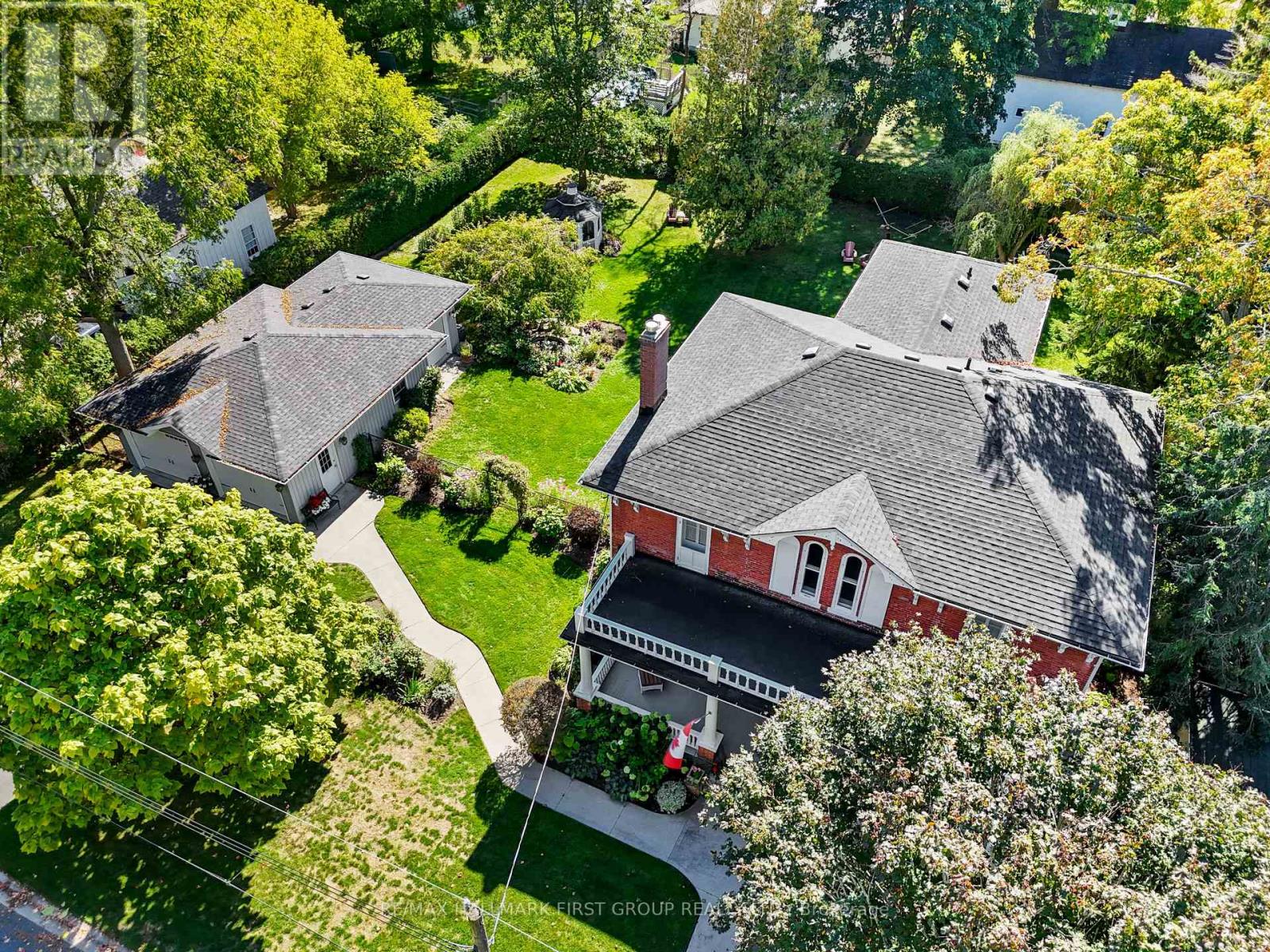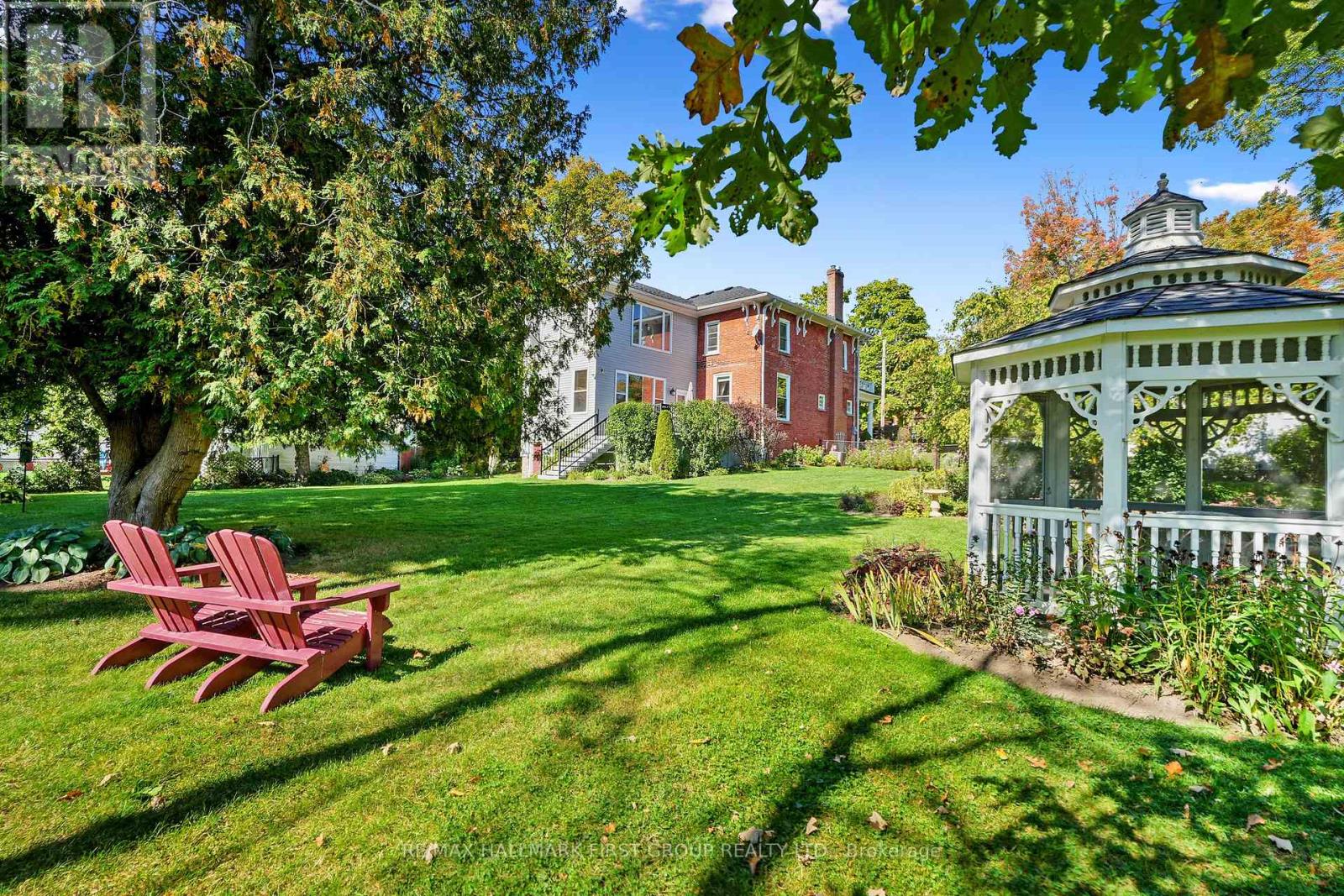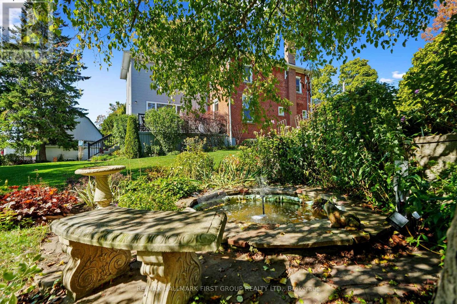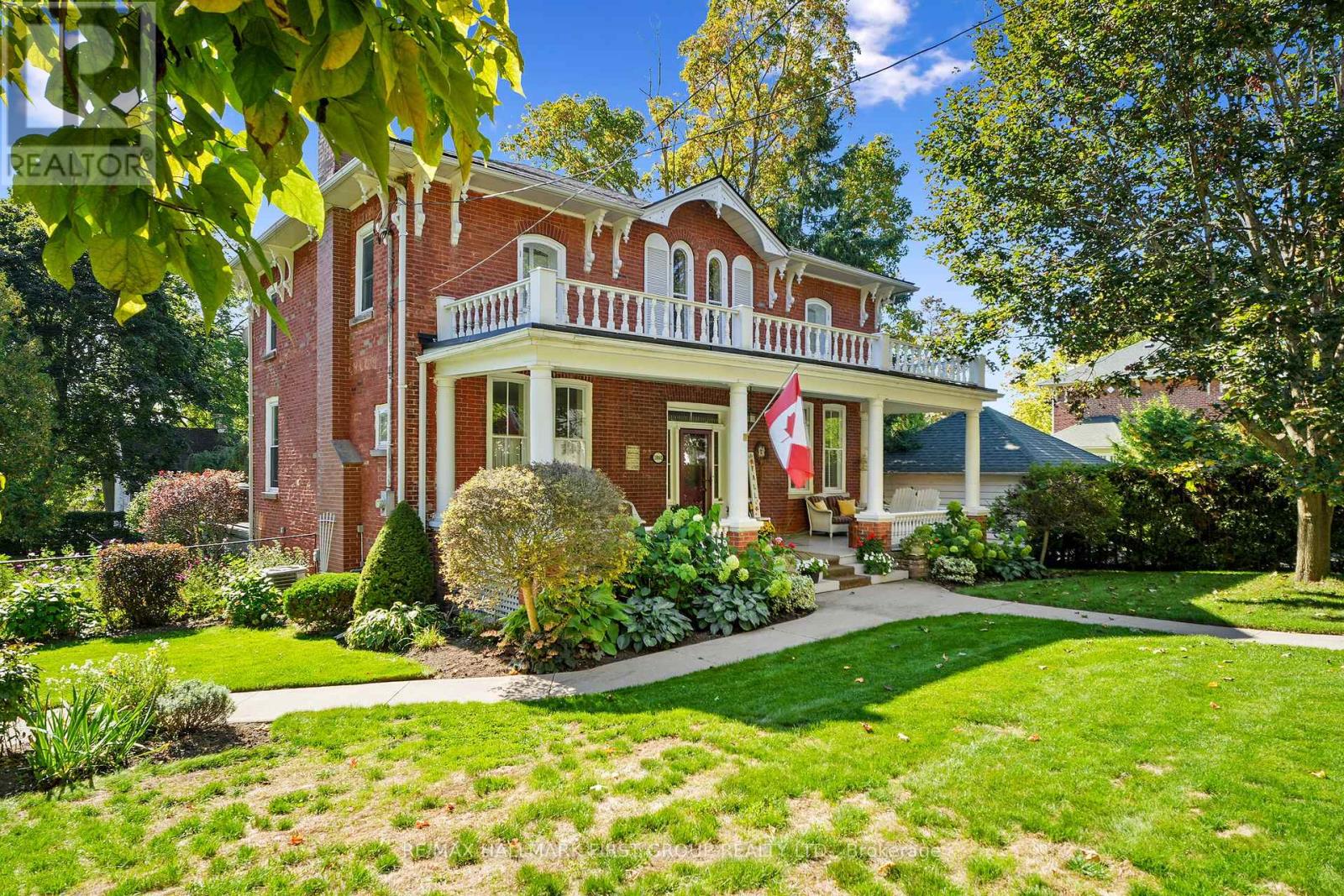 This character-filled two-storey red brick century home, circa 1860s, blends historic charm with generous living space and modern convenience. A covered front veranda, surrounded by meticulously maintained perennial gardens, sets the tone for the timeless elegance found throughout. Inside, the main floor showcases period details including extra-wide baseboards, detailed crown mouldings, and decorative ceiling coins. The sunlit front living room with fireplace flows seamlessly into the spacious formal dining room. A thoughtfully designed kitchen features a central island with pendant lighting and a vintage-inspired cooktop and oven, opening into an informal dining area. A bright family room with a walkout and bar area provides the perfect space for entertaining, complemented by a guest bathroom on this level. The upper floor is anchored by the primary suite, which features an en-suite bathroom and a walkout to a private balcony. Three additional bedrooms, a full bathroom with a separate tub and shower, plus a double vanity, and a cozy den or reading nook complete the layout. The lower level offers ample storage and a separate walkout to the backyard. Outdoors, discover a private retreat featuring a fully fenced yard, tranquil pond, screened wood gazebo, and spacious deck, perfect for alfresco dining. A detached four-car garage provides exceptional parking and storage. Located near schools, amenities, and offering easy access to Highway 2 and the 401, this historic gem is the perfect blend of character, comfort, and convenience. (id:51158)