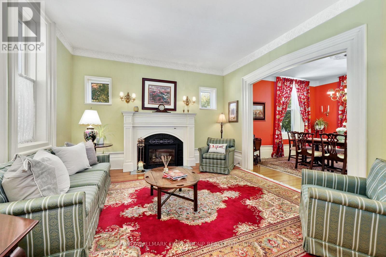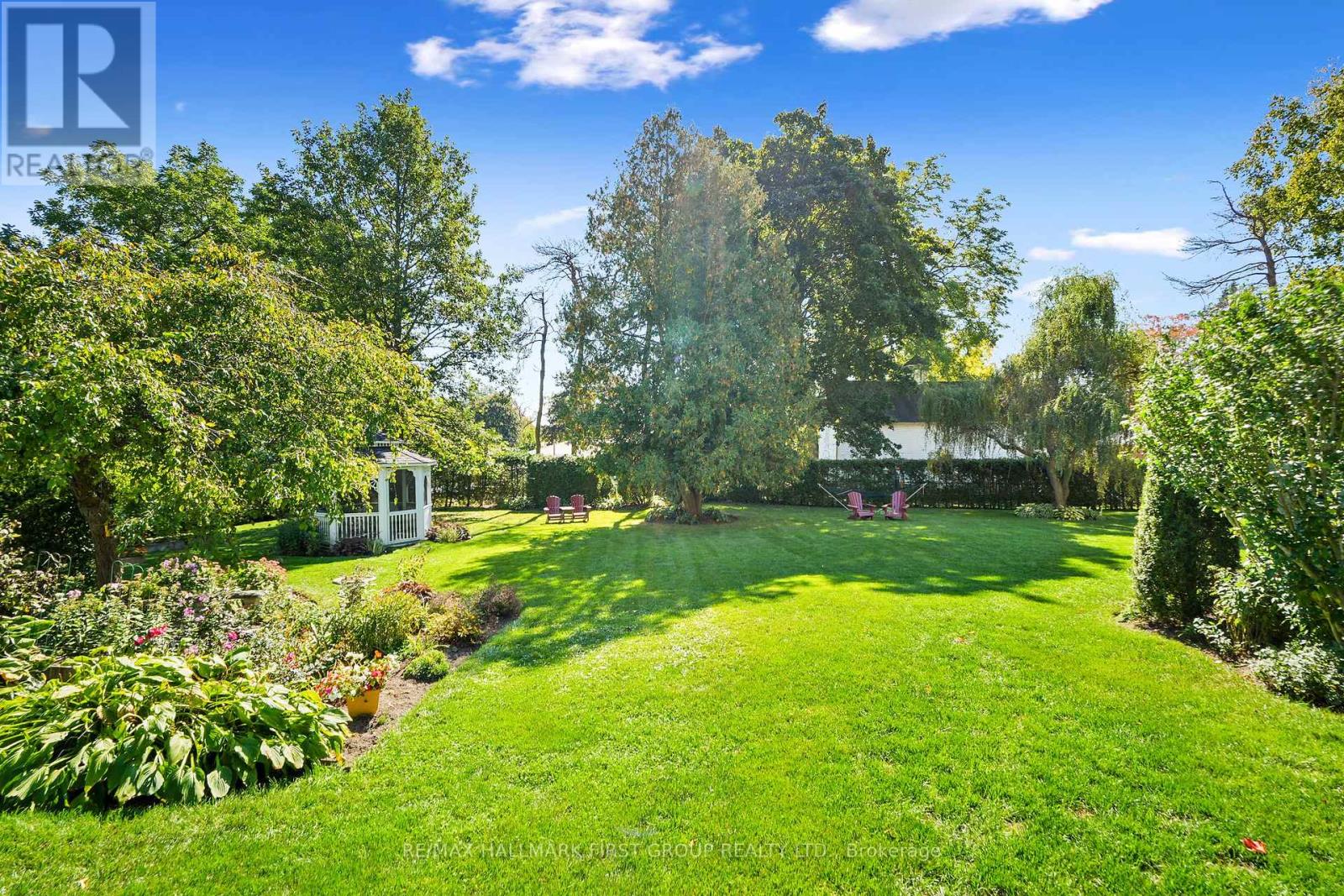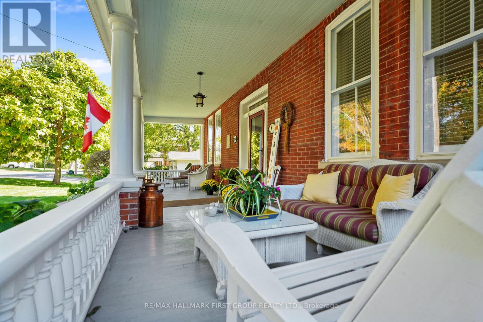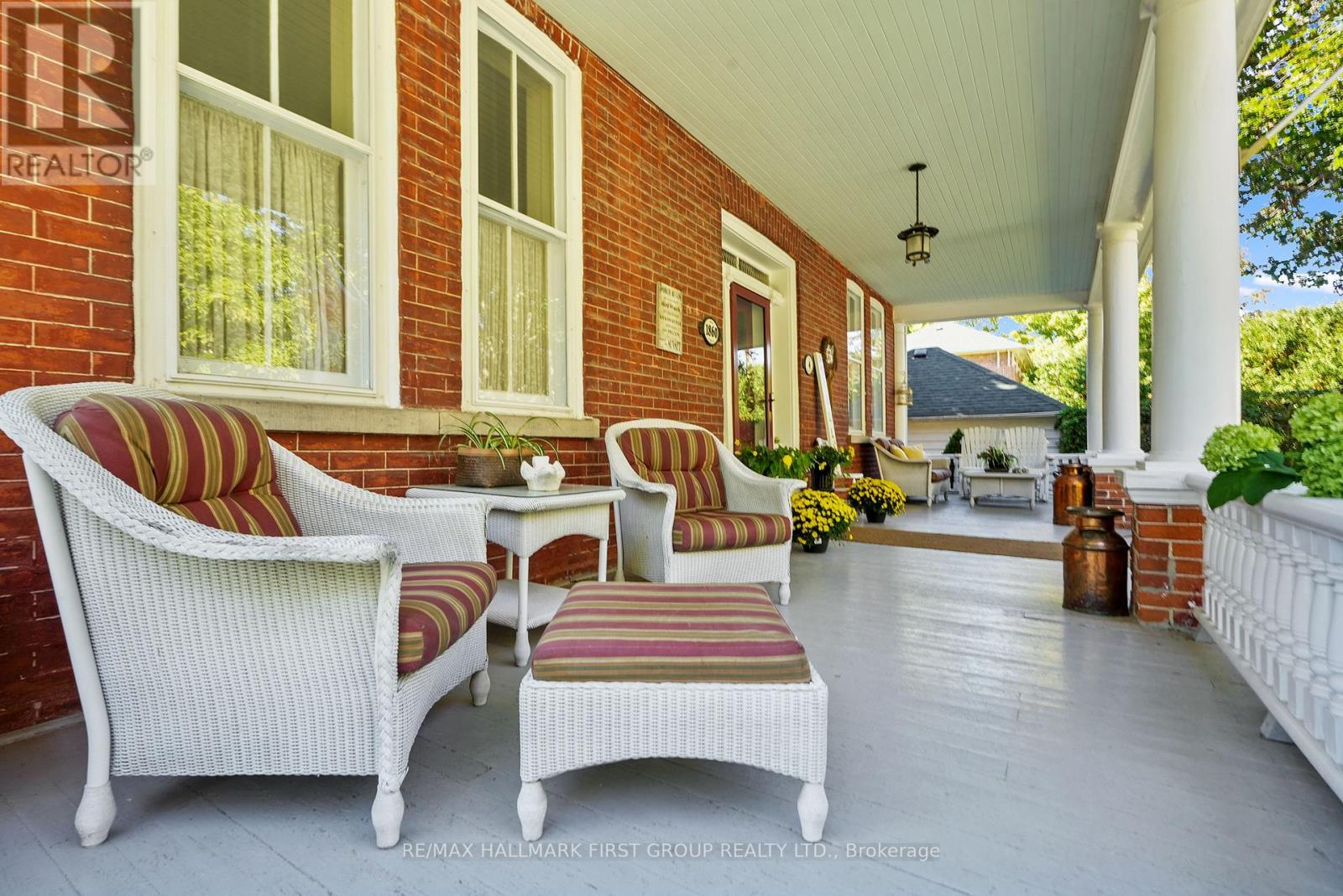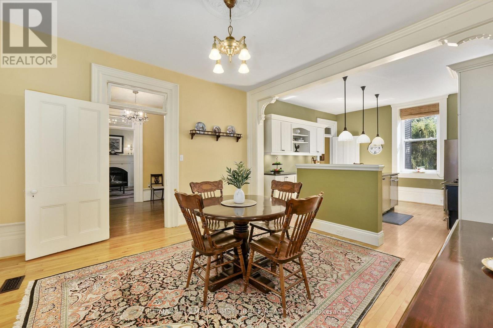 This character-filled two-storey red brick century home, circa 1860s, blends historic charm with generous living space and modern convenience. A covered front veranda, surrounded by meticulously maintained perennial gardens, sets the tone for the timeless elegance found throughout. Inside, the main floor showcases period details including extra-wide baseboards, detailed crown mouldings, and decorative ceiling coins. The sunlit front living room with fireplace flows seamlessly into the spacious formal dining room. A thoughtfully designed kitchen features a central island with pendant lighting and a vintage-inspired cooktop and oven, opening into an informal dining area. A bright family room with a walkout and bar area provides the perfect space for entertaining, complemented by a guest bathroom on this level. The upper floor is anchored by the primary suite, which features an en-suite bathroom and a walkout to a private balcony. Three additional bedrooms, a full bathroom with a separate tub and shower, plus a double vanity, and a cozy den or reading nook complete the layout. The lower level offers ample storage and a separate walkout to the backyard. Outdoors, discover a private retreat featuring a fully fenced yard, tranquil pond, screened wood gazebo, and spacious deck, perfect for alfresco dining. A detached four-car garage provides exceptional parking and storage. Located near schools, amenities, and offering easy access to Highway 2 and the 401, this historic gem is the perfect blend of character, comfort, and convenience. (id:51158)