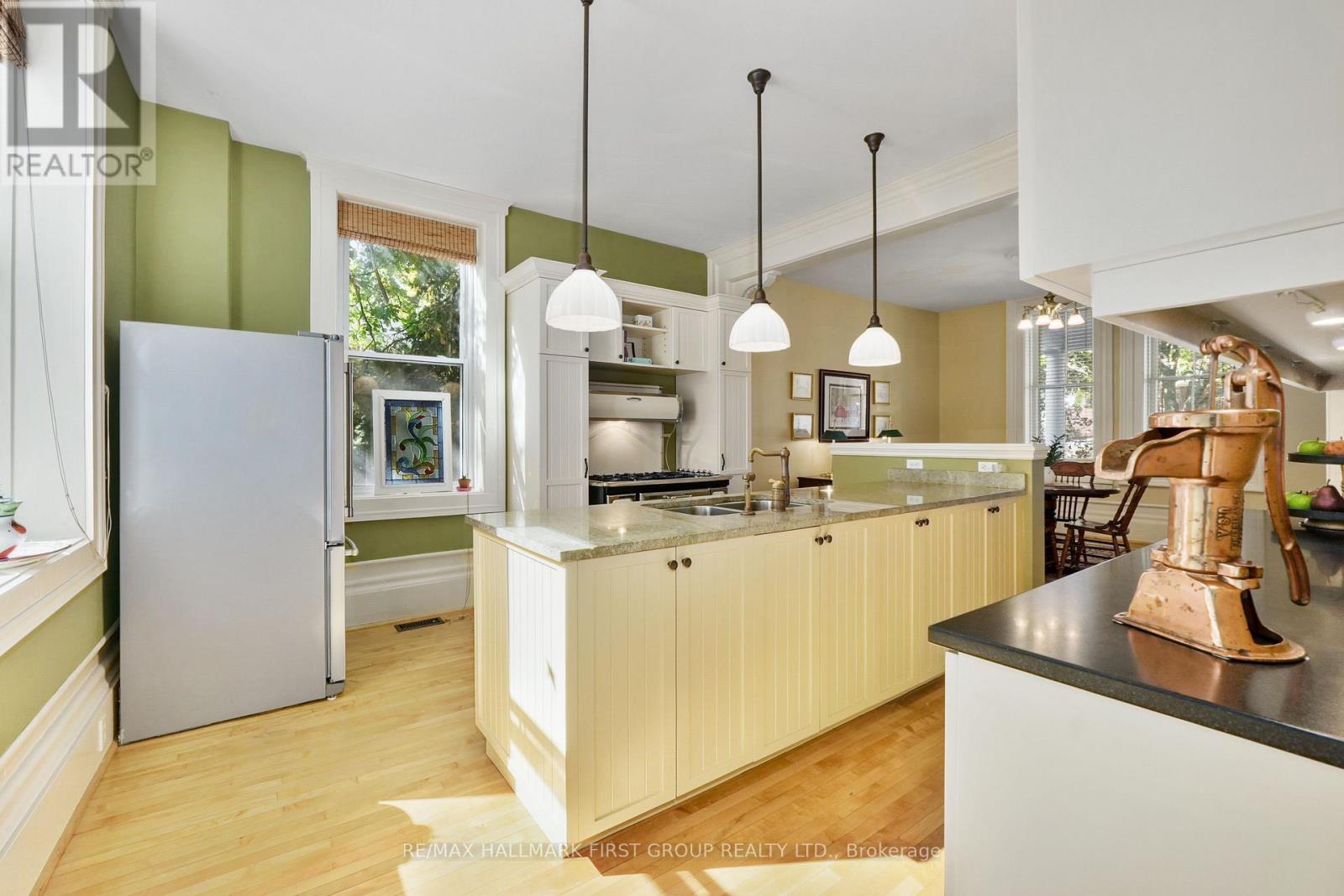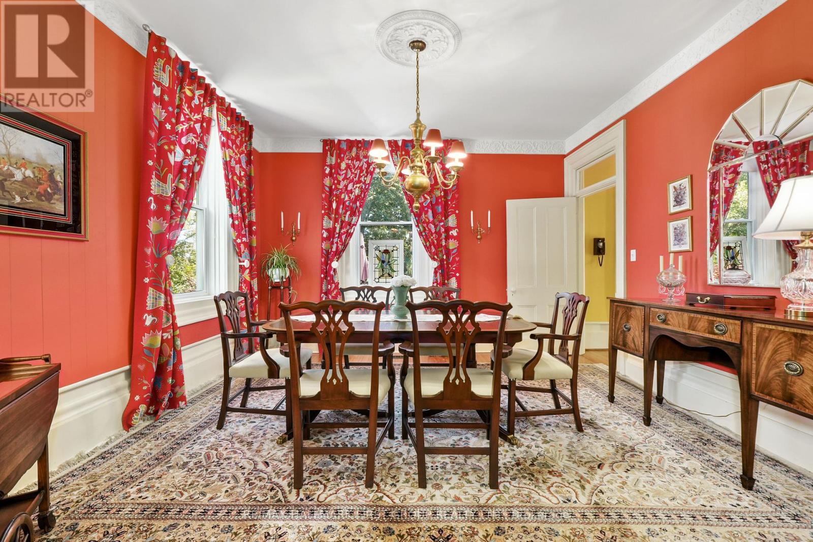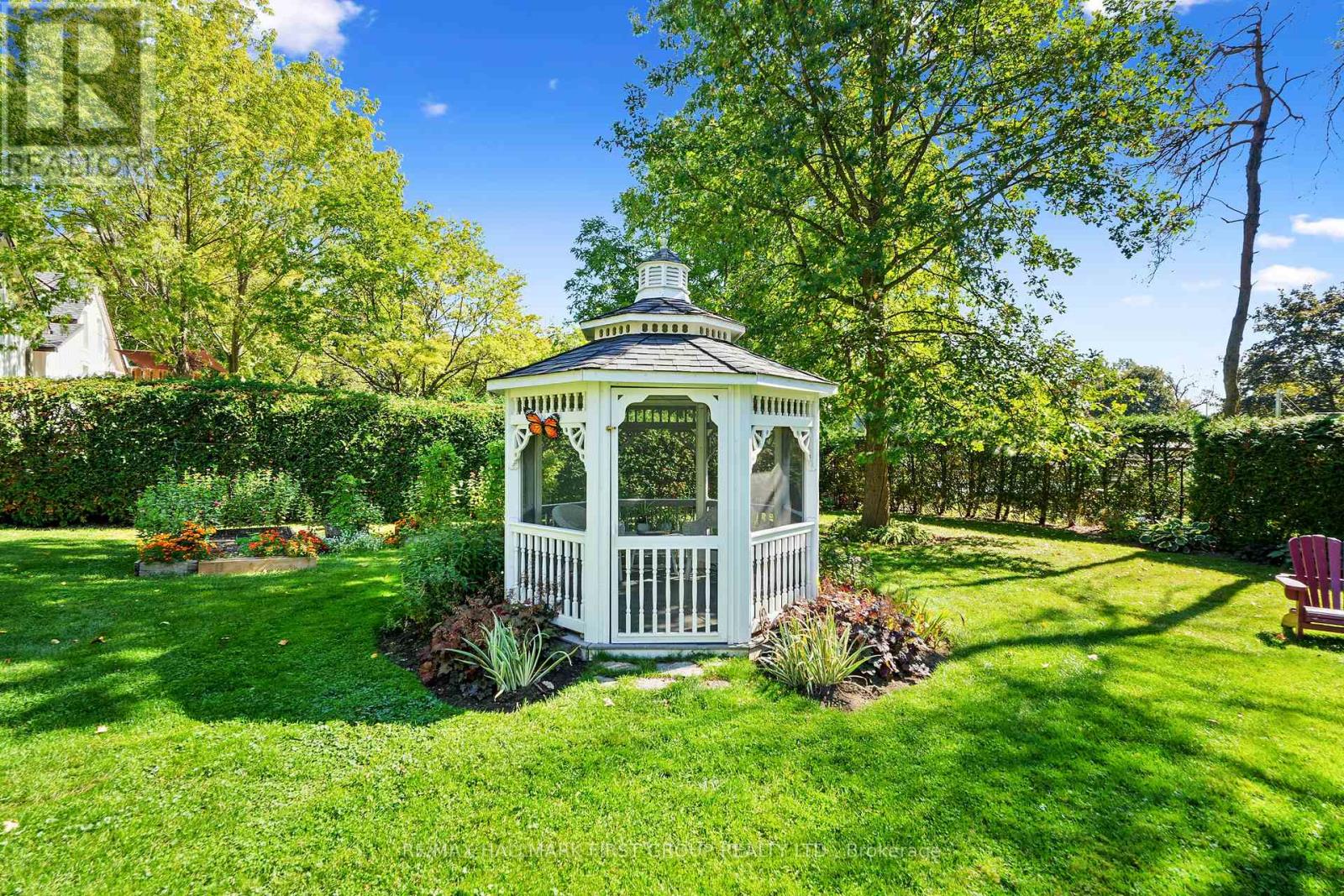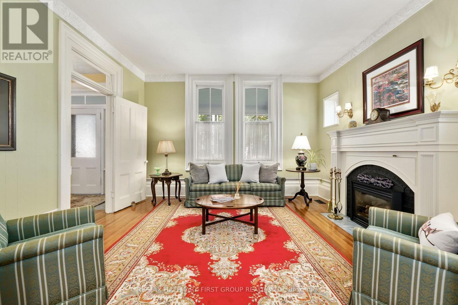 This character-filled two-storey red brick century home, circa 1860s, blends historic charm with generous living space and modern convenience. A covered front veranda, surrounded by meticulously maintained perennial gardens, sets the tone for the timeless elegance found throughout. Inside, the main floor showcases period details including extra-wide baseboards, detailed crown mouldings, and decorative ceiling coins. The sunlit front living room with fireplace flows seamlessly into the spacious formal dining room. A thoughtfully designed kitchen features a central island with pendant lighting and a vintage-inspired cooktop and oven, opening into an informal dining area. A bright family room with a walkout and bar area provides the perfect space for entertaining, complemented by a guest bathroom on this level. The upper floor is anchored by the primary suite, which features an en-suite bathroom and a walkout to a private balcony. Three additional bedrooms, a full bathroom with a separate tub and shower, plus a double vanity, and a cozy den or reading nook complete the layout. The lower level offers ample storage and a separate walkout to the backyard. Outdoors, discover a private retreat featuring a fully fenced yard, tranquil pond, screened wood gazebo, and spacious deck, perfect for alfresco dining. A detached four-car garage provides exceptional parking and storage. Located near schools, amenities, and offering easy access to Highway 2 and the 401, this historic gem is the perfect blend of character, comfort, and convenience. (id:51158)