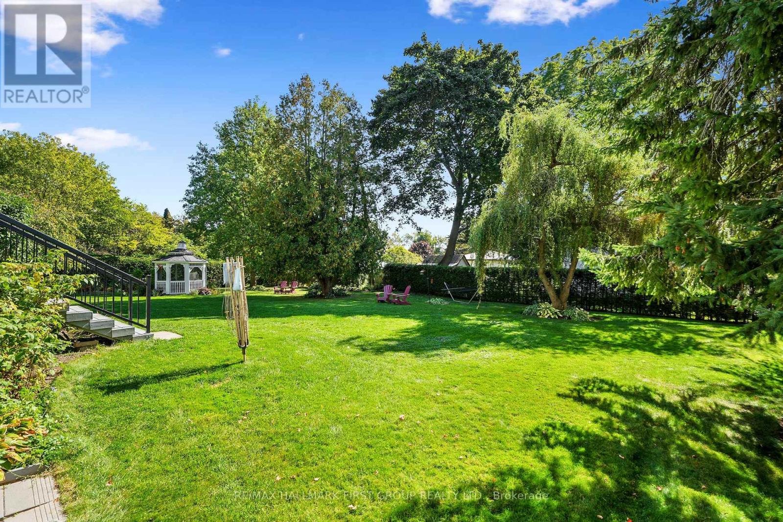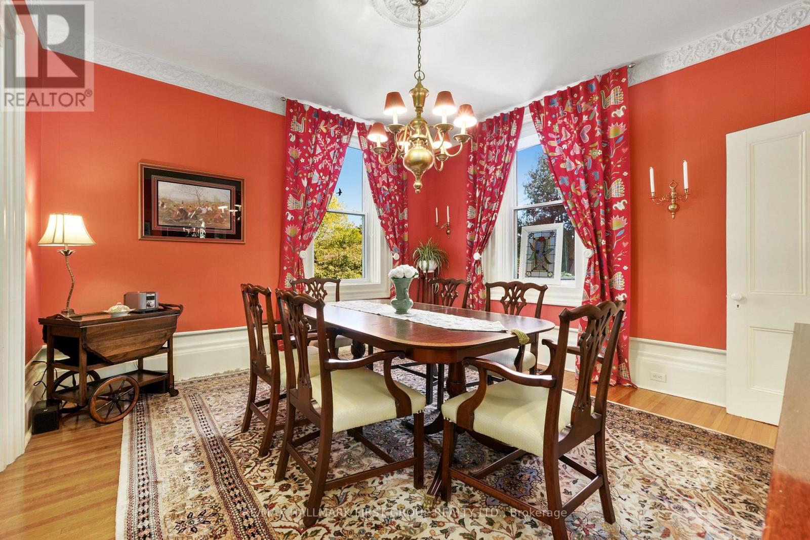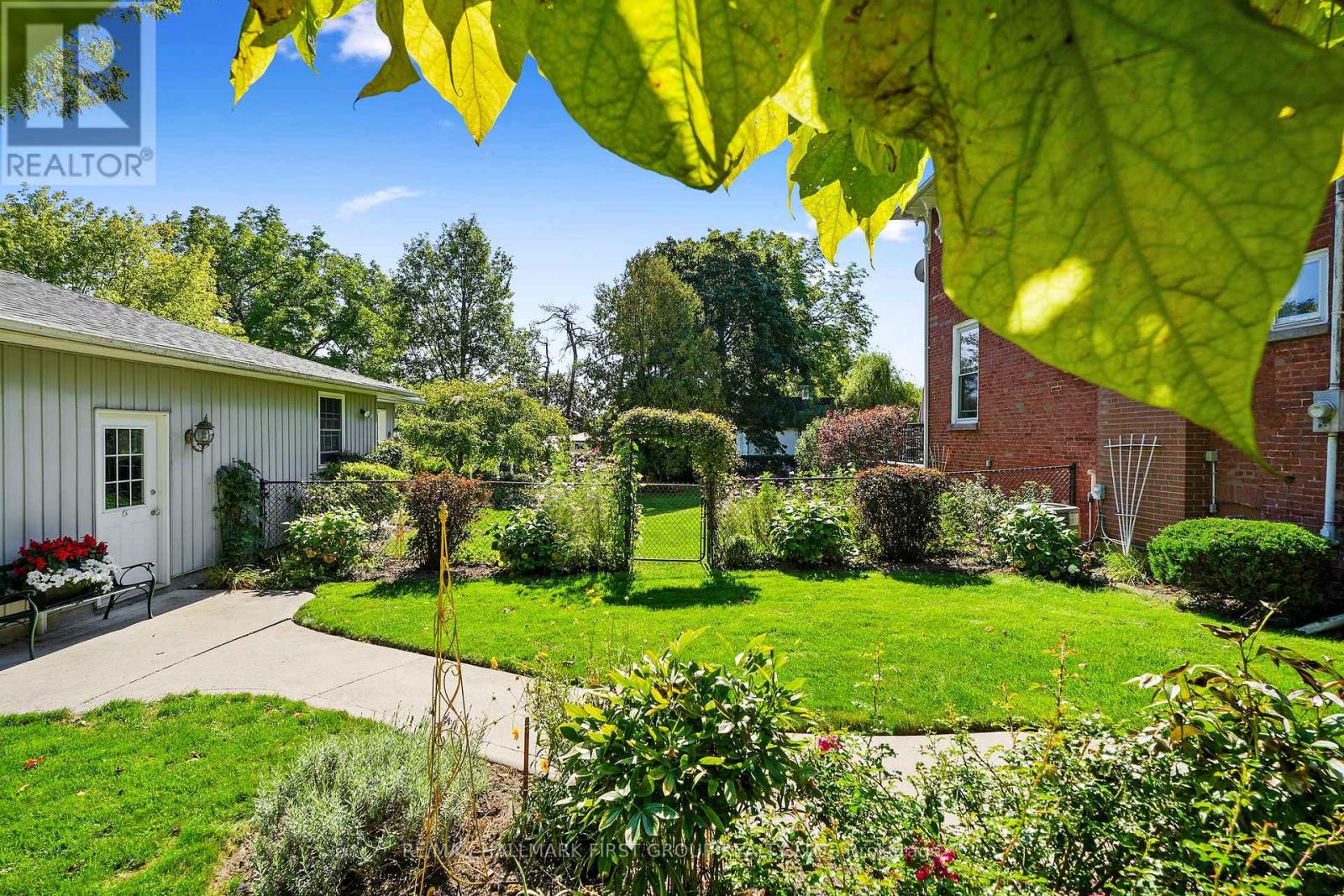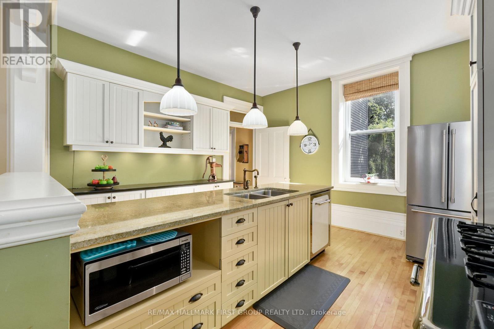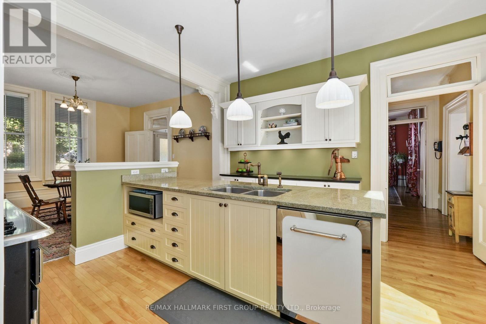 This character-filled two-storey red brick century home, circa 1860s, blends historic charm with generous living space and modern convenience. A covered front veranda, surrounded by meticulously maintained perennial gardens, sets the tone for the timeless elegance found throughout. Inside, the main floor showcases period details including extra-wide baseboards, detailed crown mouldings, and decorative ceiling coins. The sunlit front living room with fireplace flows seamlessly into the spacious formal dining room. A thoughtfully designed kitchen features a central island with pendant lighting and a vintage-inspired cooktop and oven, opening into an informal dining area. A bright family room with a walkout and bar area provides the perfect space for entertaining, complemented by a guest bathroom on this level. The upper floor is anchored by the primary suite, which features an en-suite bathroom and a walkout to a private balcony. Three additional bedrooms, a full bathroom with a separate tub and shower, plus a double vanity, and a cozy den or reading nook complete the layout. The lower level offers ample storage and a separate walkout to the backyard. Outdoors, discover a private retreat featuring a fully fenced yard, tranquil pond, screened wood gazebo, and spacious deck, perfect for alfresco dining. A detached four-car garage provides exceptional parking and storage. Located near schools, amenities, and offering easy access to Highway 2 and the 401, this historic gem is the perfect blend of character, comfort, and convenience. (id:51158)