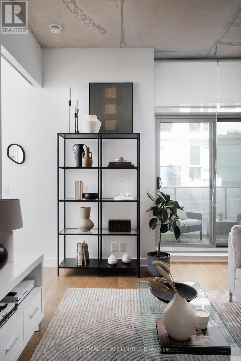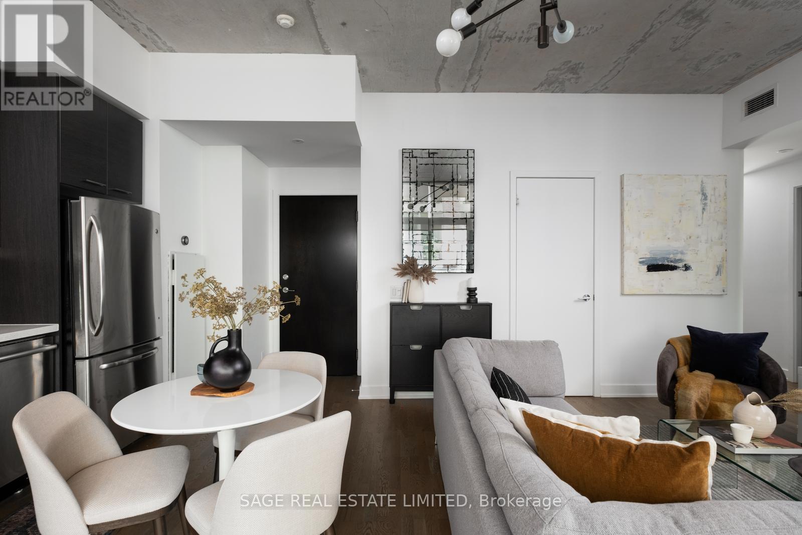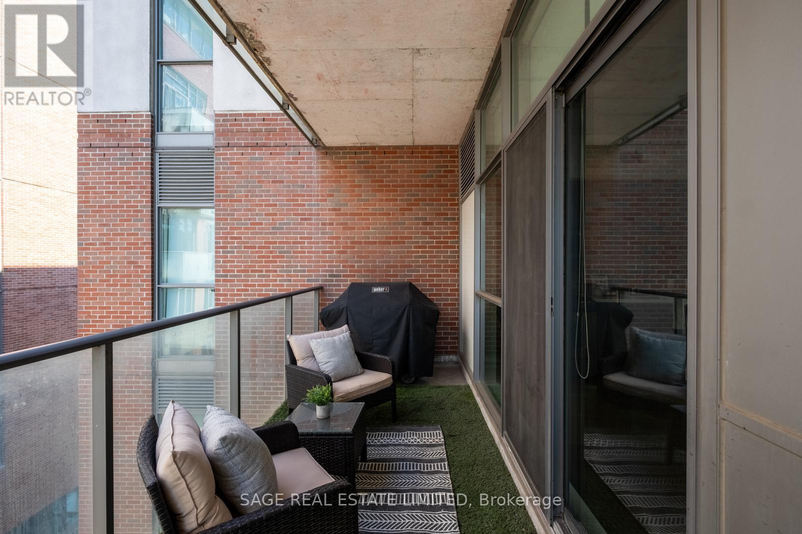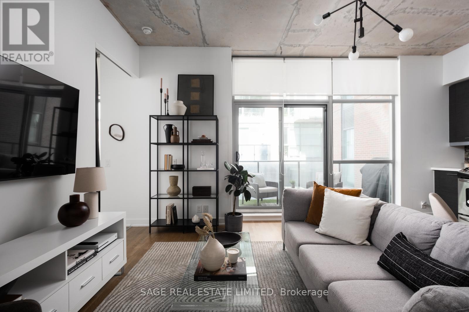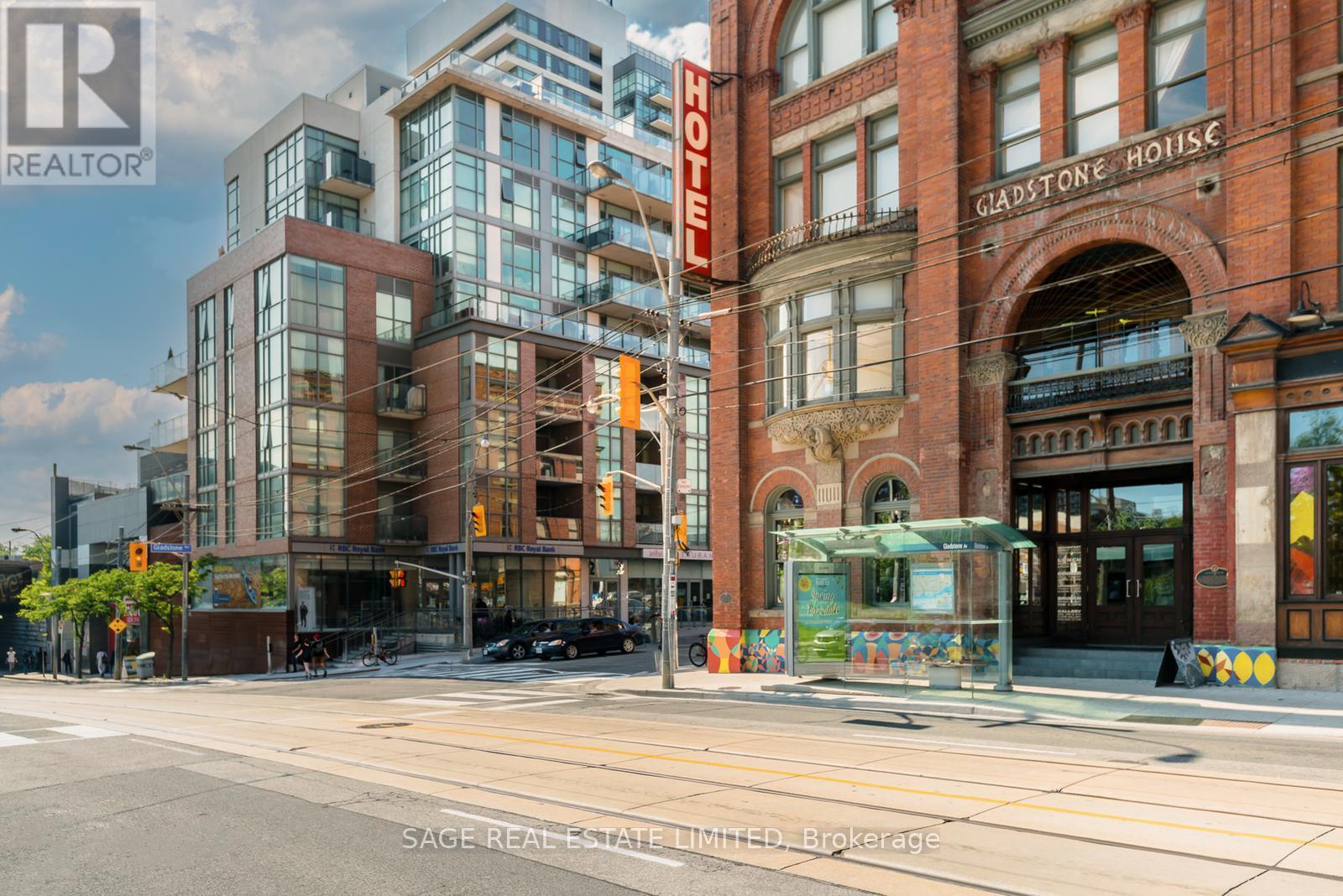 Welcome to loft living at its best in the heart of Queen West. This 2+1 bedroom, 2 bathroom suite at 2 Gladstone brings together industrial character, modern design, and everyday convenience--all in one of Toronto's trendiest neighbourhoods. Inside, soaring 9.5-foot exposed concrete ceilings and floor-to-ceiling windows create an open and airy feel. The kitchen is sleek and functional with full-size stainless steel appliances, a gas stove, and plenty of storage, flowing into the living and dining areas and out to a 184 sq ft balcony with a gas line for BBQs--rare in the city. The primary bedroom is a true retreat, with three closets, a 4-piece ensuite, and a walkout to a private 135 sq ft terrace where you can enjoy morning coffee or evening wine in complete privacy. The second bedroom is versatile, while the oversized den with custom built-ins offers the perfect work-from-home setup or additional guest space. The den has a large window, and is perfect for a nursery or home office. This boutique building offers unbeatable convenience, with two grocery stores just outside your door, and countless bars, cafes, eateries, and restaurants at your doorstep, including the Gladstone and Drake Hotels. Trinity Bellwoods Park is a 20-minute stroll away, the Queen Street streetcar is right outside, and the Gardiner Expressway is only minutes away by car. With underground parking, a locker, and a location that blends style, function, and city living, this is urban loft life--elevated. (id:51158)