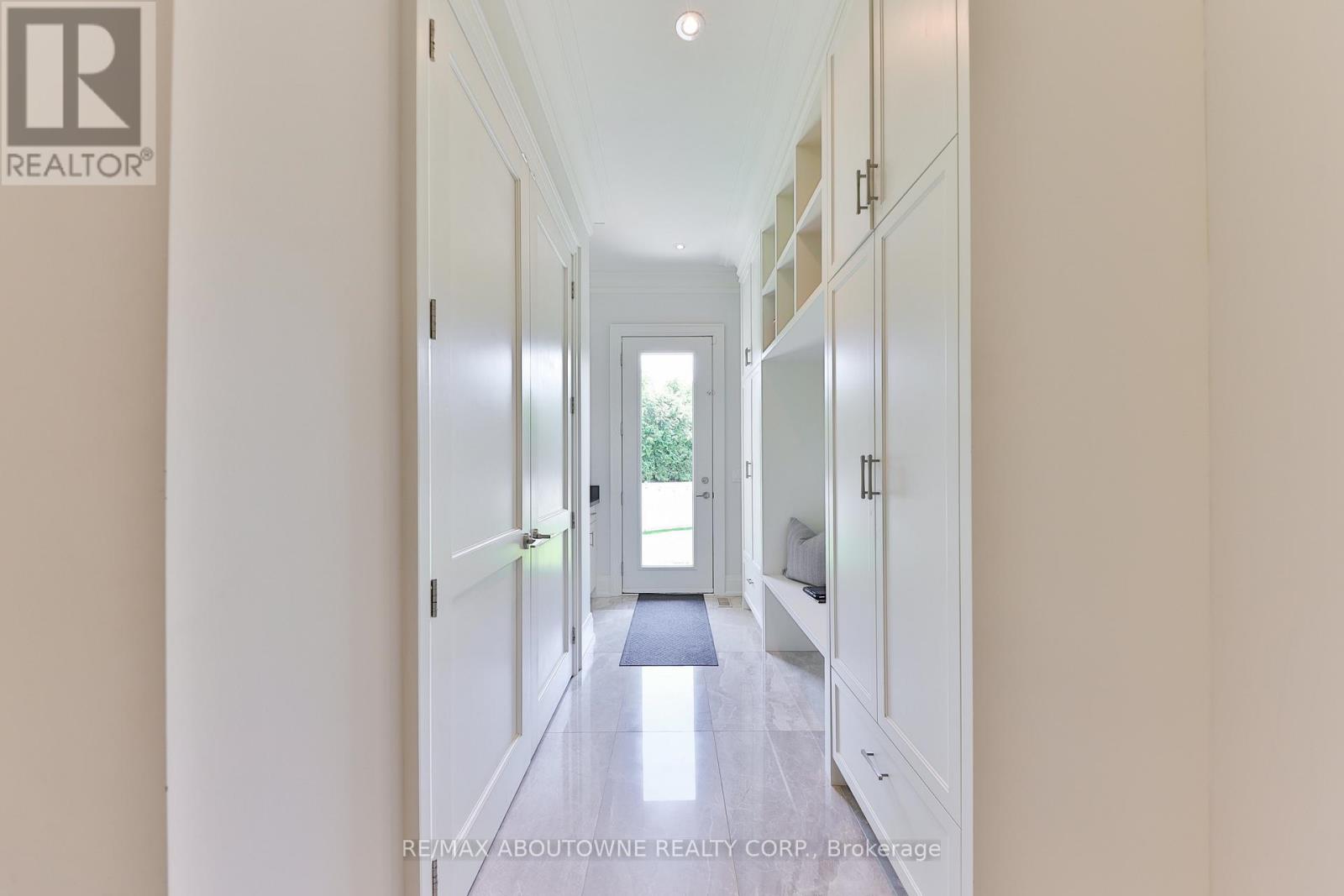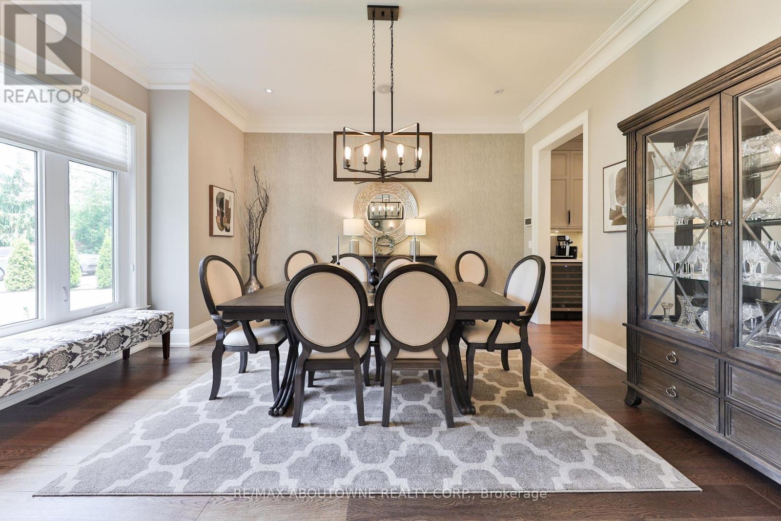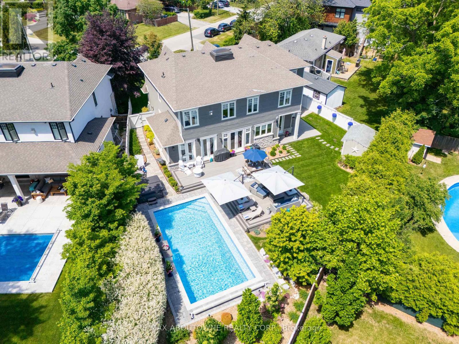 This custom-built residence combines timeless architecture, magazine-worthy interiors, and a resort-style backyard with over 6,100 sq. ft. of finished living space. Set on one of the largest pie-shaped lots in the neighbourhood (over 45% larger than average) and just 3km to Appleby College, it offers a rare sense of scale and privacy. Southwest-facing gardens showcase a heated saltwater pool, tiered lounging areas, ambient lighting, and mature hedging. Inside, 10' ceilings, wide-plank hardwood, and bespoke millwork create quiet sophistication. The open-concept kitchen and family room with gas fireplace and French doors connect seamlessly to the gardens. A formal living room, elegant dining area, and private office complete the main floor. Upstairs, the primary suite rivals a luxury hotel with spa-inspired ensuite and dressing room, complemented by 3 bedrooms and laundry. The finished lower level adds a rec room with wet bar, gym, sauna, bedroom, and bathroom, ideal for teens, guests, or multigenerational families. (id:51158)
