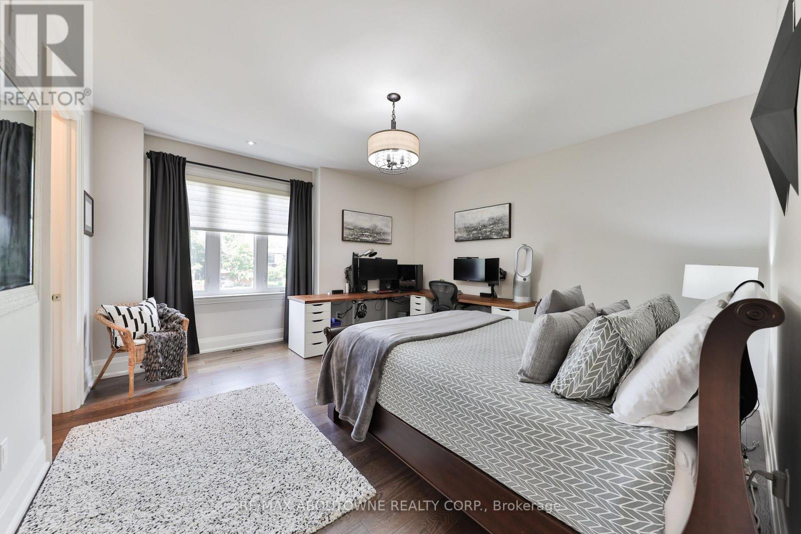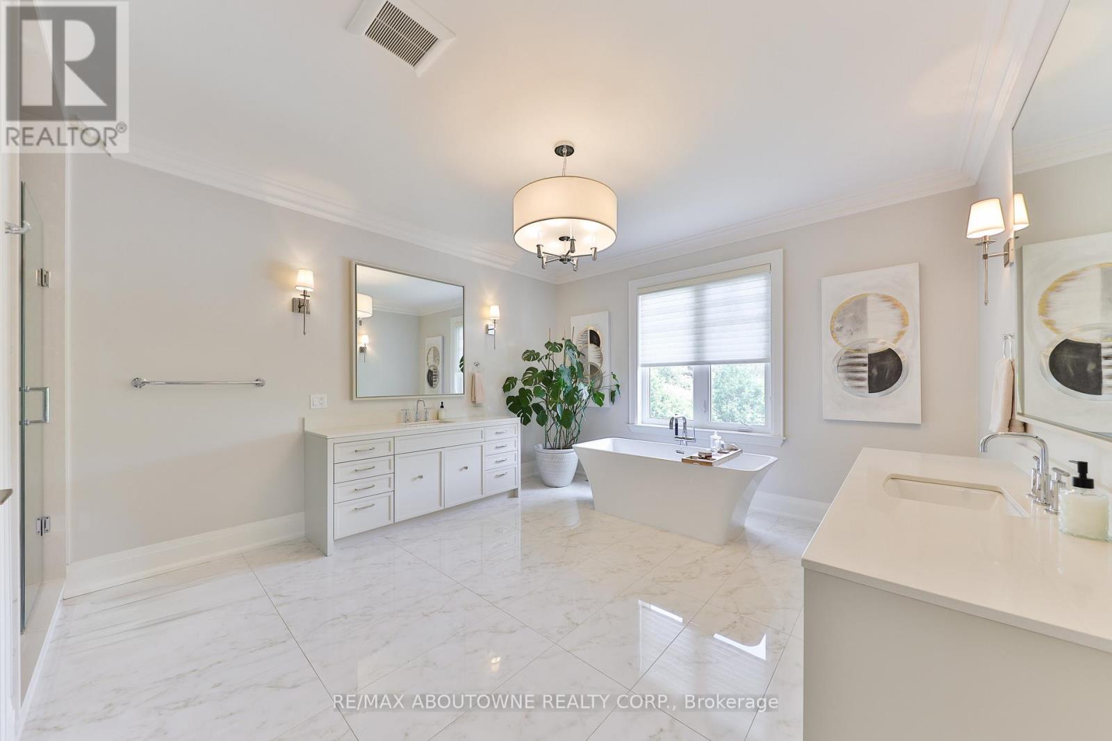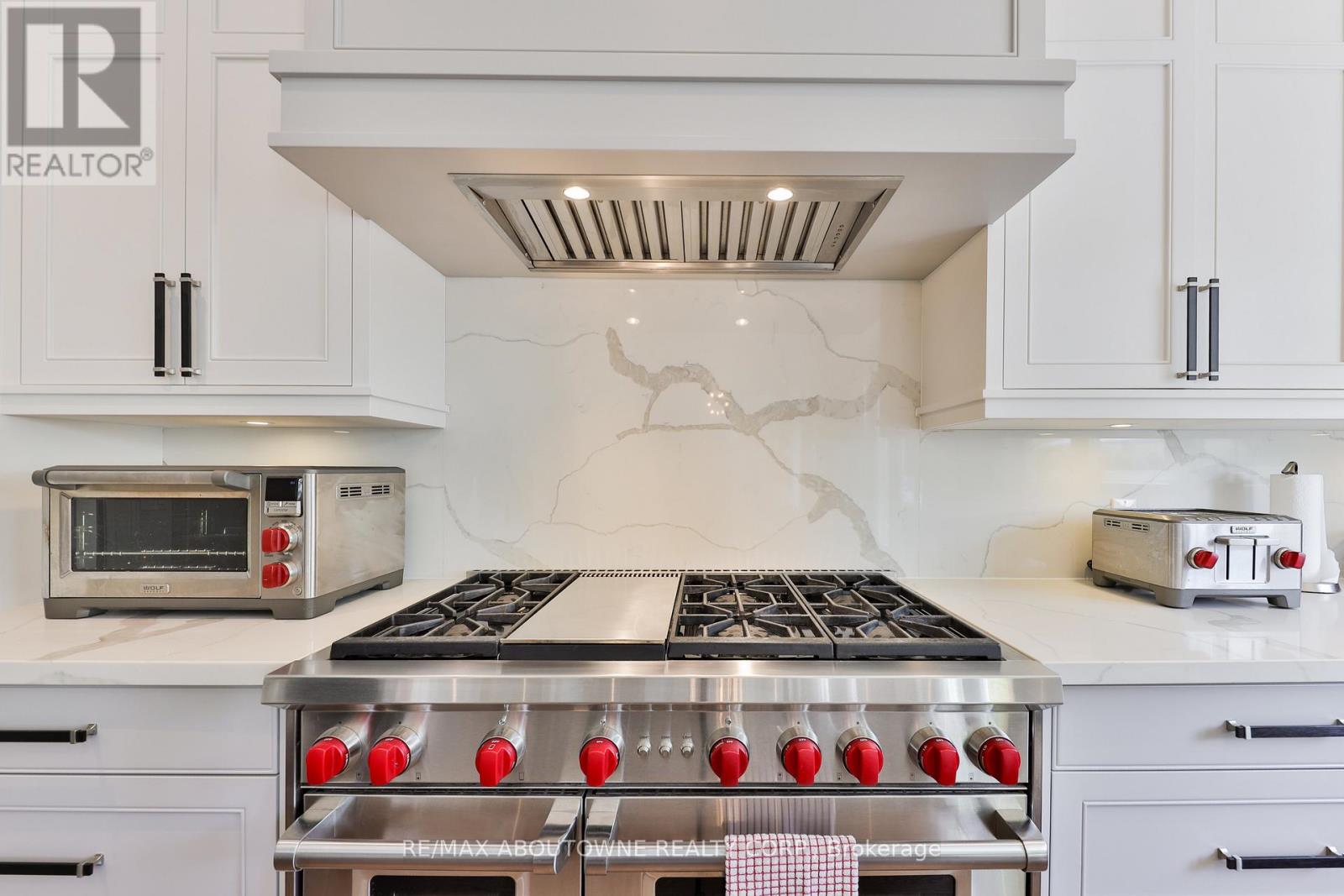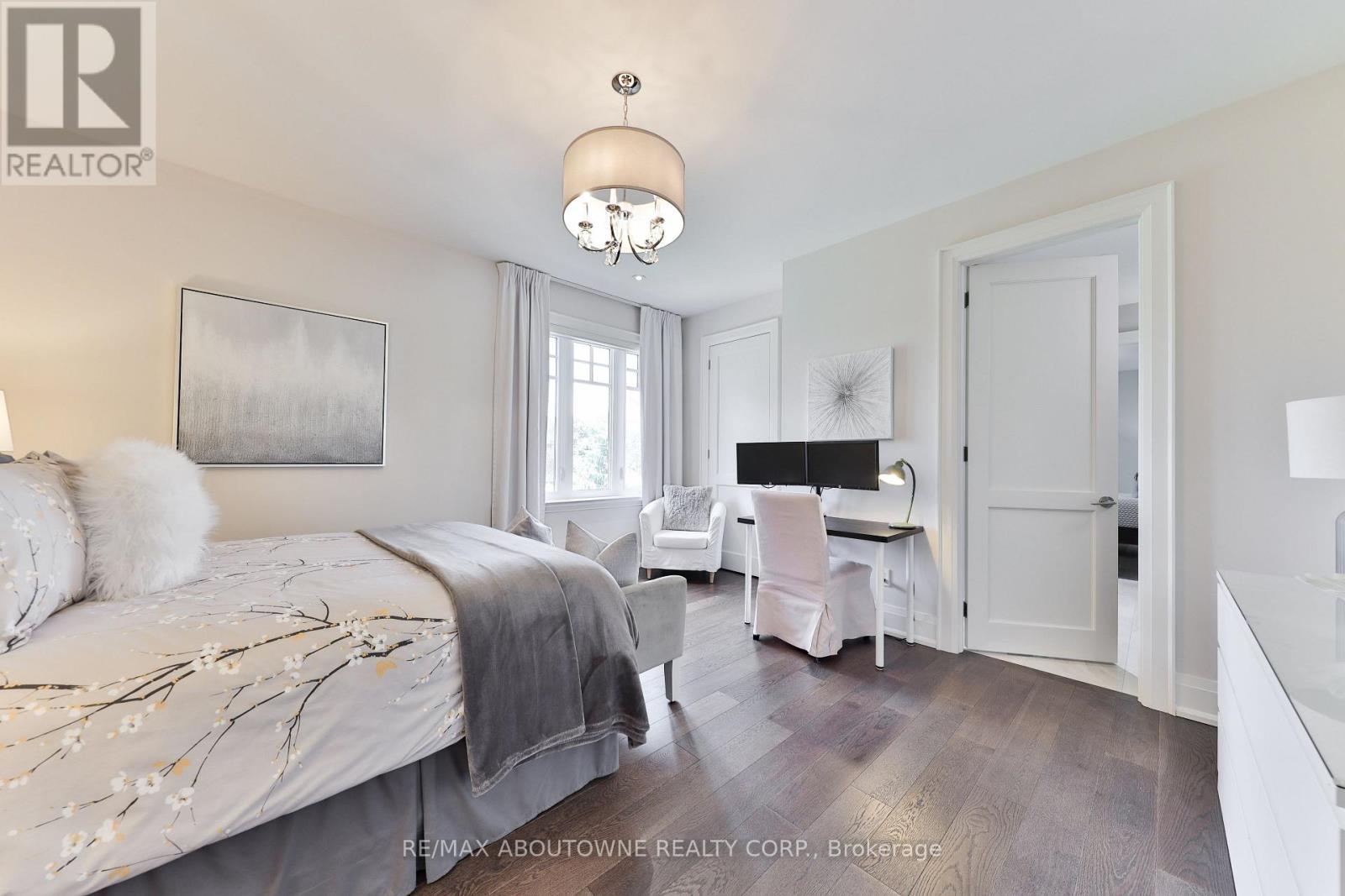This custom-built residence combines timeless architecture, magazine-worthy interiors, and a resort-style backyard with over 6,100 sq. ft. of finished living space. Set on one of the largest pie-shaped lots in the neighbourhood (over 45% larger than average) and just 3km to Appleby College, it offers a rare sense of scale and privacy. Southwest-facing gardens showcase a heated saltwater pool, tiered lounging areas, ambient lighting, and mature hedging. Inside, 10' ceilings, wide-plank hardwood, and bespoke millwork create quiet sophistication. The open-concept kitchen and family room with gas fireplace and French doors connect seamlessly to the gardens. A formal living room, elegant dining area, and private office complete the main floor. Upstairs, the primary suite rivals a luxury hotel with spa-inspired ensuite and dressing room, complemented by 3 bedrooms and laundry. The finished lower level adds a rec room with wet bar, gym, sauna, bedroom, and bathroom, ideal for teens, guests, or multigenerational families. (id:51158)