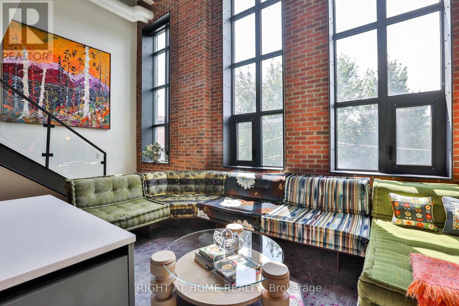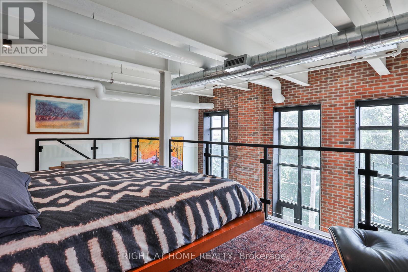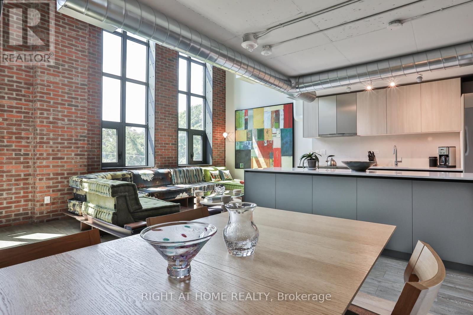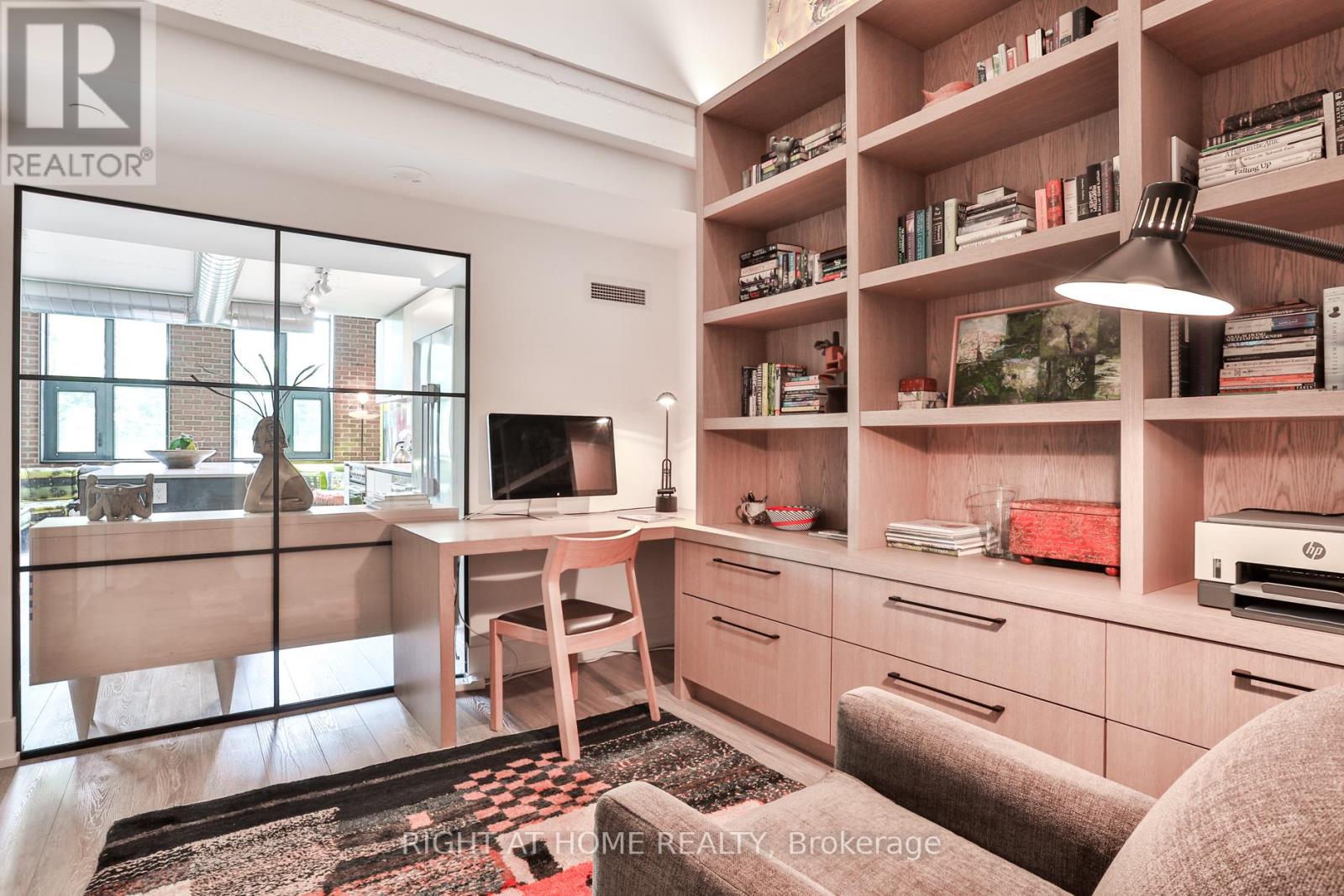 Something truly special at Wonder Condos - a sun-filled heritage loft with ideal west exposure, dramatic 17-foot ceilings, and original character throughout. Nearly 1,500 square feet of exceptional living space framed by soaring windows with integrated blinds, warm red brick accents, and a flexible floorplan accommodating up to three bedrooms. The upper loft is devoted to a serene primary suite with a generous walk-in closet and spa-like ensuite with dual vanities. A sprawling chefs kitchen anchors the main level, featuring an oversized island, abundant storage, premium appliances and induction range. Currently, the main floor includes a large office with custom built-ins and walk-in closet (easily reverted to a bedroom) plus a comfortable den, once a third bedroom. A full bathroom serves this level. Life at Wonder Condos offers a dynamic blend of history and modern convenience, with vibrant amenities including a rooftop terrace with BBQs and fire pits, co-working space, dog-wash station, well-equipped gym, and kids party room. Steps to the shops and dining of Queen East, and moments to Ashbridges Bay, Lake Ontario, and easy downtown/DVP access. An evolving neighbourhood within easy walking and cycling distance to the new Port Lands, Biidaasige Park, and the upcoming Ontario Line just blocks away. Exceptional space in a remarkable community. (id:51158)