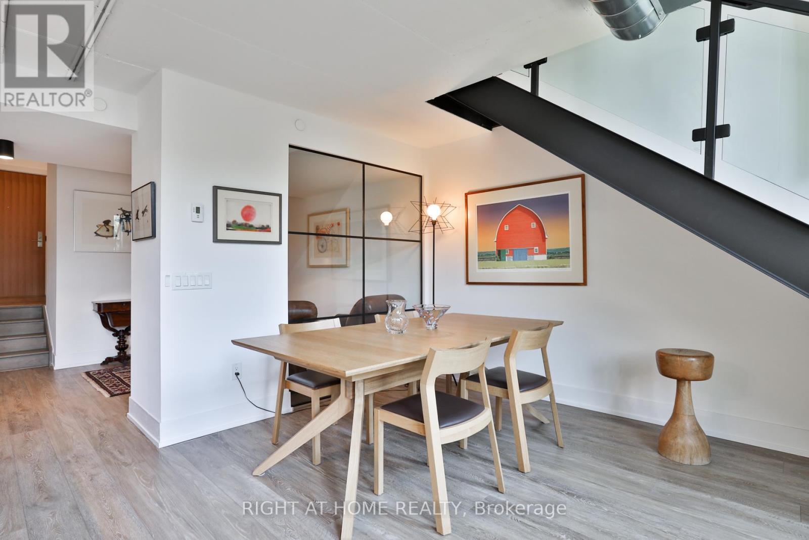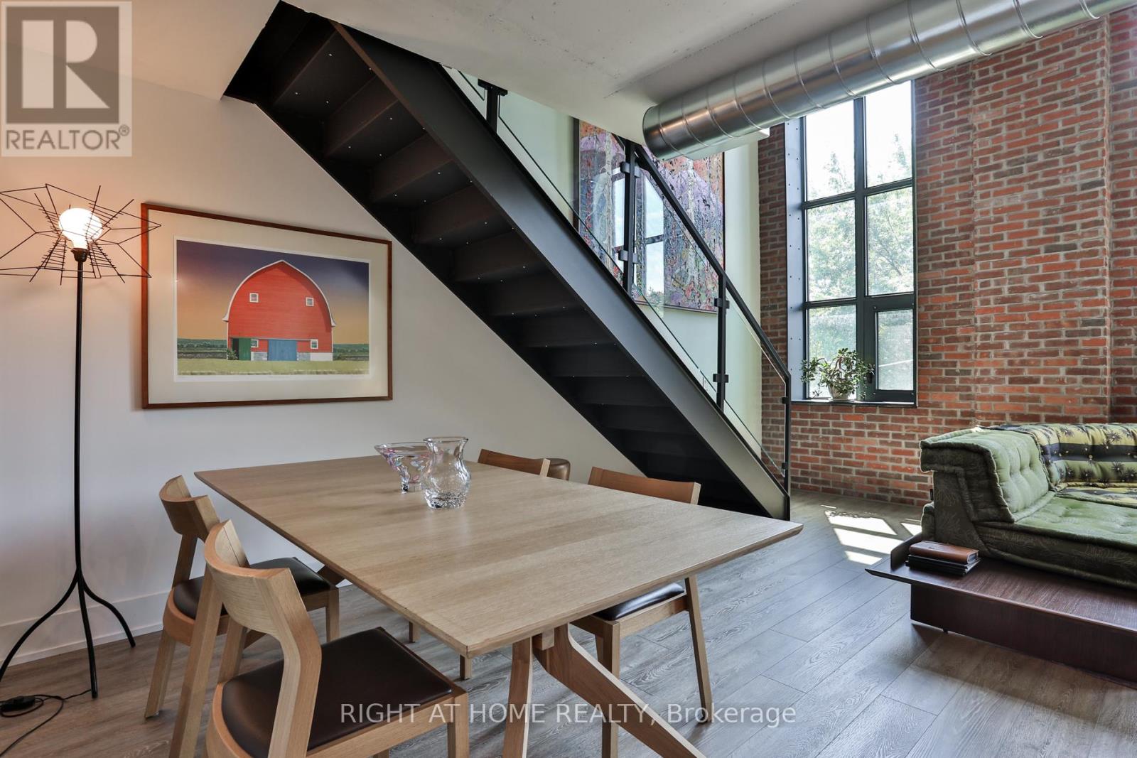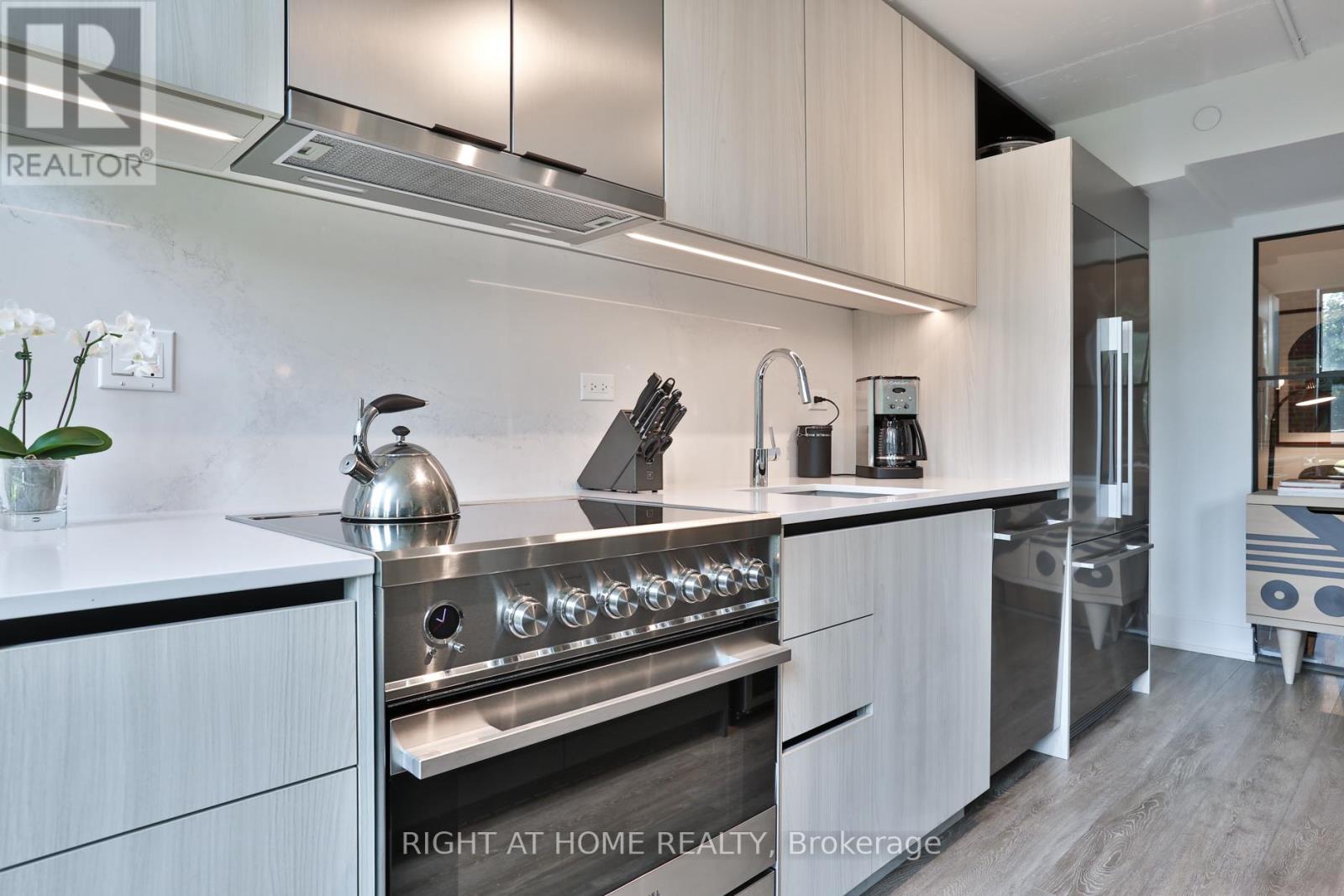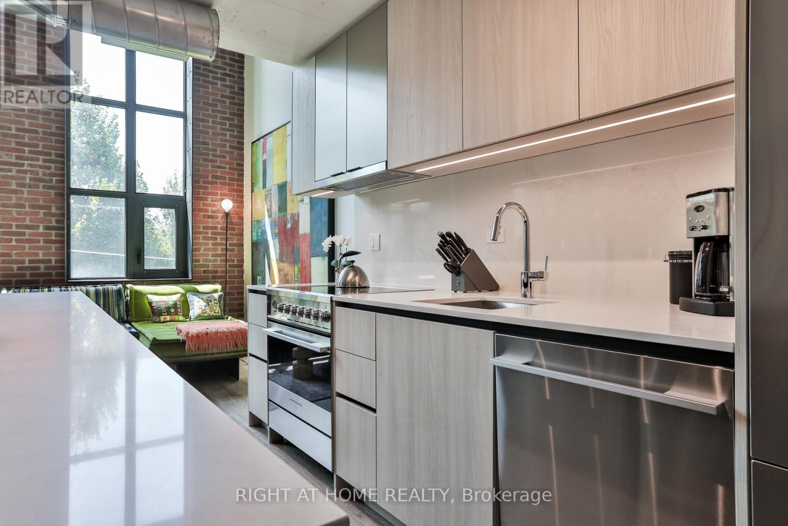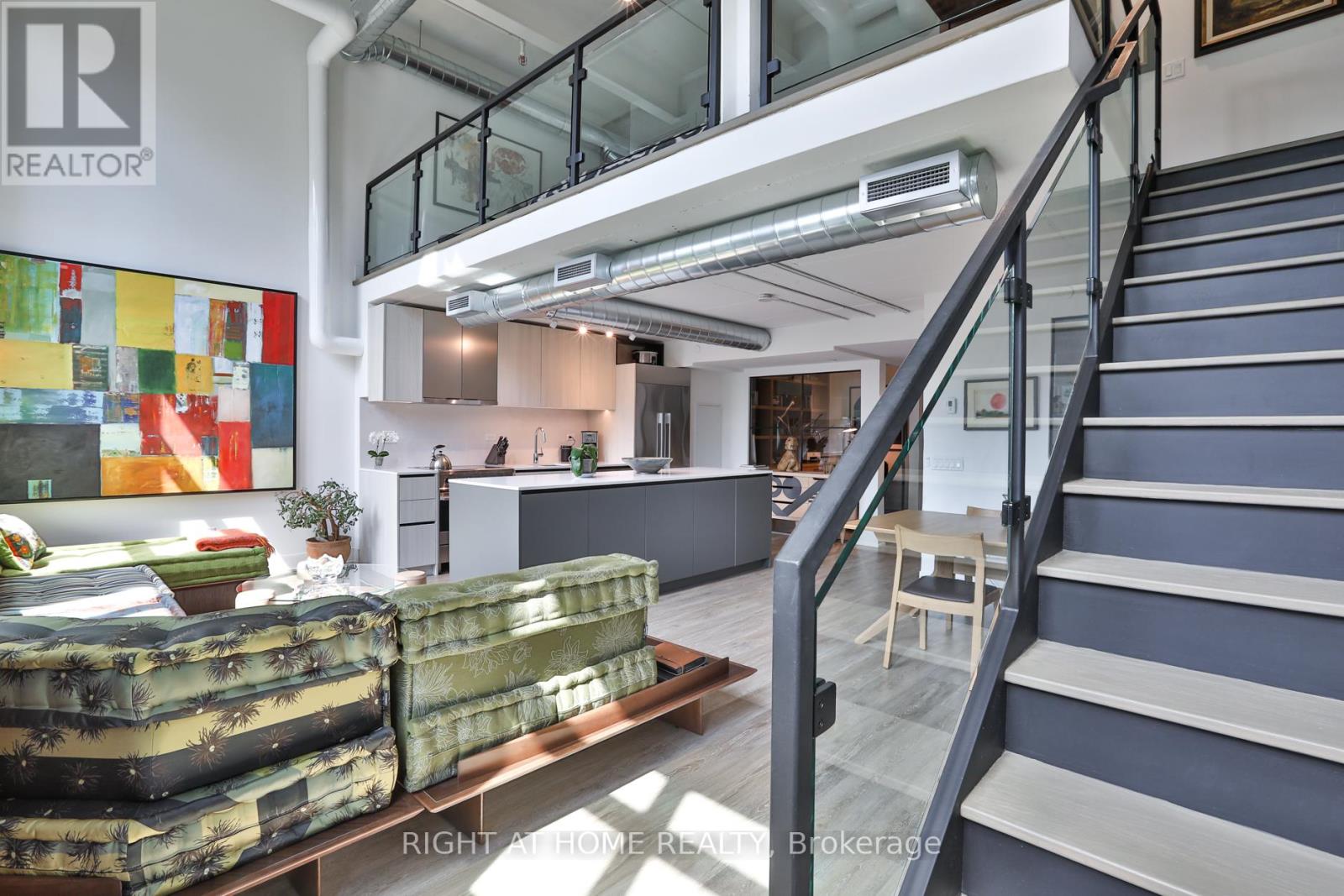 Something truly special at Wonder Condos - a sun-filled heritage loft with ideal west exposure, dramatic 17-foot ceilings, and original character throughout. Nearly 1,500 square feet of exceptional living space framed by soaring windows with integrated blinds, warm red brick accents, and a flexible floorplan accommodating up to three bedrooms. The upper loft is devoted to a serene primary suite with a generous walk-in closet and spa-like ensuite with dual vanities. A sprawling chefs kitchen anchors the main level, featuring an oversized island, abundant storage, premium appliances and induction range. Currently, the main floor includes a large office with custom built-ins and walk-in closet (easily reverted to a bedroom) plus a comfortable den, once a third bedroom. A full bathroom serves this level. Life at Wonder Condos offers a dynamic blend of history and modern convenience, with vibrant amenities including a rooftop terrace with BBQs and fire pits, co-working space, dog-wash station, well-equipped gym, and kids party room. Steps to the shops and dining of Queen East, and moments to Ashbridges Bay, Lake Ontario, and easy downtown/DVP access. An evolving neighbourhood within easy walking and cycling distance to the new Port Lands, Biidaasige Park, and the upcoming Ontario Line just blocks away. Exceptional space in a remarkable community. (id:51158)