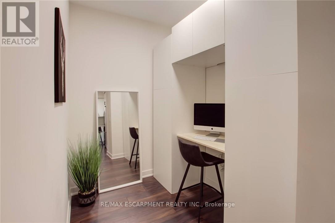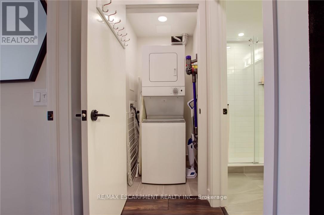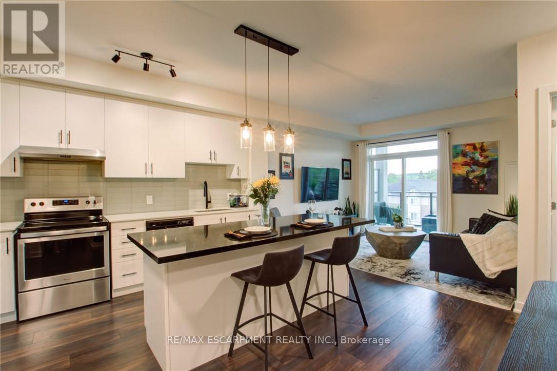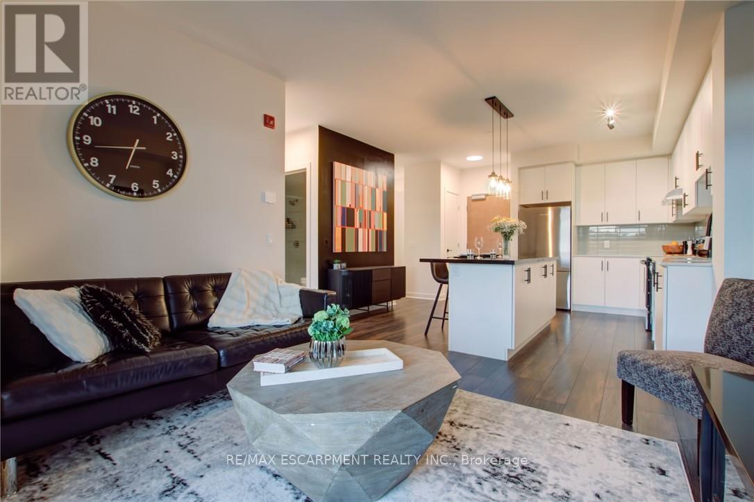 $623.99 MonthlyCheck out this amazing unit in the Trendy Affinity Condos! Living room, bedroom and terrace offer amazing sunset views of the Escarpment! Upgrades in this lovely high ceiling 1bdrm w den/workspace and 3pc bathroom. In suite laundry, master bedroom closet organizer. Large designer look kitchen area, loads of counter & cupboard space with adjacent bright living room perfect for entertaining. Newly replaced expanded quartz black island counter top with seating for 4-6 great for cooking and entertaining. Brand new stylish cabinet and door black hardware. Matching new quartz black counter in 3pc bathroom with stand up upgraded shower and tiled bathroom. Brand new fashionable black light fixtures throughout. TWO OWNED side-by-side underground parking spaces!! Loads of building amenities roof top patio with lounge area with fireplaces and barbeques. Work out gym with quality equipment, workout and yoga room. Party/games room, conference room, lots of visitor parking with an electric car charger station available. Unit locker is owned and located on the same level, convenient for storage. Providing modern living in the vibrant Aldershot neighbourhood! Located near GO Station, major highways, the downtown core, shopping and more! Lock and-leave lifestyle perfect for busy professionals or empty-nesters. (Investors welcome too...A+++ tenant offering to stay on for additional years). (id:51158)