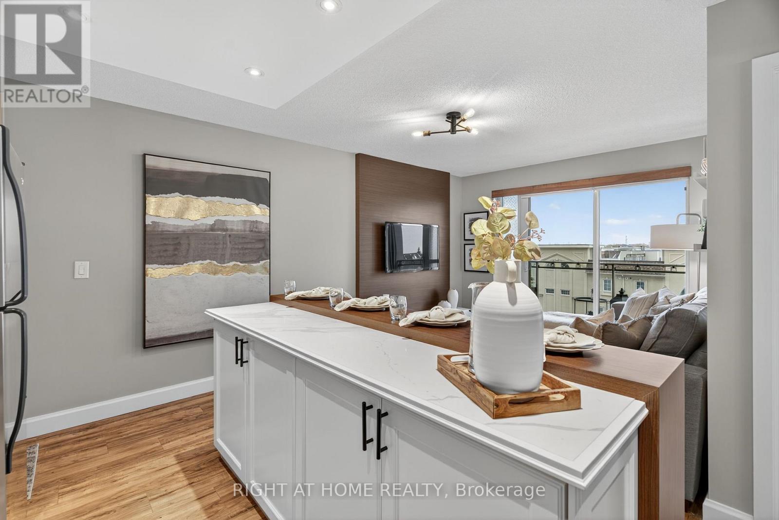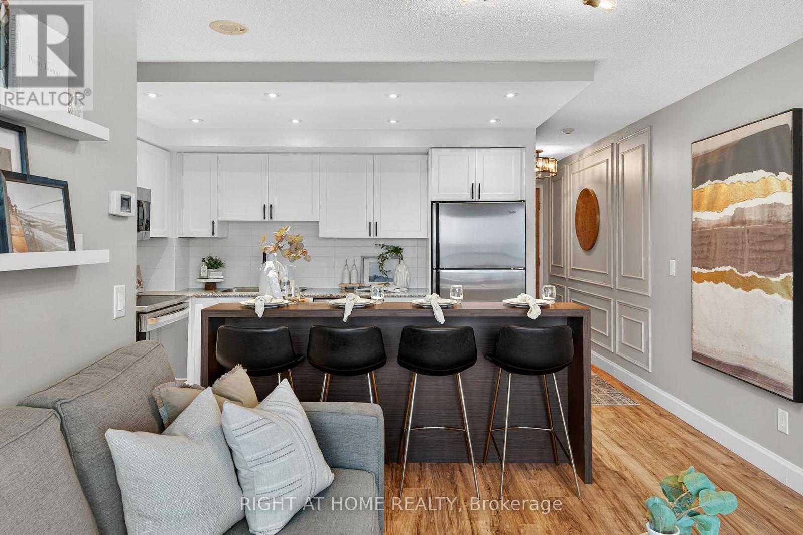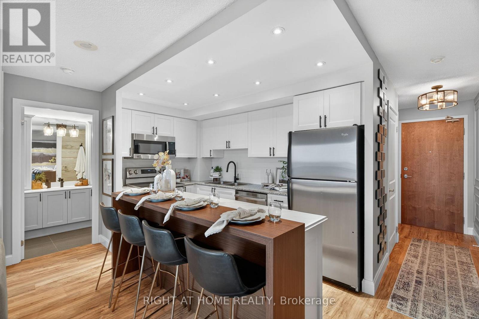 $527.39 MonthlyWelcome home to the esteemed San Francisco By The Bay condominium complex. This south facing, sun filled unit is meticulously renovated from top to bottom; no detail has been spared! Located in a prime Pickering location; close to the Waterfront, Pickering Town Centre, recreation centre, library, restaurants and steps to the GO Train station. The welcoming front hallway includes tasteful wall molding and a custom built pantry/closet combination. The eat-in kitchen features a custom built island, stainless steel appliances, subway tile backsplash & and new cabinet doors. The living area boasts a floor to ceiling entertainment wall and walks out to the uncovered balcony with outdoor flooring and custom benches for both seating and storage. The large bedroom features a sizeable south facing window and a custom designed closet. The newly tiled bathroom includes a large vanity with upper cabinets and a renovated bathtub/shower. You'll find upgraded flooring and light fixtures throughout! Building amenities include: 24-hour concierge service, underground parking, a locker for additional storage, large indoor swimming pool, steam room and fitness, aerobic and party rooms! (id:51158)