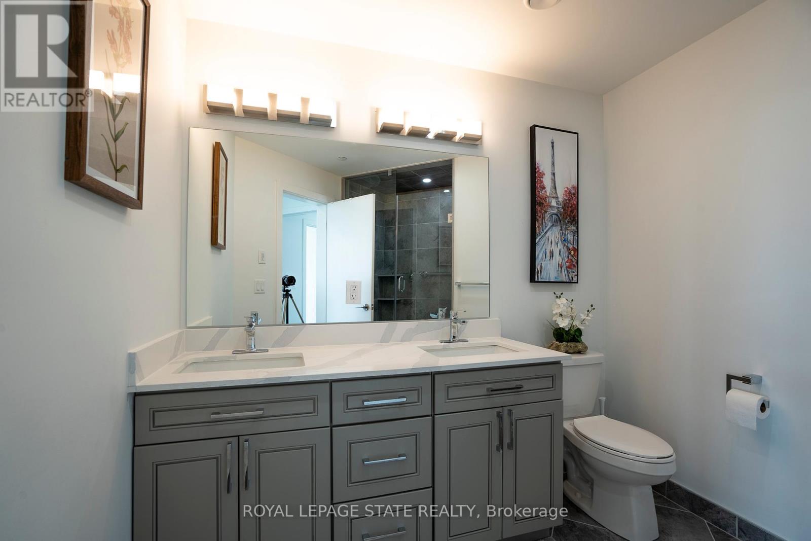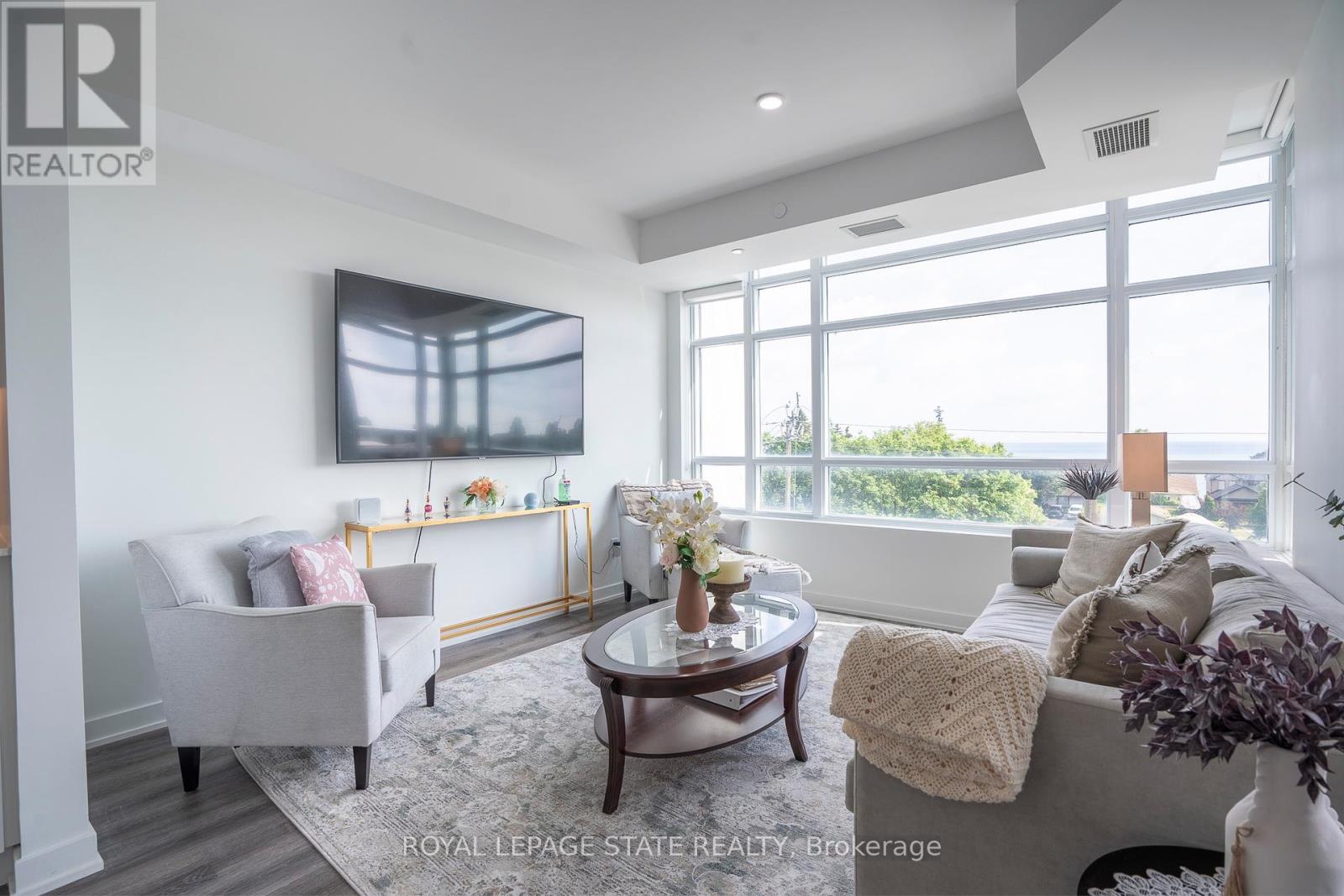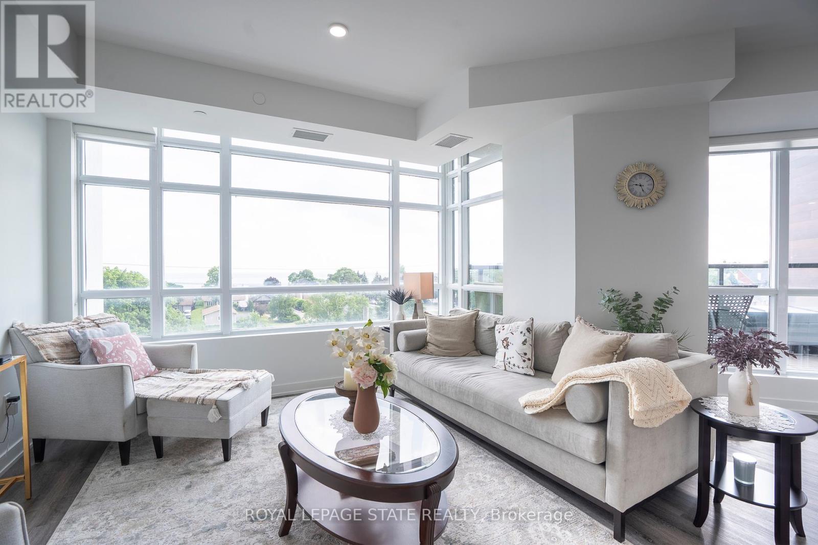 Nestled along the pristine shores of Lake Ontario in the heart of Stoney Creek, this exceptional 2-bedroom, 2-bathroom corner suite at Como delivers a rare blend of style, space, and panoramic lakefront views - including the breathtaking Toronto skyline. Offering 1,238 square feet of meticulously designed interior space, this residence exudes modern elegance with 9-foot smooth ceilings and luxury vinyl plank flooring throughout. Flooded with natural light and boasting two full balconies, this suite is perfectly positioned to capture unobstructed lake views from virtually every angle. The gourmet kitchen is a showstopper, equipped with quartz countertops, a center island, stylish backsplash, under-cabinet lighting, and premium stainless steel appliances, including a French door fridge, wall oven, built-in cooktop, microwave, and dishwasher. Thoughtfully designed slow-close cabinetry elevates both function and finish. The spacious primary bedroom is a private retreat, featuring a walk-in closet, dual sinks, and a spa-like ensuite with glass shower, plus direct balcony access where morning coffee meets lakeside serenity. Custom roller shades offer privacy without compromising the view. Additional features include a heat pump (rental at $69.59/month), ensuring year-round comfort with energy efficiency. As a resident of Como, you'll enjoy access to exceptional amenities: a media room, party room, and rooftop terrace - ideal for entertaining or relaxing while soaking in the sweeping lake and skyline vistas. With every detail curated for comfort and sophistication, Suite 418 is more than just a home - it's a lifestyle. Don't miss your opportunity to own one of Como's most desirable lake-facing units. (id:51158)