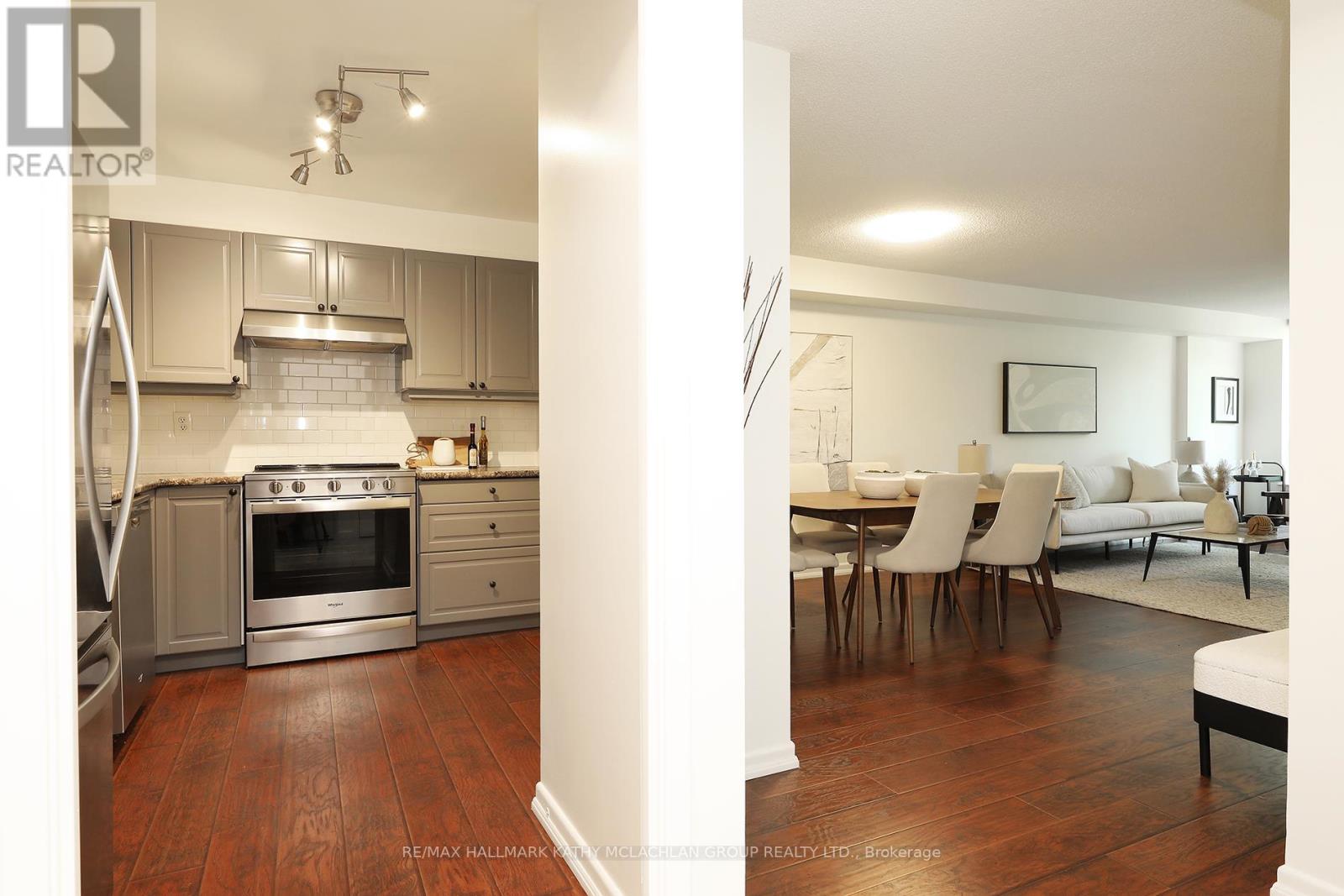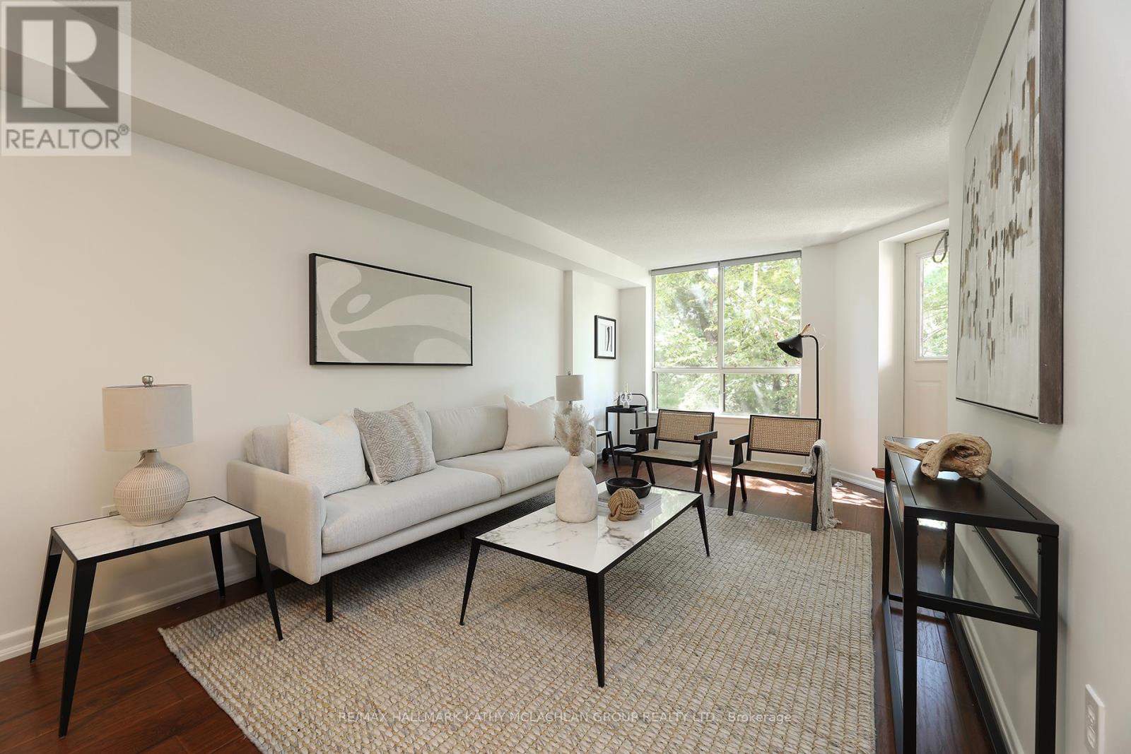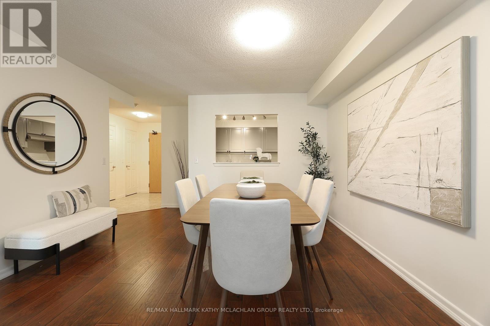 $809.57 MonthlyHighly sought after Leaside Gate. One bedroom, west facing suite overlooking peaceful gardens. Spacious foyer has closet and additional cupboard/pantry. Laundry room features Miele washer & dryer. Quality laminate floors throughout. Updated kitchen with stainless steel appliances and pass-through to dining area. Open concept living/dining area overlooks gardens and leads to private 45 sq ft balcony. Primary bedroom with sliding door walk out to balcony. Ensuite 4 pc bathroom. Parking and locker included. (id:51158)
