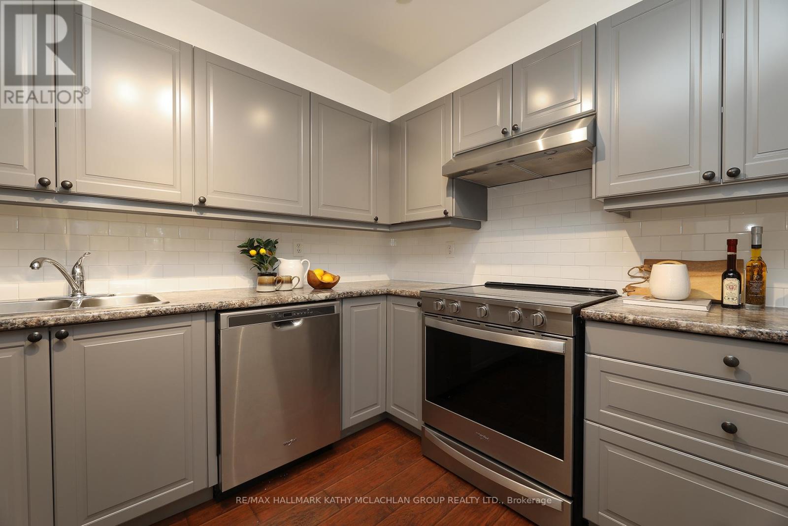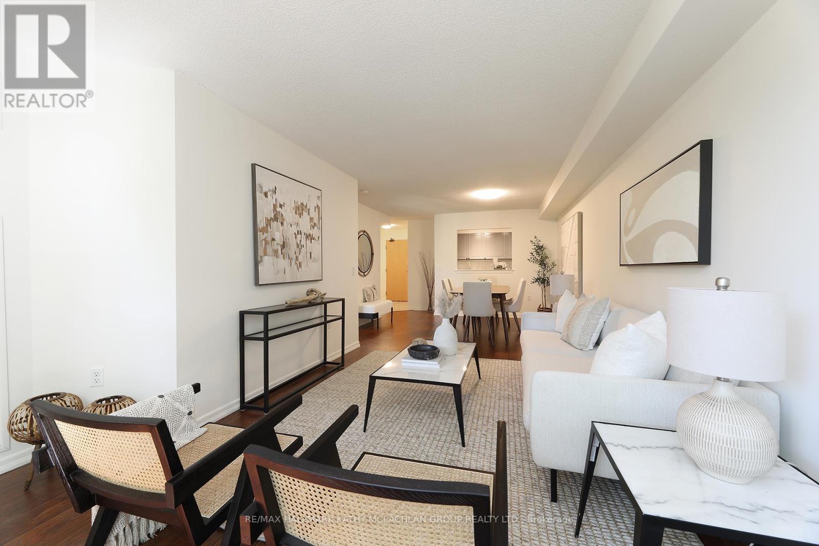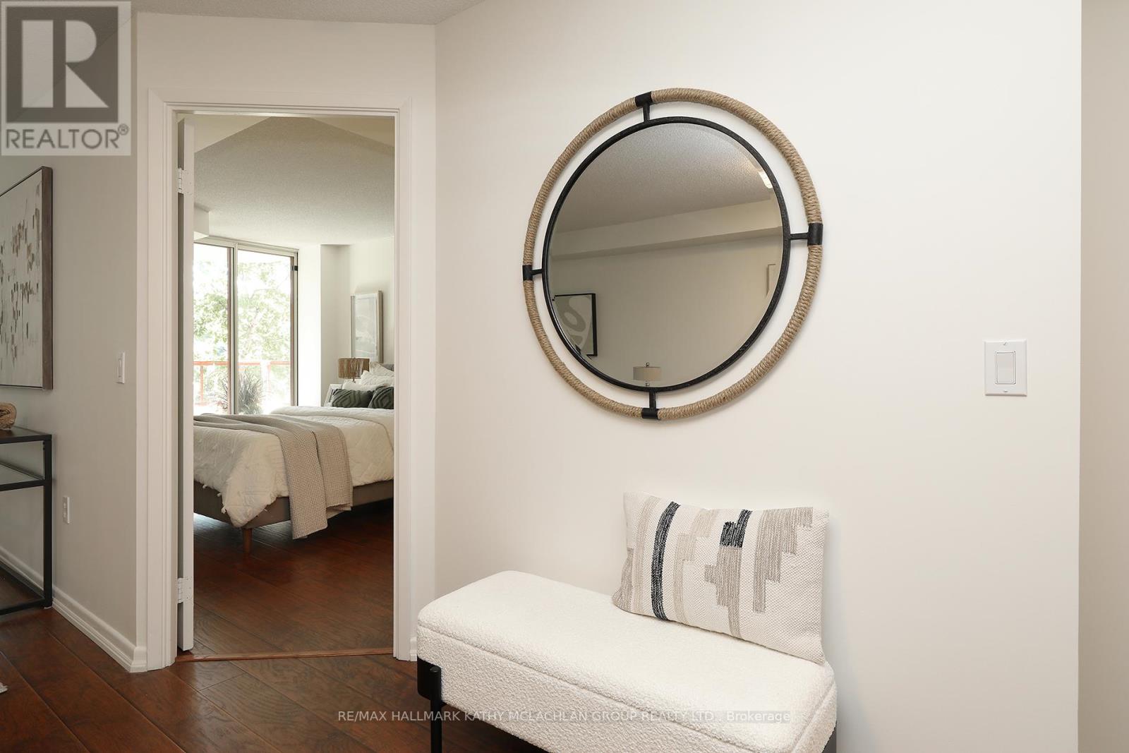 $809.57 MonthlyHighly sought after Leaside Gate. One bedroom, west facing suite overlooking peaceful gardens. Spacious foyer has closet and additional cupboard/pantry. Laundry room features Miele washer & dryer. Quality laminate floors throughout. Updated kitchen with stainless steel appliances and pass-through to dining area. Open concept living/dining area overlooks gardens and leads to private 45 sq ft balcony. Primary bedroom with sliding door walk out to balcony. Ensuite 4 pc bathroom. Parking and locker included. (id:51158)