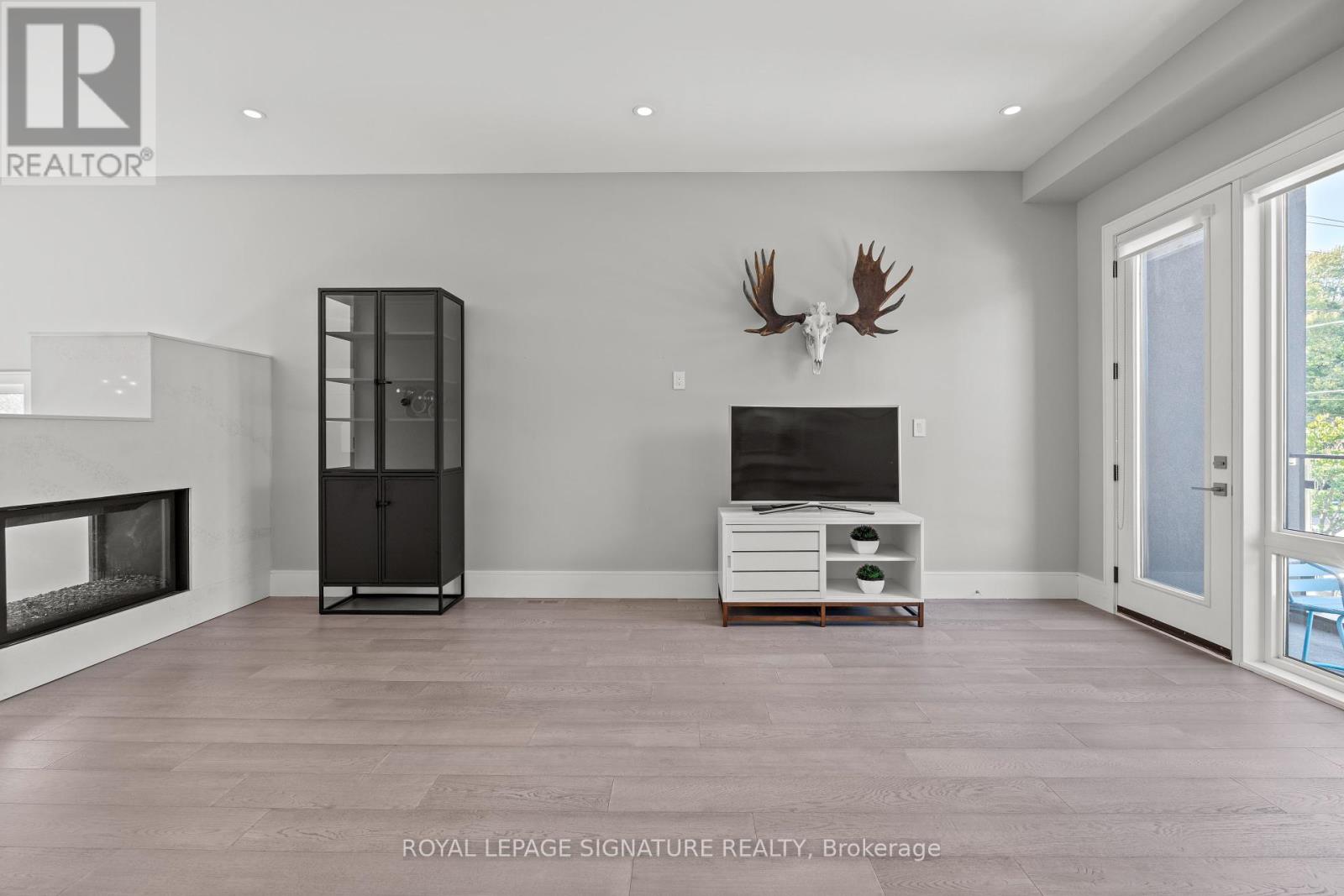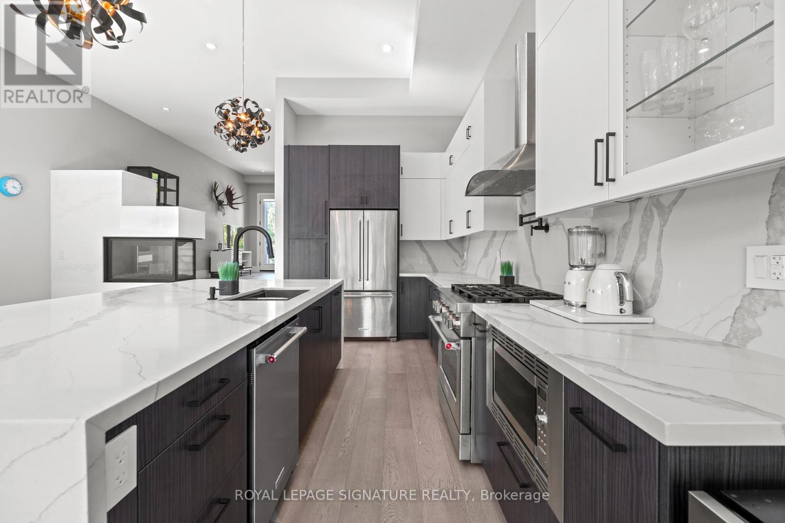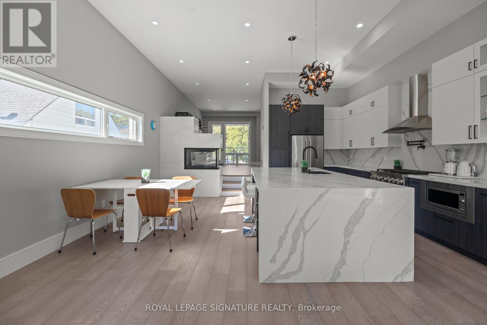 Stunning contemporary luxury home showcasing top-of-the-line custom design and high-end finishes throughout. This residence features wide-plank hardwood floors, 12 ft ceilings, and an open-concept layout that seamlessly blends the kitchen, dining, and family room areas. The chefs kitchen is equipped with a custom design, luxury appliances, and an impressive 10 ft island, with a walkout to a spacious deck and private backyard, perfect for entertaining. Elegant skylights and a striking two-way gas fireplace add warmth and natural light to the main living areas. The primary suite offers a private balcony, custom walk-in closet with built-ins, and a spa-inspired ensuite bathroom. The lower level is finished with heated polished concrete floors, full walkout, and ample space for recreation or a home gym. Conveniently located near top-rated schools, parks, golf courses, shops, transit, the Lakeshore, and major highways, this home delivers both luxury and lifestyle. (id:51158)