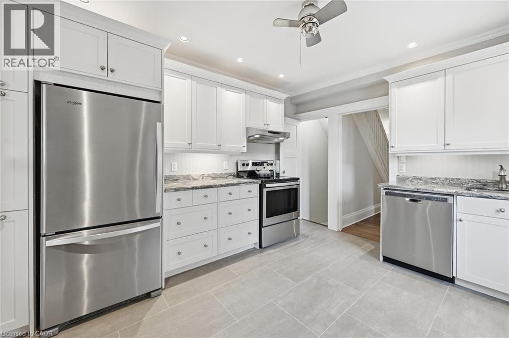 Welcome home! This beautifully renovated detached century home offers 3 bedrooms and 2 full bathrooms, thoughtfully updated from top to bottom, inside and out. Step onto the newly replaced front porch and into a bright, open living and dining area showcasing refinished hardwood floors, crown moulding, and a cozy electric fireplace that highlights the home’s timeless charm and character. The white eat-in kitchen has been replaced and features quartz countertops, stainless steel appliances, and direct access to a generous bonus space; perfect as a mudroom and pantry. The private, fully fenced backyard is a true retreat, complete with a newly replaced upper porch and lower deck surrounded by mature trees. Upstairs, the spacious primary bedroom features a bay window and a large closet with built-in organizers. Two additional spacious bedrooms, all with refinished hardwood floors, and a beautifully renovated 4-piece bathroom complete the second level. The fully finished lower level adds exceptional value with a comfortable recreation room, laundry area, large storage room, and a full 3-piece bathroom, ideal for guests or extra living space. Extensive updates include a replaced roof and eaves, siding, exterior doors, windows, driveway, porches, air conditioning, lead water service replacement, and backflow valve. Located in the heart of Downtown Hamilton, this beautiful, bright and spacious turnkey home is within walking distance to Gage Park and close to Hamilton GO, vibrant restaurants, shopping, and quick access to the QEW and Red Hill. A perfect opportunity to own in Hamilton’s growing and dynamic market, do not miss it! (id:51158)