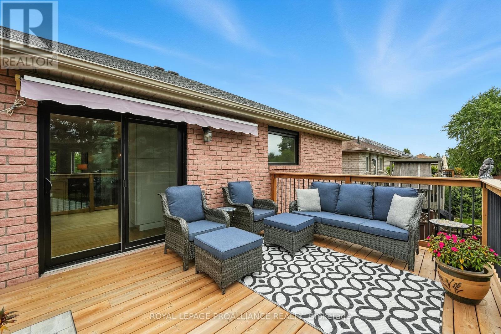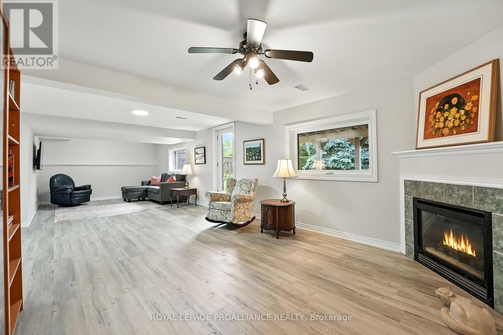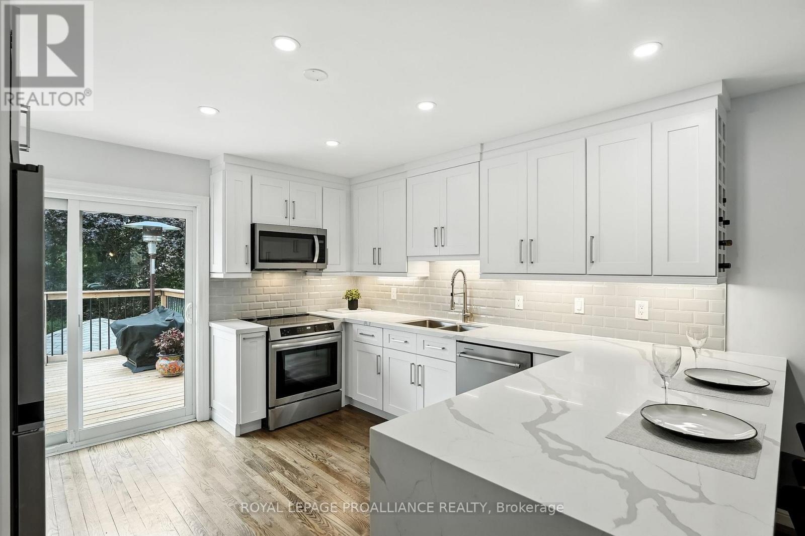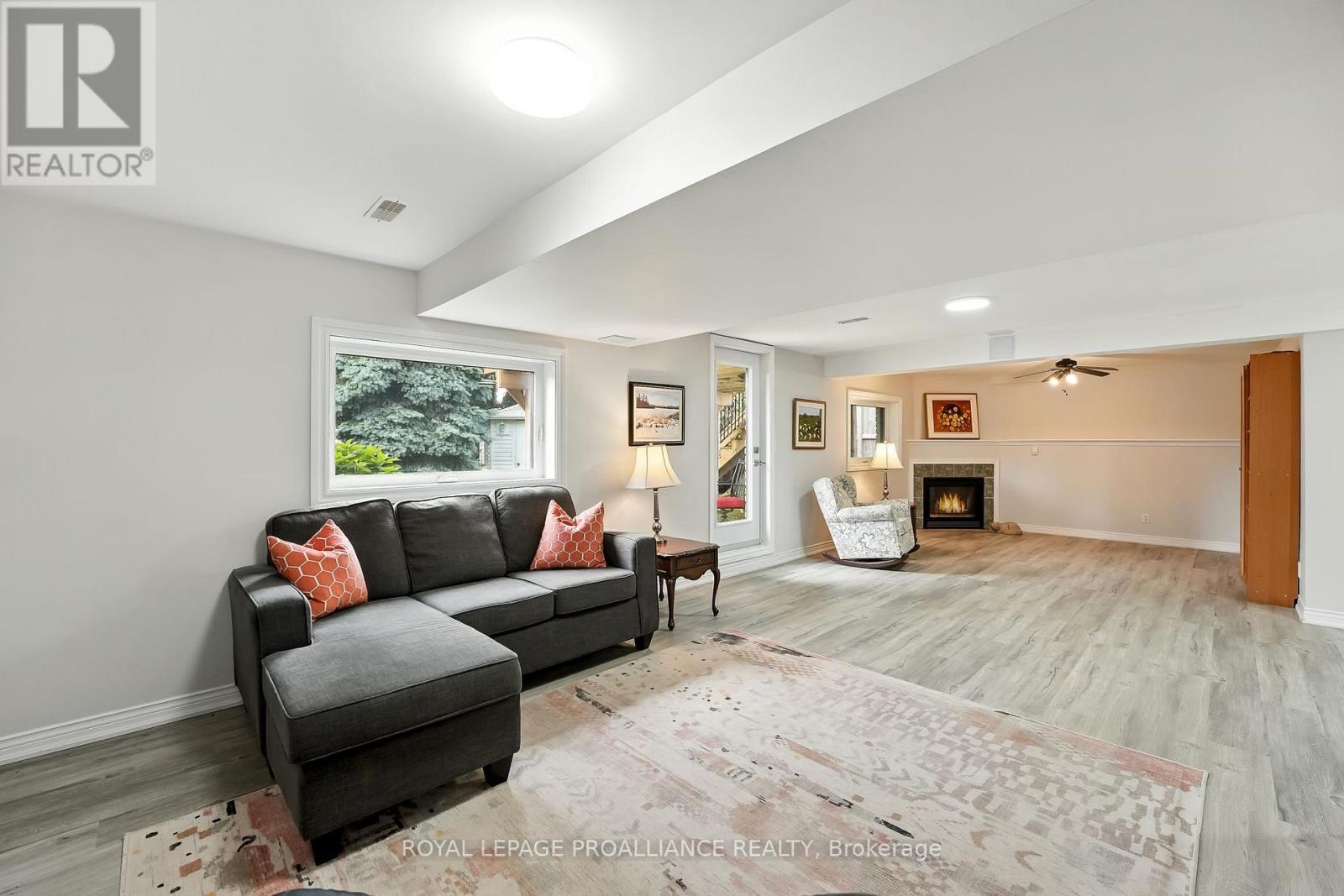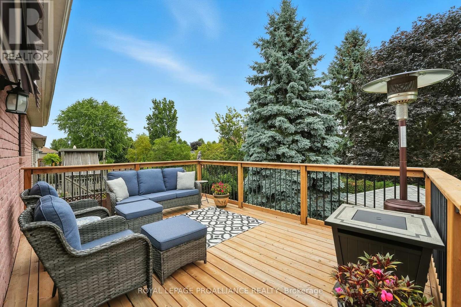Designed with comfort, elegance, and functionality in mind, this property offers exceptional indoor and outdoor living. Ideally located with easy access to Hwy 401, the hospital, Walmart, Home Depot, and Terry Fox School, and just minutes from downtown. Scenic walking trails, parks along the creek, and the YMCA are all within walking distance. Inside, expansive custom windows allow for plenty of natural light throughout, while elegant hardwood flooring adds warmth. The gourmet kitchen features a peninsula island and abundant cabinetry, designed for entertaining and seamlessly connected to the open-concept dining and living areas. The fully finished basement includes a natural gas fireplace and a walkout to the backyard deck. The spacious deck off the kitchen functions as an extra summer room, perfect for relaxing or entertaining. The exterior offers an attached 1 -car garage with opener, driveway parking for four vehicles, and a lovely, green backyard ideal for enjoying the outdoors while still being minutes from town and Hwy 401. Recent upgrades make this home truly move-in ready. Highlights include a custom kitchen with quartz countertops and waterfall peninsula (2023), renovated bathrooms, refinished hardwood flooring, new stairs and railings, LVP flooring in the basement, new appliances, expanded front patio, new windows, doors, patio door, awning fabric, garage door, water softener, new decks, and a custom closet organizer in the primary suite. Additional improvements include ceramic tile at the front entrance, extra attic insulation. (id:51158)
