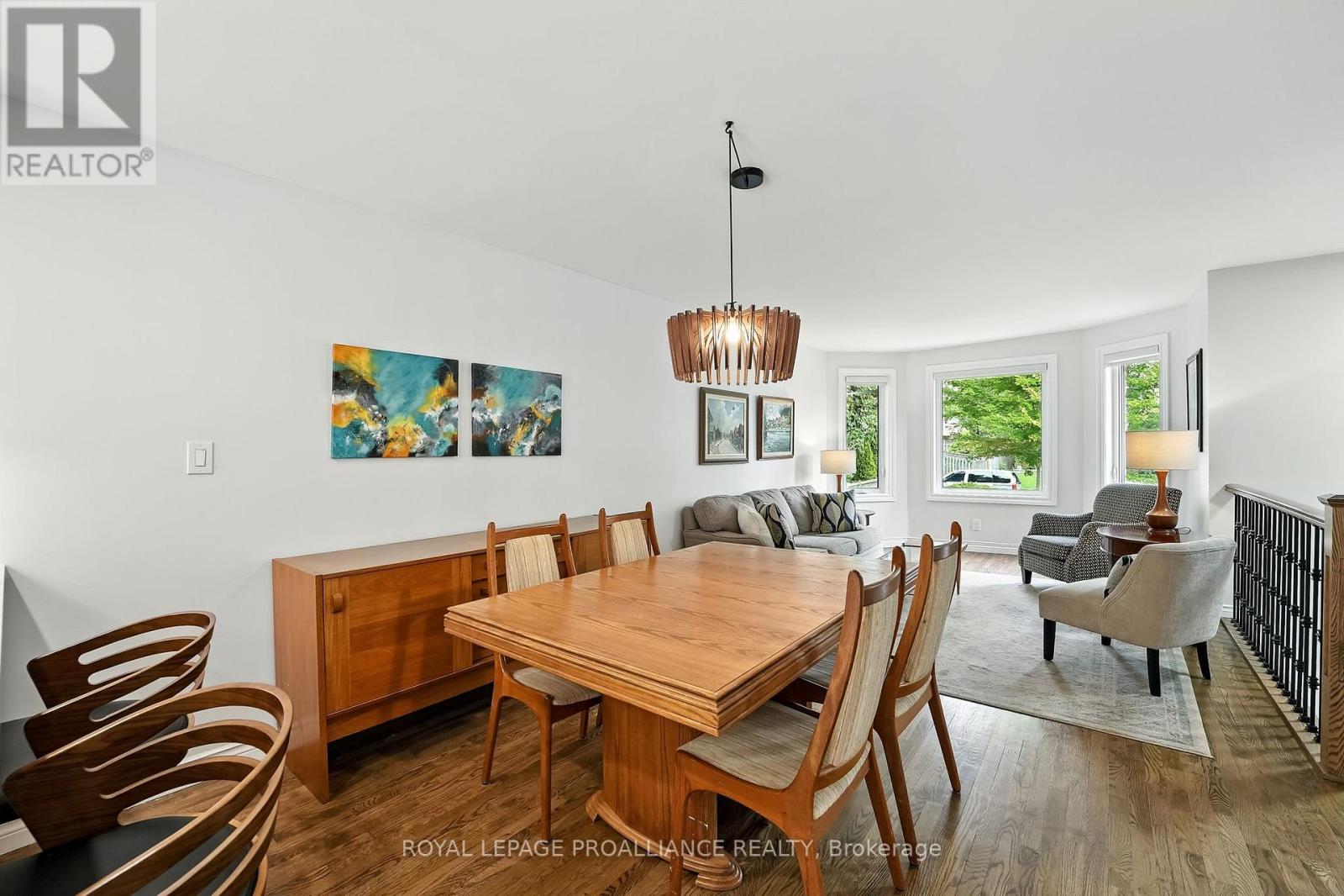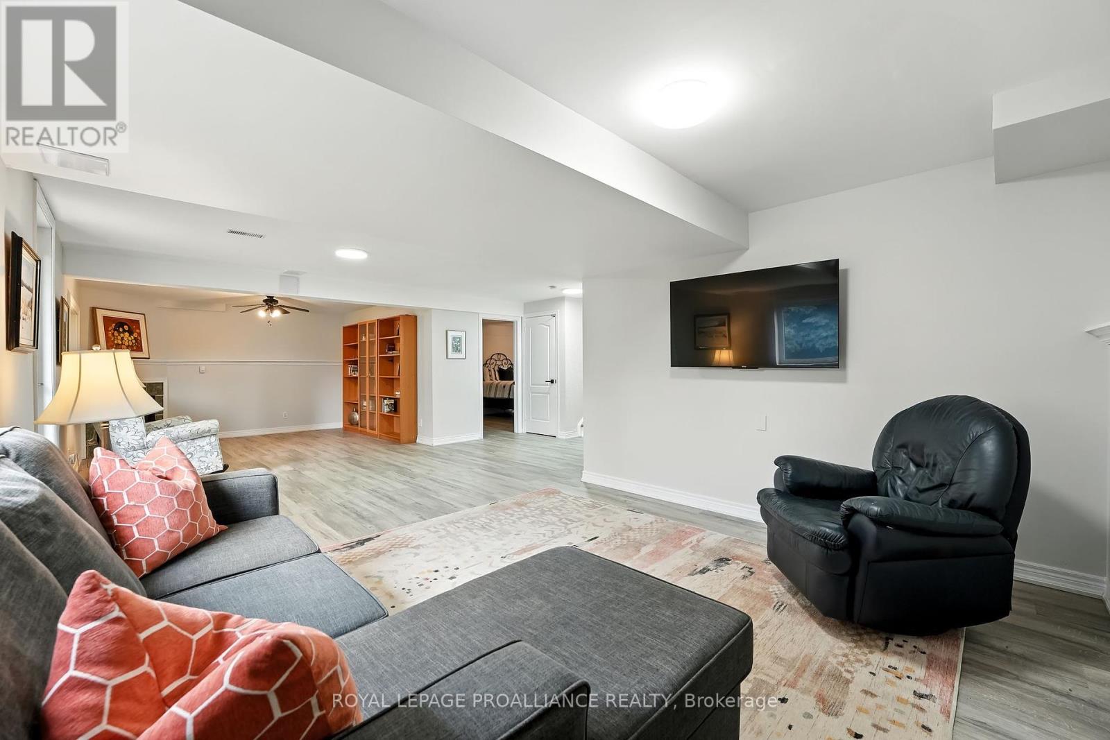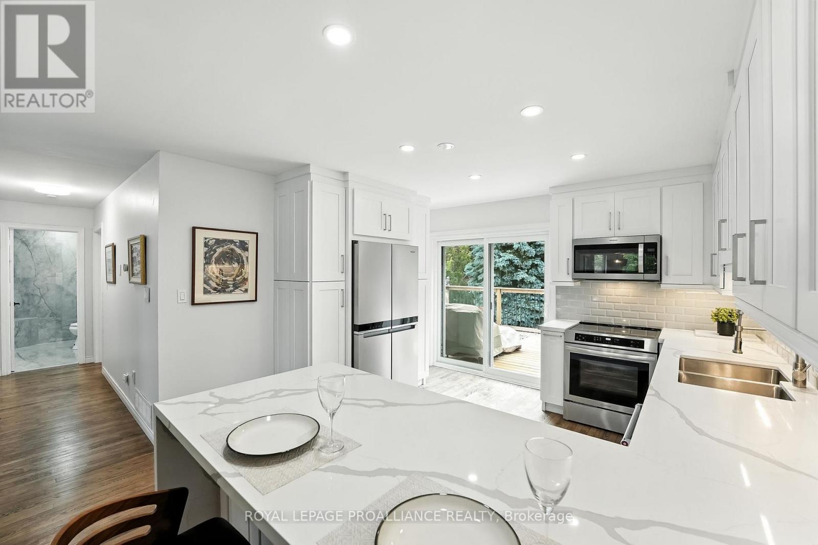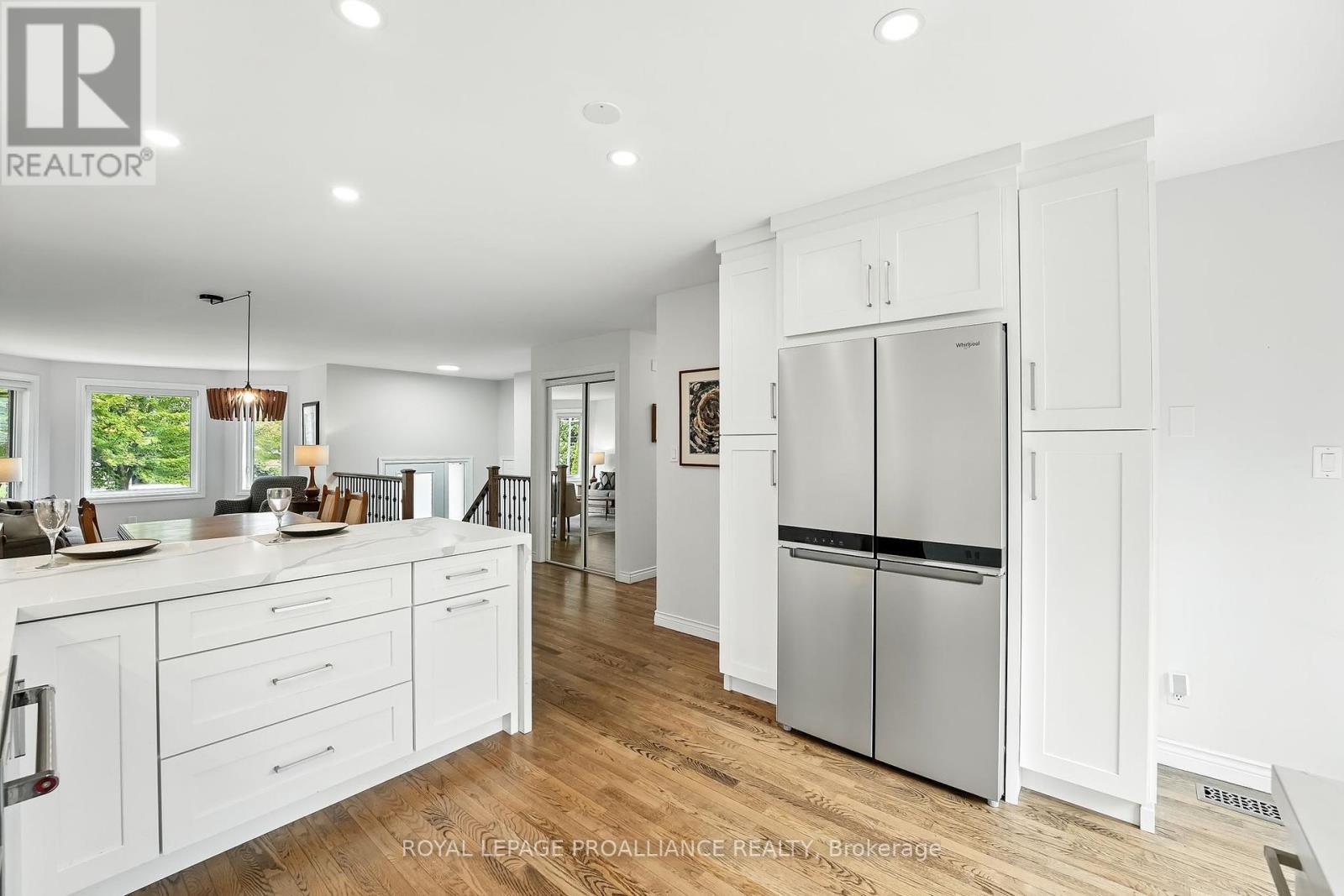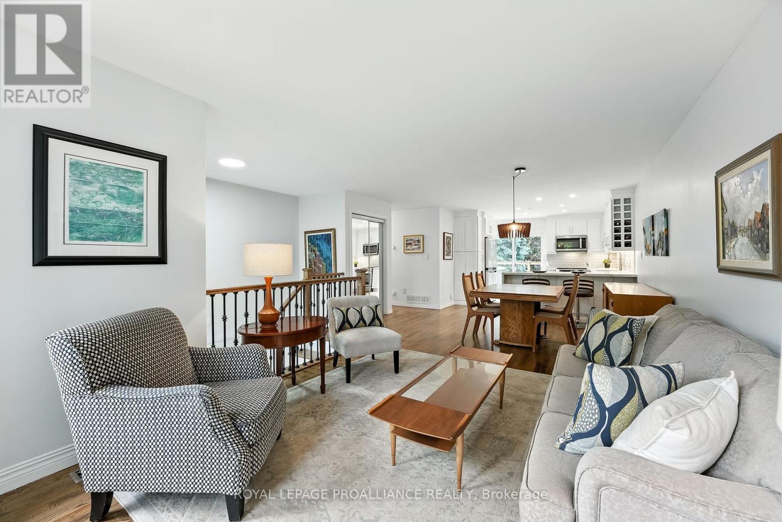 Designed with comfort, elegance, and functionality in mind, this property offers exceptional indoor and outdoor living. Ideally located with easy access to Hwy 401, the hospital, Walmart, Home Depot, and Terry Fox School, and just minutes from downtown. Scenic walking trails, parks along the creek, and the YMCA are all within walking distance. Inside, expansive custom windows allow for plenty of natural light throughout, while elegant hardwood flooring adds warmth. The gourmet kitchen features a peninsula island and abundant cabinetry, designed for entertaining and seamlessly connected to the open-concept dining and living areas. The fully finished basement includes a natural gas fireplace and a walkout to the backyard deck. The spacious deck off the kitchen functions as an extra summer room, perfect for relaxing or entertaining. The exterior offers an attached 1 -car garage with opener, driveway parking for four vehicles, and a lovely, green backyard ideal for enjoying the outdoors while still being minutes from town and Hwy 401. Recent upgrades make this home truly move-in ready. Highlights include a custom kitchen with quartz countertops and waterfall peninsula (2023), renovated bathrooms, refinished hardwood flooring, new stairs and railings, LVP flooring in the basement, new appliances, expanded front patio, new windows, doors, patio door, awning fabric, garage door, water softener, new decks, and a custom closet organizer in the primary suite. Additional improvements include ceramic tile at the front entrance, extra attic insulation. (id:51158)