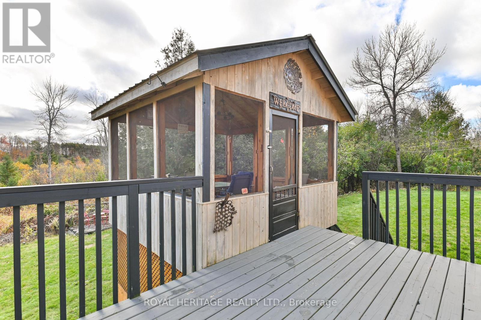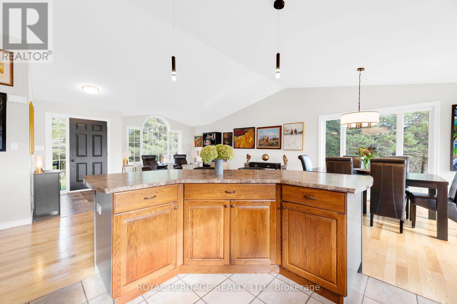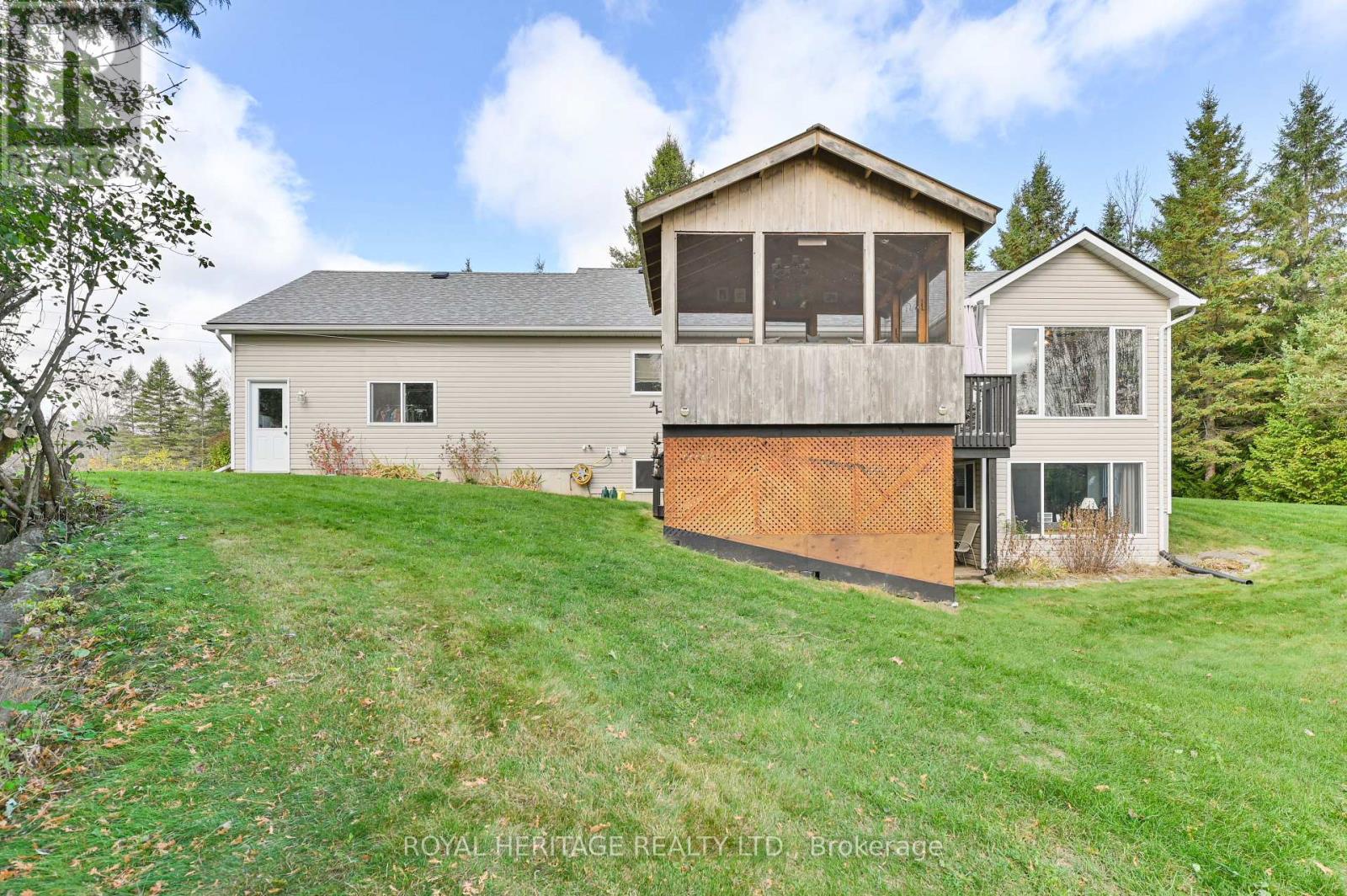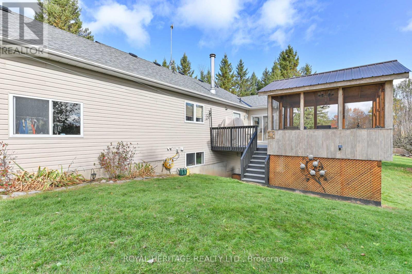 Nestled among mature trees and rolling hills, this custom-built bungalow offers the perfect blend of comfort, privacy, and natural beauty on over 5.5 scenic acres. Step inside to a bright, vaulted great room featuring gleaming hardwood floors, a spacious dining area ideal for family gatherings, and a large entertainer's island overlooking the inviting sunroom lounge. Enjoy your morning coffee or evening stargazing from the deck and screened gazebo-a serene escape surrounded by nature. The main floor features a spacious primary bedroom with double closets, a beautifully appointed shared main bath, and a generous second bedroom. Convenient main floor laundry and mudroom provide direct access to the oversized, insulated garage-perfect for hobbyists or extra storage. The finished lower level offers incredible flexibility with in-law or guest suite potential. The L-shaped family room includes a sunny sitting area and a walkout to the yard, plus a third bedroom with ensuite access to a full 3-piece bathroom. A large storage room and utility space complete this level. Outside, enjoy your own private retreat with mixed woodlands, a meandering creek, and endless opportunities to explore. The area offers beautiful trails for walking, ATVing, or snowmobiling, as well as nearby lakes and rivers perfect for boating, canoeing, and kayaking. (id:51158)