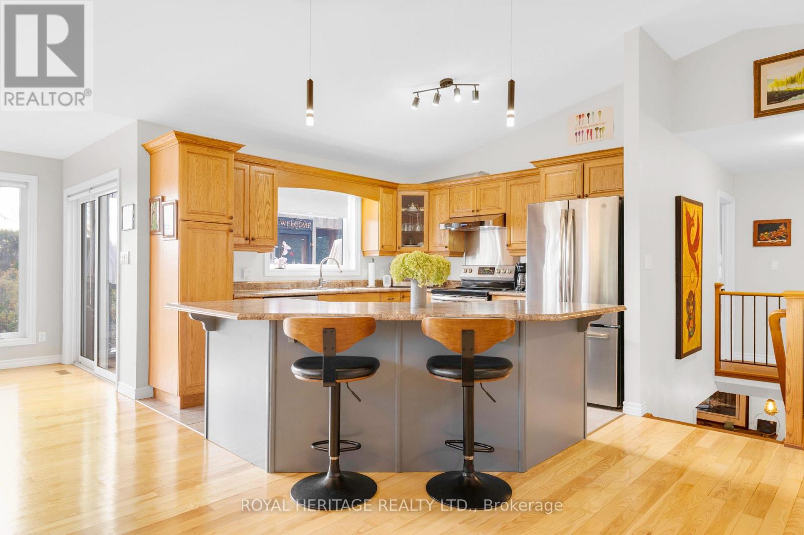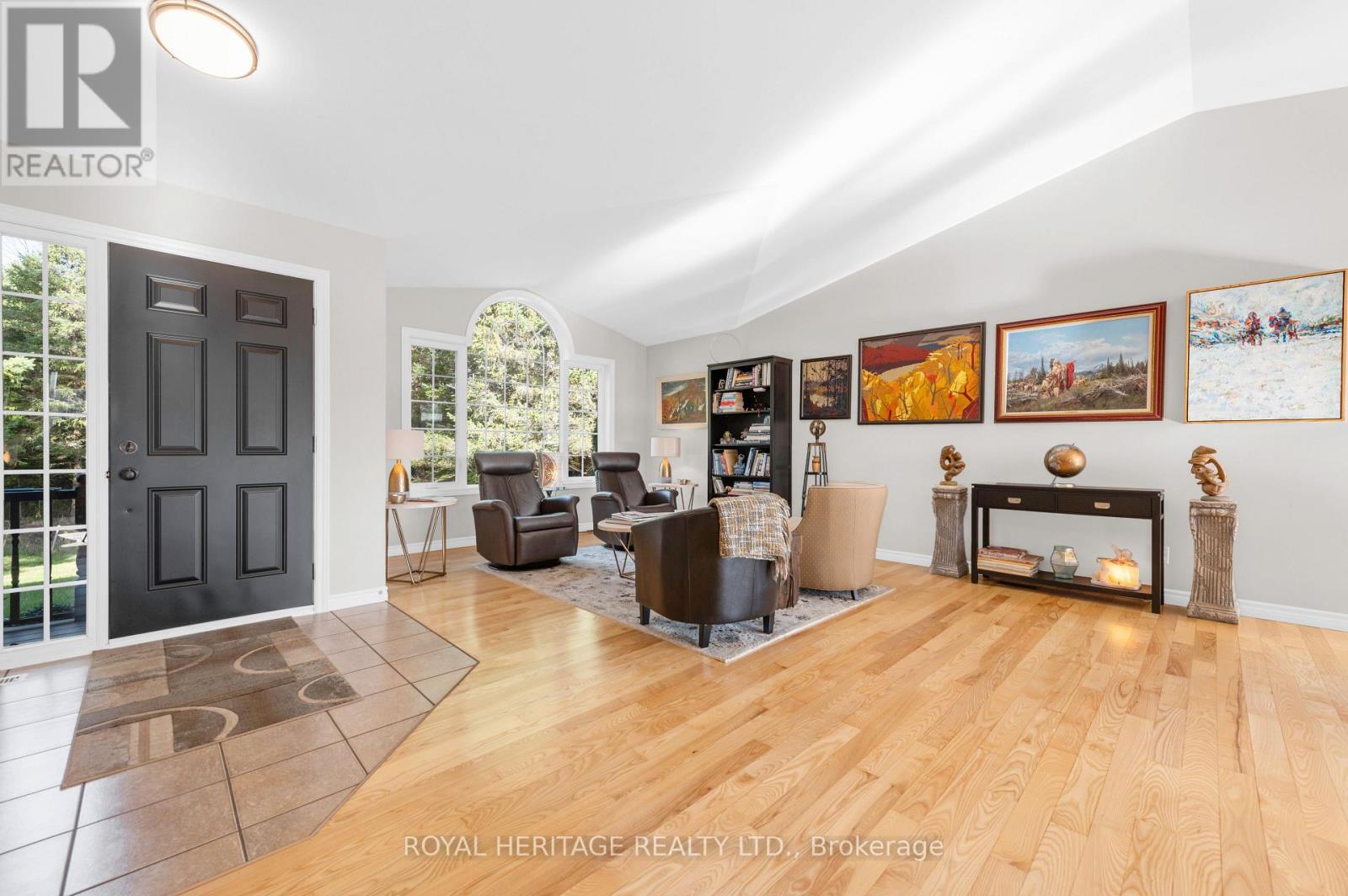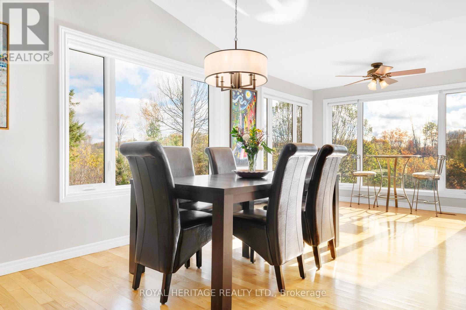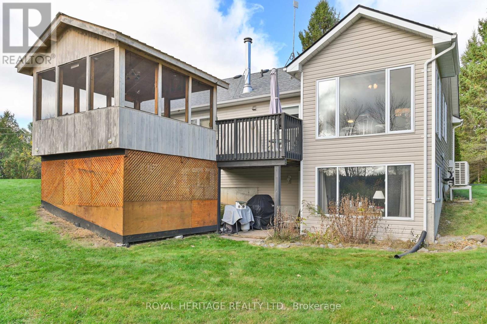 Nestled among mature trees and rolling hills, this custom-built bungalow offers the perfect blend of comfort, privacy, and natural beauty on over 5.5 scenic acres. Step inside to a bright, vaulted great room featuring gleaming hardwood floors, a spacious dining area ideal for family gatherings, and a large entertainer's island overlooking the inviting sunroom lounge. Enjoy your morning coffee or evening stargazing from the deck and screened gazebo-a serene escape surrounded by nature. The main floor features a spacious primary bedroom with double closets, a beautifully appointed shared main bath, and a generous second bedroom. Convenient main floor laundry and mudroom provide direct access to the oversized, insulated garage-perfect for hobbyists or extra storage. The finished lower level offers incredible flexibility with in-law or guest suite potential. The L-shaped family room includes a sunny sitting area and a walkout to the yard, plus a third bedroom with ensuite access to a full 3-piece bathroom. A large storage room and utility space complete this level. Outside, enjoy your own private retreat with mixed woodlands, a meandering creek, and endless opportunities to explore. The area offers beautiful trails for walking, ATVing, or snowmobiling, as well as nearby lakes and rivers perfect for boating, canoeing, and kayaking. (id:51158)