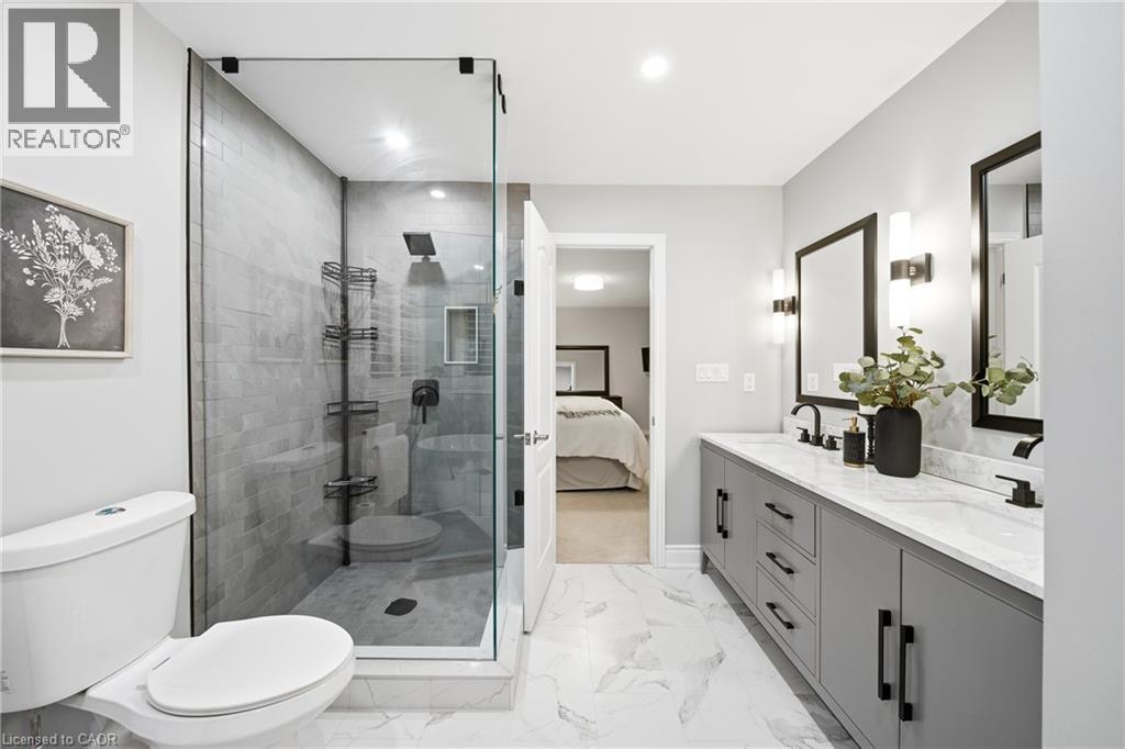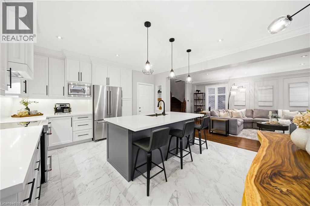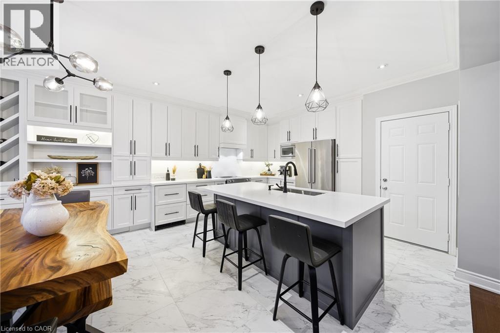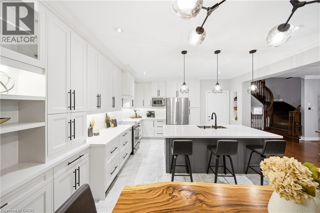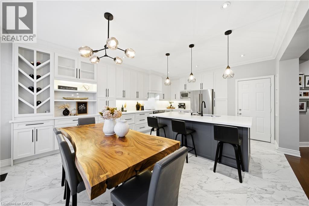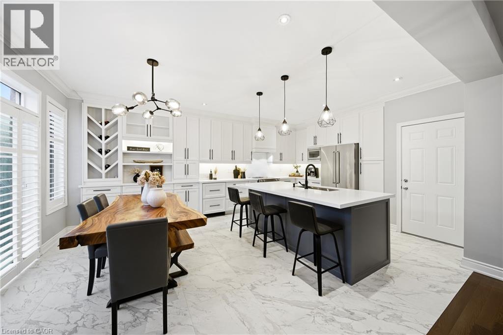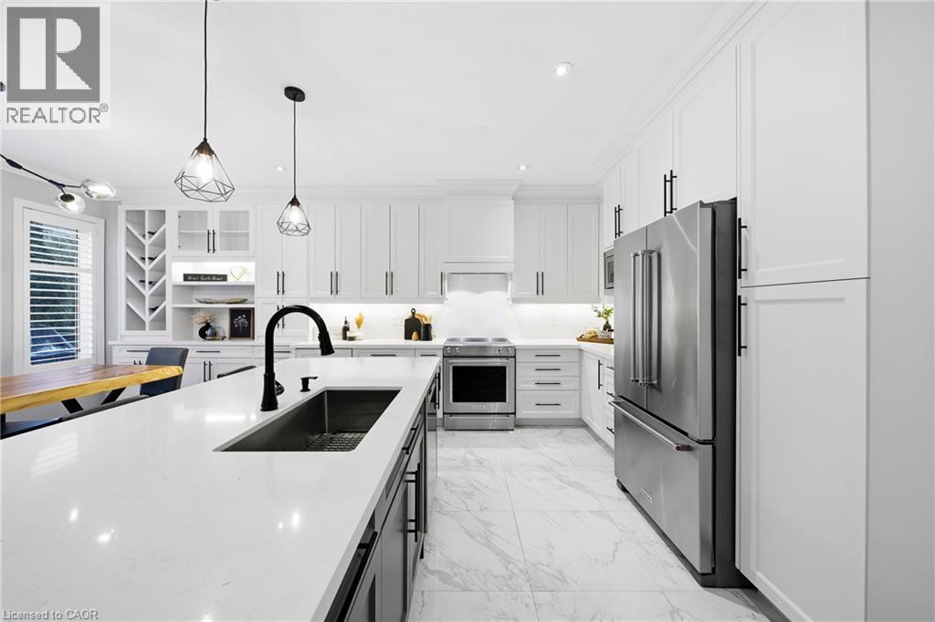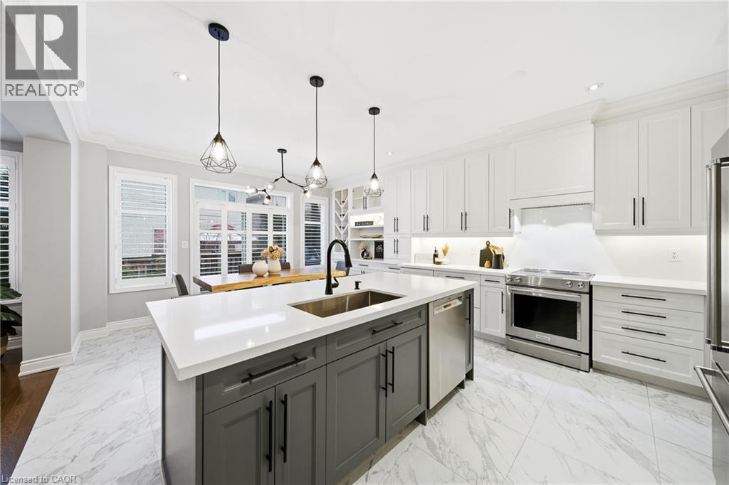 Move-in ready, beautifully styled 4+1 bed 3.5 bath home nestled on a quiet street in family-friendly Alton community. Exceptional curb appeal greets you with a stone exterior, refreshed landscaping, upgraded front door & garage doors (2025), and double garage. Inside, the home has been thoughtfully renovated and impeccably maintained. Main level showcases hardwood flooring, 9’ ceilings, potlights, upgraded light fixtures, shutters, elegant panel moulding, wainscoting, crown moulding and trim throughout. The inviting family room is anchored by a gas fireplace with a custom mantle and striking stone accent wall, offering a warm, stylish space to relax. The heart of the home is the custom-crafted, renovated eat-in kitchen, featuring built-in shelving, a large quartz island, SS appliances, gorgeous lighting and thoughtful storage—perfect for everyday living and entertaining. Newly renovated powder room and updated tile flooring in the front entry complete the main level. Upstairs, you’ll find 4 generously sized bedrooms, including a serene primary retreat with a walk-in closet and a beautifully renovated 5-pc ensuite (2025) featuring soaker tub & glass shower. Bedroom-level laundry adds everyday convenience. Professionally finished lower level extends your living space with a 5th bedroom complete with egress window, an updated full bathroom, ample storage and a dedicated theatre area with 9.2 surround sound wiring—ideal for movie nights, guests, or a teen retreat. Step outside to enjoy a deck off the kitchen for barbecuing and a private backyard with stone patio, interlock, and low-voltage landscape lighting front and back. A three-zone irrigation system keeps the grounds lush and low maintenance. Additional peace-of-mind upgrades include a roof with upgraded insulation (2022), furnace and A/C (2021), and hot water heater (2024). Close to top-rated schools, parks, shopping, GO Transit and easy access to hwys 407 & QEW, this exceptional home truly checks all the boxes. (id:51158)