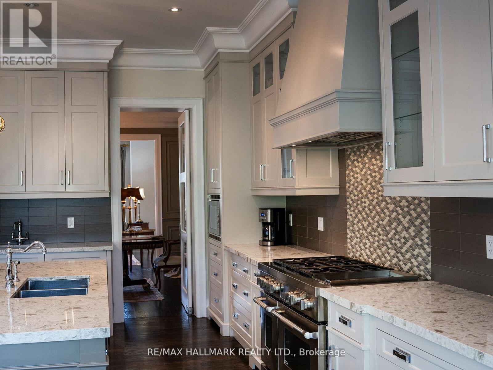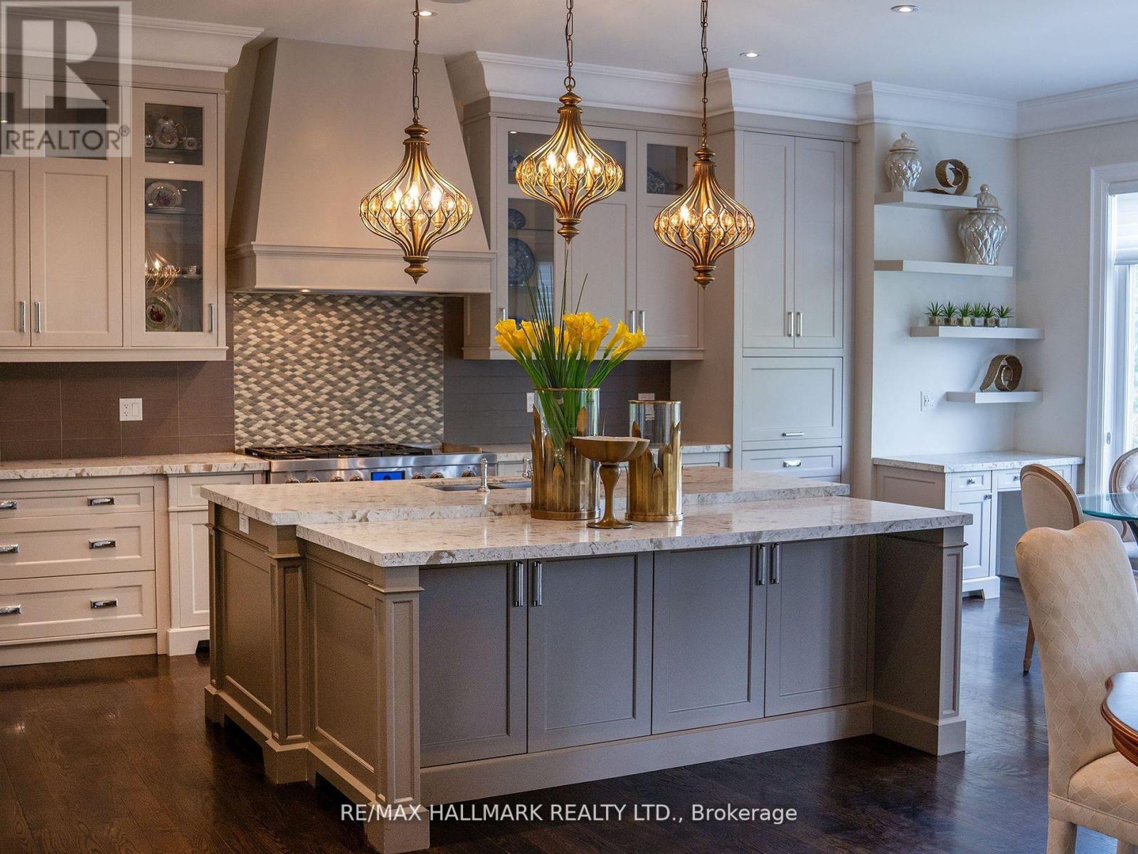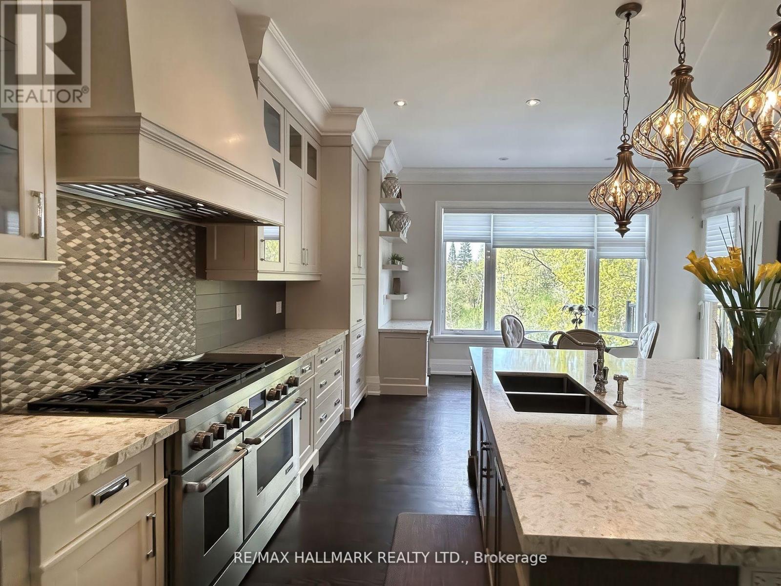Luxury residence nestled in one of Richmond Hill's most prestigious enclaves. This architecturally stunning estate offers just under 6,000 square feet of impeccably finished living space, including a thoughtfully designed lower level, blending timeless elegance with modern sophistication. Every detail of this custom-built home has been meticulously curated. The main level features 11-foot ceilings, complemented by floor-to-ceiling windows that flood the interiors with natural light. The lower level mirrors this grandeur with 11-foot ceilings of its own, elevated 10 feet above grade to maximize brightness and livability. At the heart of the home lies a state-of-the-art gourmet kitchen, appointed with top-tier appliances, exquisite custom cabinetry, and luxurious countertops. A full second kitchen on the lower level adds functionality for extended family living or seamless entertaining. The residence is adorned with natural marble tile flooring , while heated floors span most bathrooms and the entire basement level, ensuring year-round comfort. Bathrooms are outfitted with imported, top-tier European plumbing fixtures and custom-designed vanity furniture, epitomizing understated luxury. Elegance continues with carefully crafted fireplaces, bespoke millwork, and refined finishes throughout. The attention to craftsmanship is evident in every space, from the principal rooms to the private retreats. Practicality meets design with a private garage accommodating three vehicles one tandem space at the front and two additional at the rear offering convenience without compromising aesthetics. The home is perfectly positioned on a serene ravine lot, offering tranquil views and a sense of seclusion, while remaining minutes from top-ranked schools, premier golf courses, fine dining, shopping, and quick access to Highways 407 and 404. (id:51158)