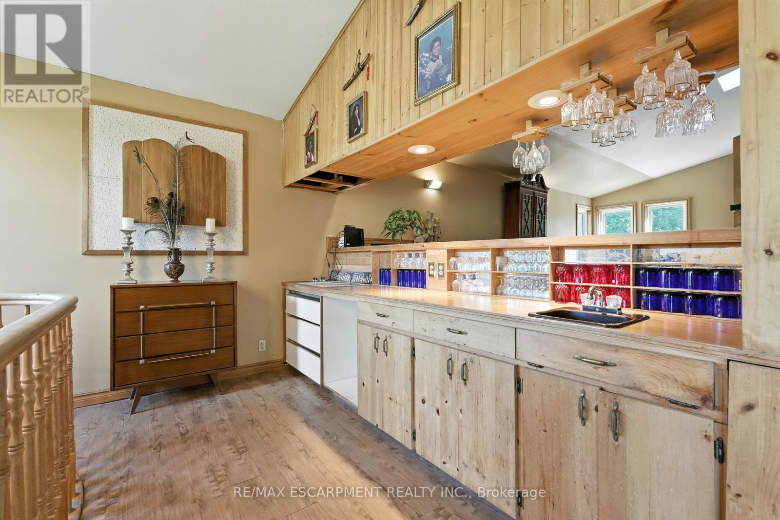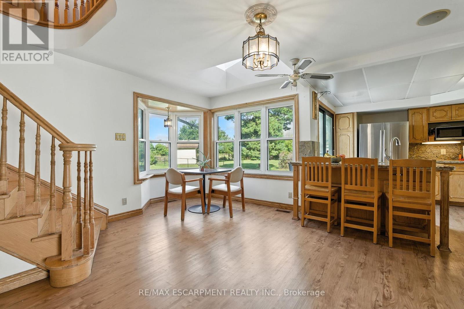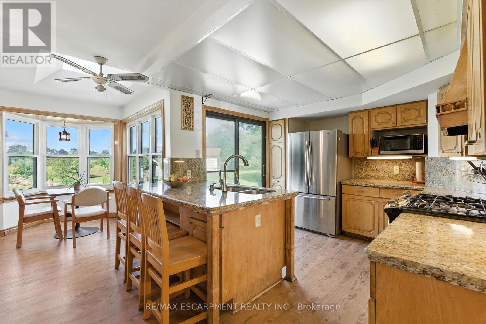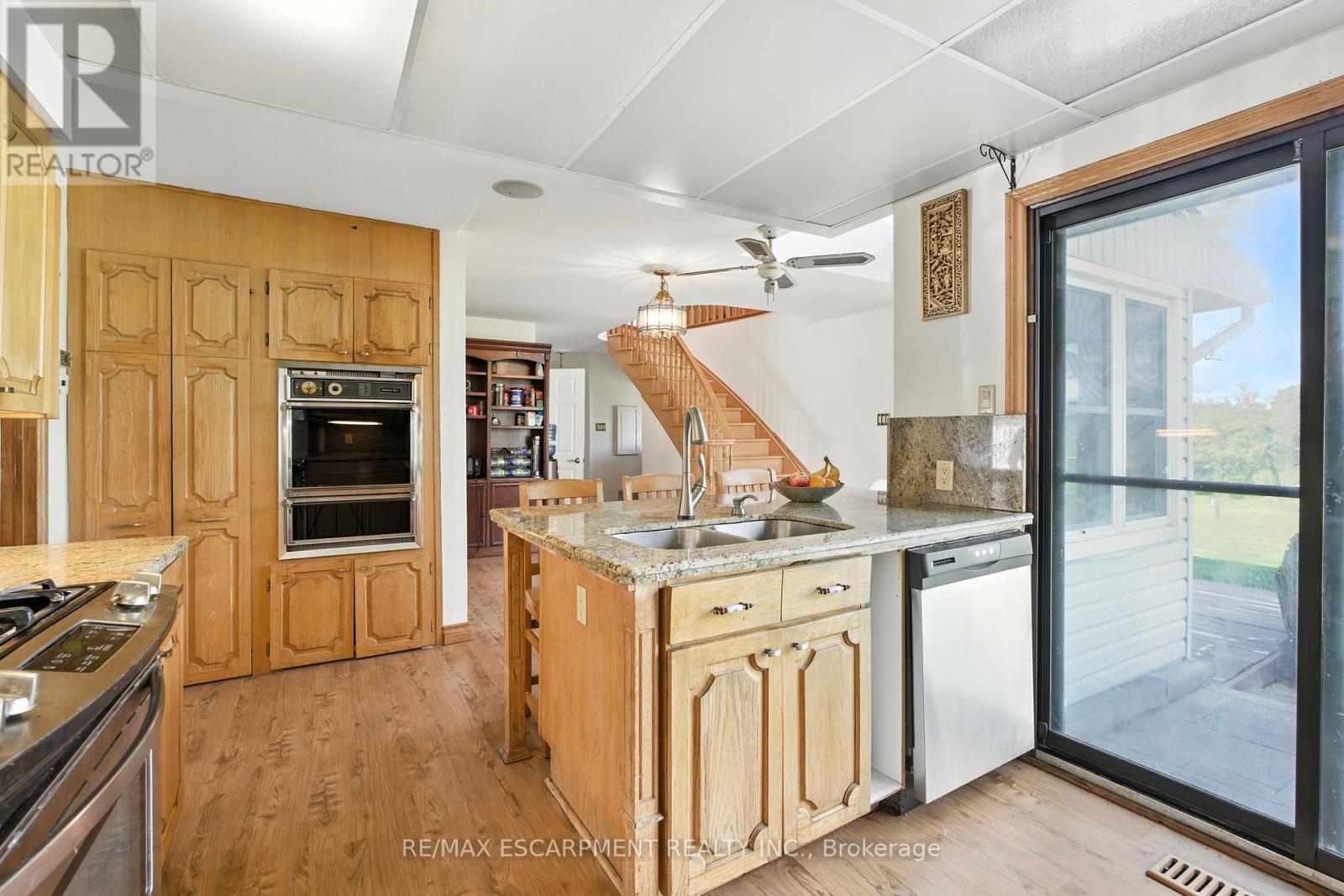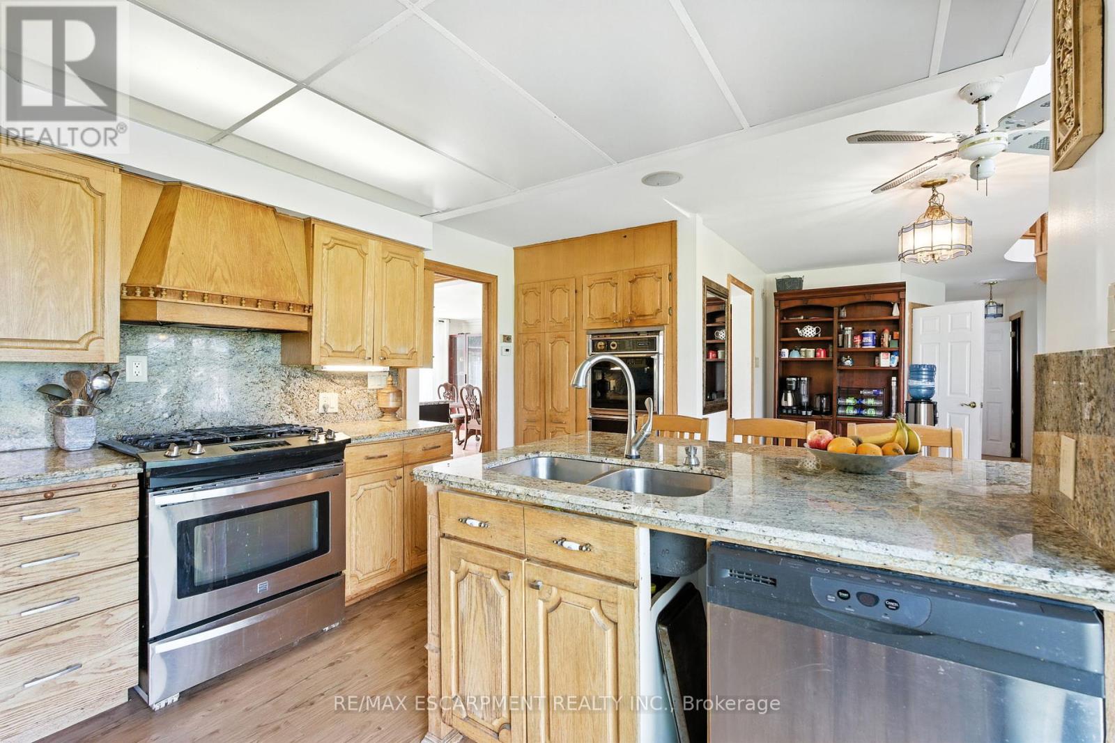 Bring your vision and creativity to this incredibly spacious and unique two-storey home on a premium 100' x 150' lot backing onto open fields! Offering over 3,500 square feet of living space, this one-of-a-kind and functional layout has amazing potential for a multi-generational setup. The main level features a large eat-in kitchen with granite countertops and gas stove, three generously sized bedrooms, main-floor laundry, and oversized living spaces throughout. The upper level is home to a massive primary suite with ensuite - perfect for a private retreat and family room with high ceilings and a wet bar. All rooms are impressively sized, offering endless renovation opportunities. Located just minutes to Dundas, Waterdown, Burlington, Hamilton, major highways and the GO Station - this is a fabulous location to invest in and transform into your dream home! RSA. (id:51158)