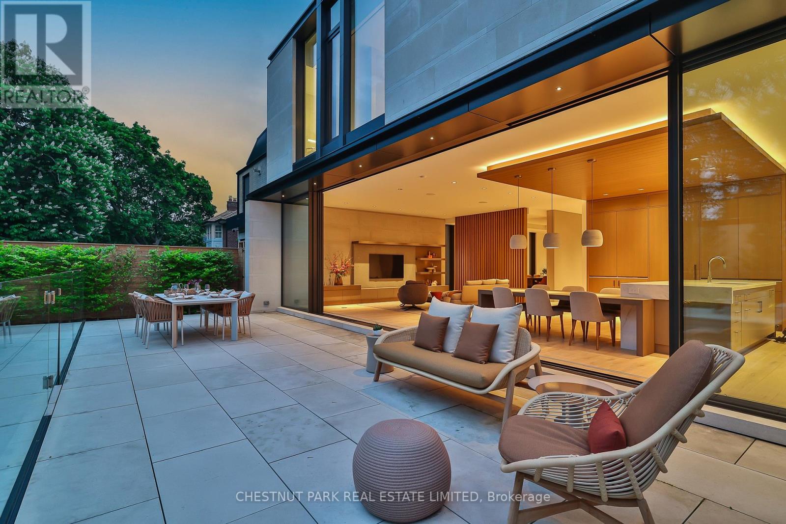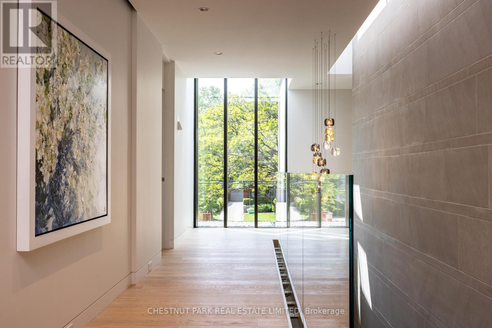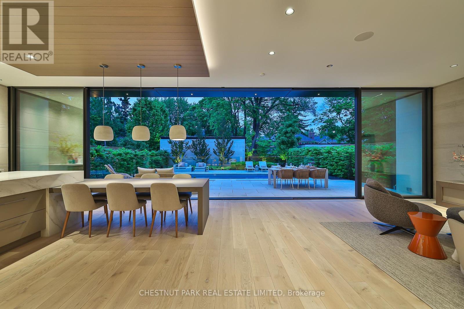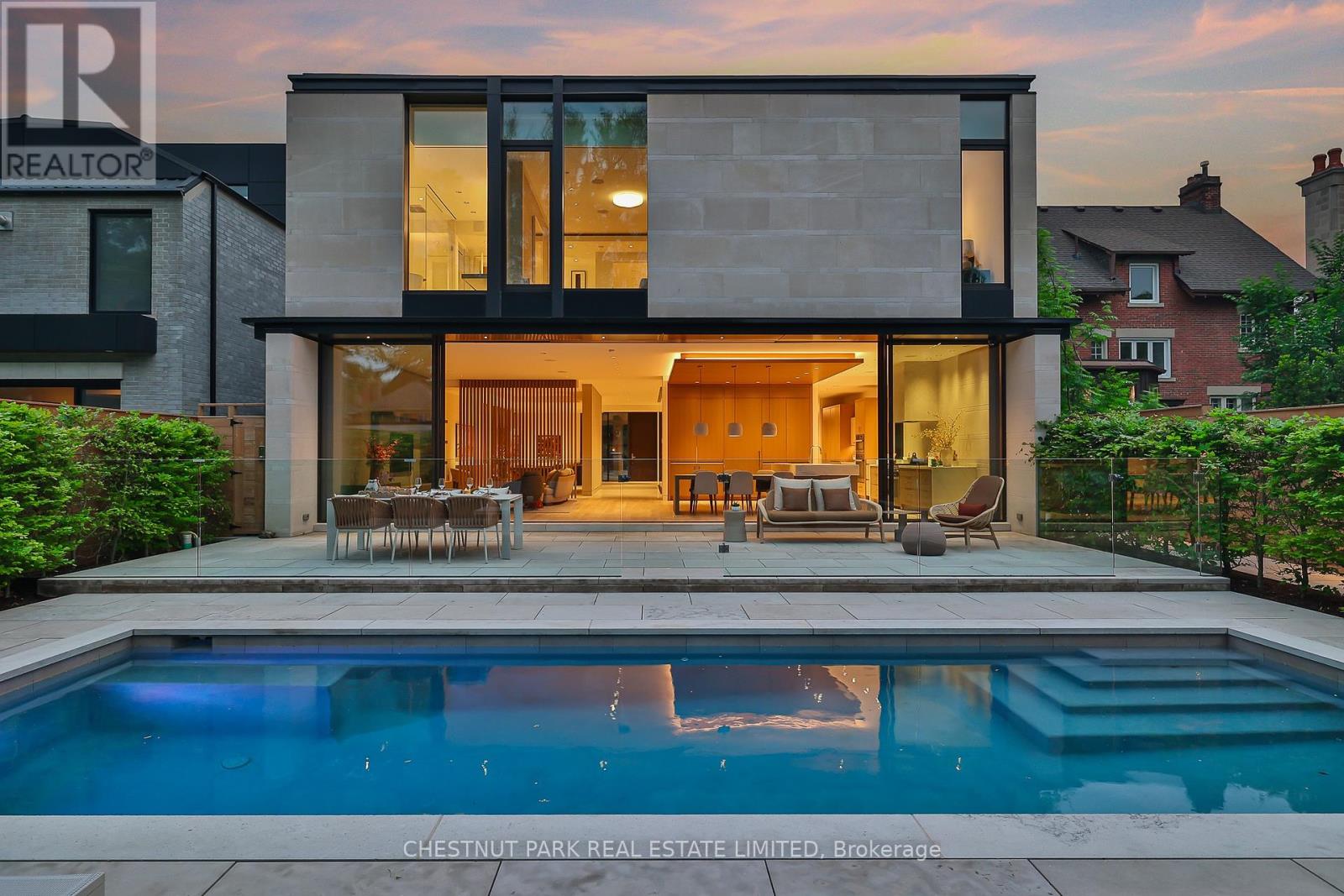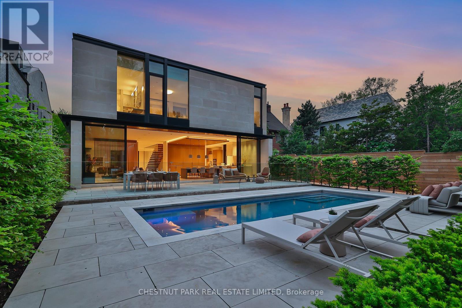 Infinity House is a masterclass in contemporary architecture - custom-built with state-of-the-art construction techniques and details to deliver a true high-performance house. This luxury home, with 4+1 bedrooms & 8 bathrooms (7,655 sf in total), offers the discerning buyer meticulously conceived interiors that harmonize natural materials with modern elements for the utmost in refined living. This coveted North Toronto location, with its unique blvd & mature tree canopy, is within walking distance to Yonge Lawrence Village & the greens of Rosedale Golf Club. Handcrafted bronze panels fronting the house signal a sublime presence on the street. The entry gallery captures the eye with a stunning living room fireplace with marble slab surround & stairs floating between soaring glass panels & a limestone wall - a true feat of engineering. Reminiscent of the exterior cladding & projecting toward the sky, this imposing feature wall intentionally serves as a central visual anchor. The optimal interior layout flows effortlessly to the professionally designed exteriors through a one-of-a-kind NanaWall of sleek glass panels, welcoming an abundance of natural light. The open concept makes clever use of a floating slat wall to create a sense of division for the dining and living rooms without compromising the bright, airy feel. The family room & adjoining chef's kitchen with pantry & servery is the hub of the home overlooking the backyard oasis with heated pool, terraces & gardens. A study, two powder rooms & a mudroom complete the main level. An elevator opens onto a light-filled 2nd floor, illuminated by custom architectural glazing & leads to 4 bedrooms, including a luxurious primary suite, 4 bathrooms & a well-appointed laundry room. An expansive lower level includes a media/recreation room, custom bar, wine cellar, exercise room with spa steam bath, nanny suite with 3-pc & a 2nd laundry room. EXTRAS: radiant floors, elevator, snowmelt, 2 car heated garage w/lower storage. (id:51158)