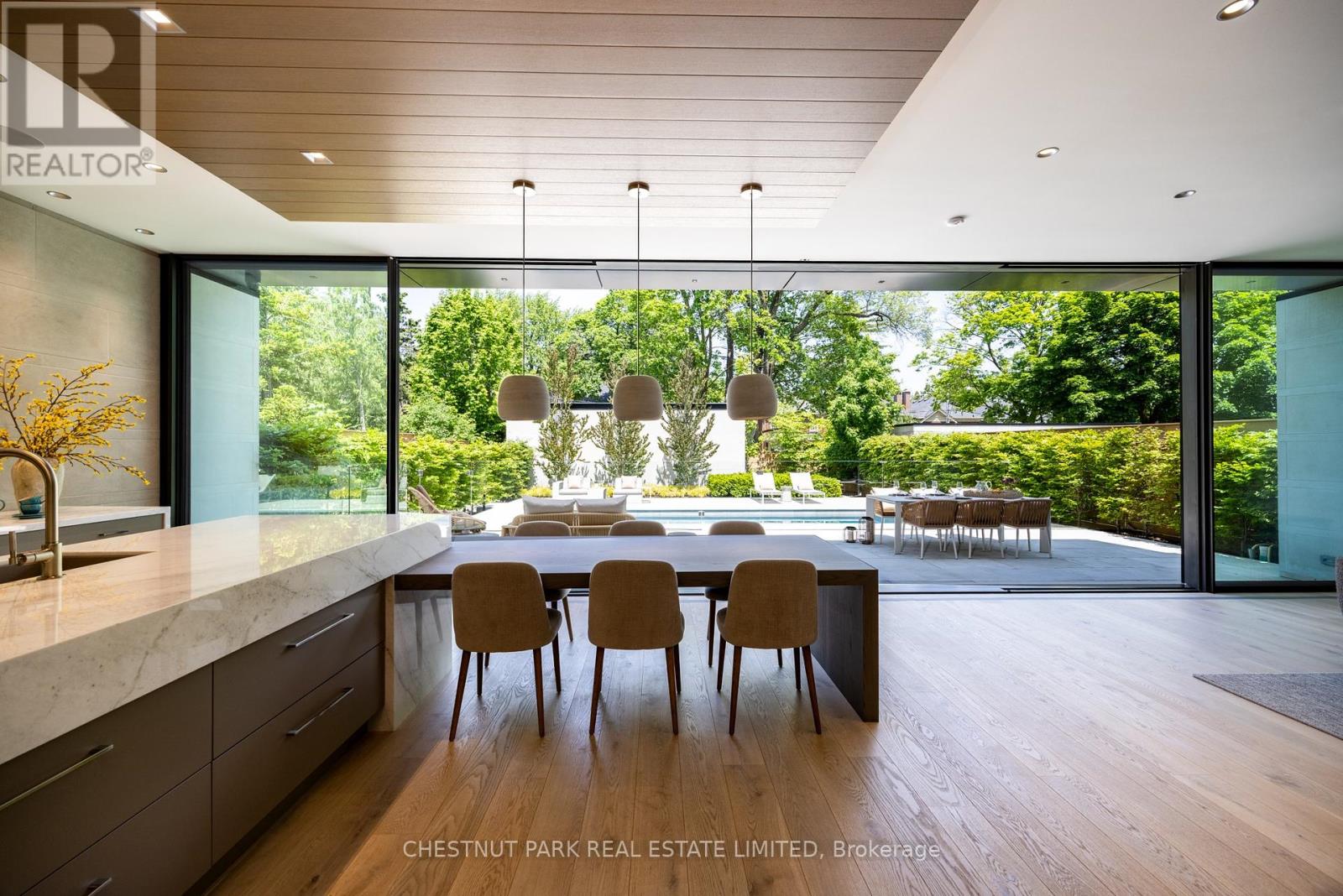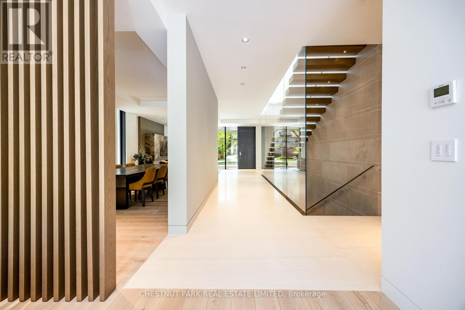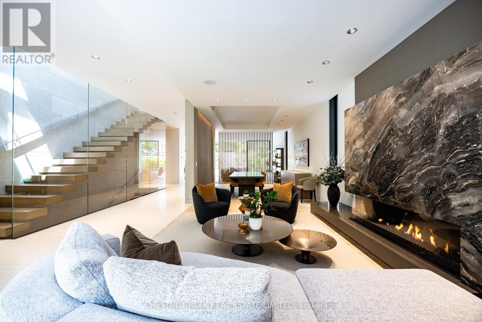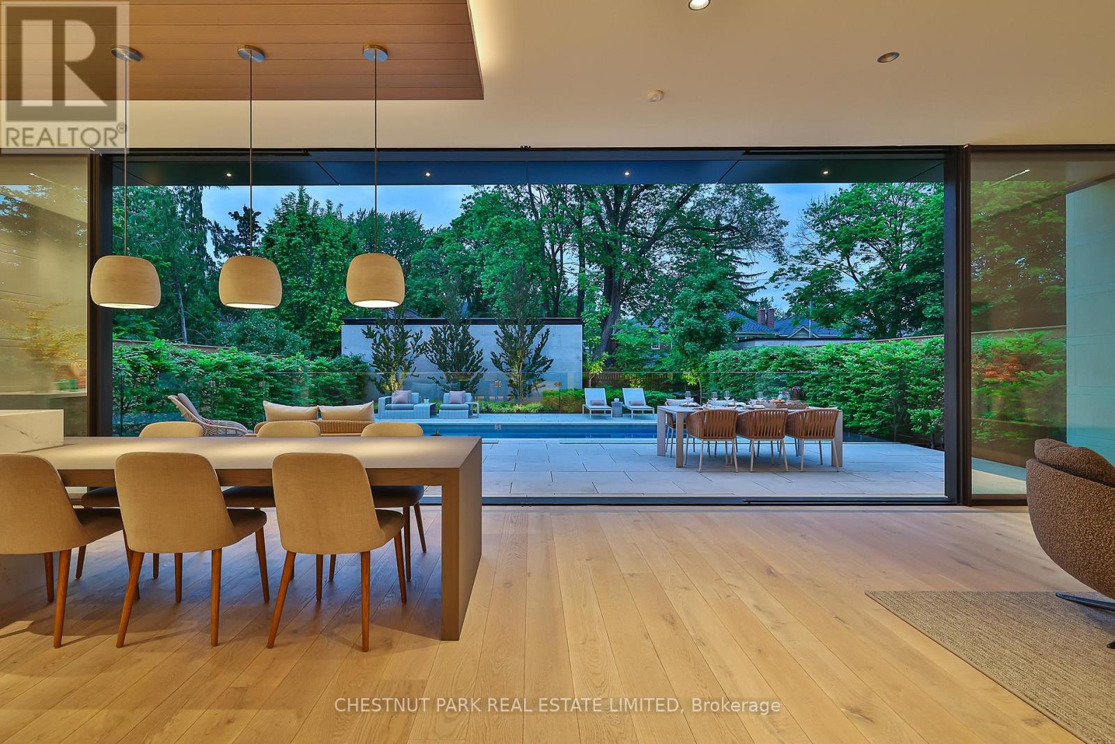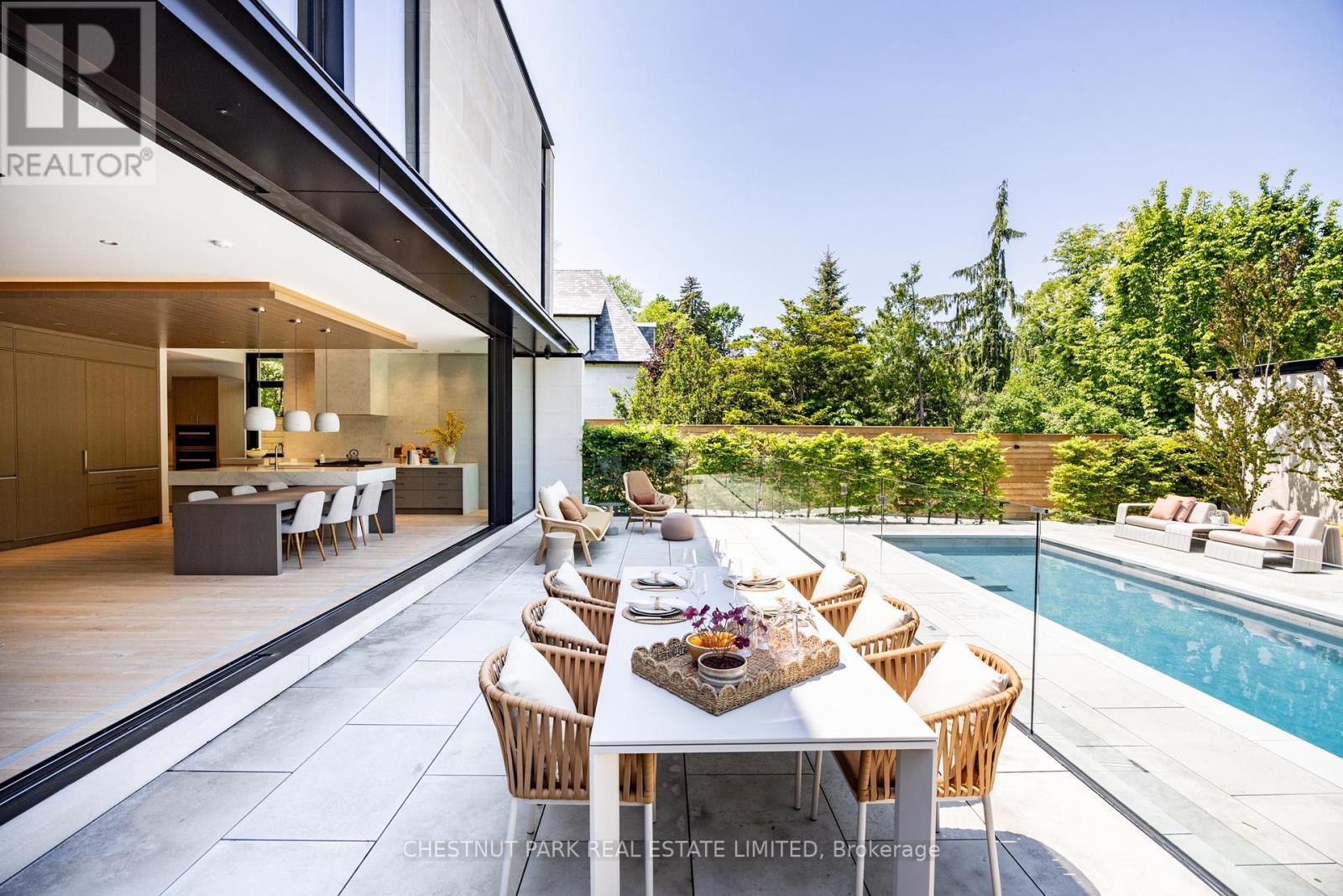 Infinity House is a masterclass in contemporary architecture - custom-built with state-of-the-art construction techniques and details to deliver a true high-performance house. This luxury home, with 4+1 bedrooms & 8 bathrooms (7,655 sf in total), offers the discerning buyer meticulously conceived interiors that harmonize natural materials with modern elements for the utmost in refined living. This coveted North Toronto location, with its unique blvd & mature tree canopy, is within walking distance to Yonge Lawrence Village & the greens of Rosedale Golf Club. Handcrafted bronze panels fronting the house signal a sublime presence on the street. The entry gallery captures the eye with a stunning living room fireplace with marble slab surround & stairs floating between soaring glass panels & a limestone wall - a true feat of engineering. Reminiscent of the exterior cladding & projecting toward the sky, this imposing feature wall intentionally serves as a central visual anchor. The optimal interior layout flows effortlessly to the professionally designed exteriors through a one-of-a-kind NanaWall of sleek glass panels, welcoming an abundance of natural light. The open concept makes clever use of a floating slat wall to create a sense of division for the dining and living rooms without compromising the bright, airy feel. The family room & adjoining chef's kitchen with pantry & servery is the hub of the home overlooking the backyard oasis with heated pool, terraces & gardens. A study, two powder rooms & a mudroom complete the main level. An elevator opens onto a light-filled 2nd floor, illuminated by custom architectural glazing & leads to 4 bedrooms, including a luxurious primary suite, 4 bathrooms & a well-appointed laundry room. An expansive lower level includes a media/recreation room, custom bar, wine cellar, exercise room with spa steam bath, nanny suite with 3-pc & a 2nd laundry room. EXTRAS: radiant floors, elevator, snowmelt, 2 car heated garage w/lower storage. (id:51158)