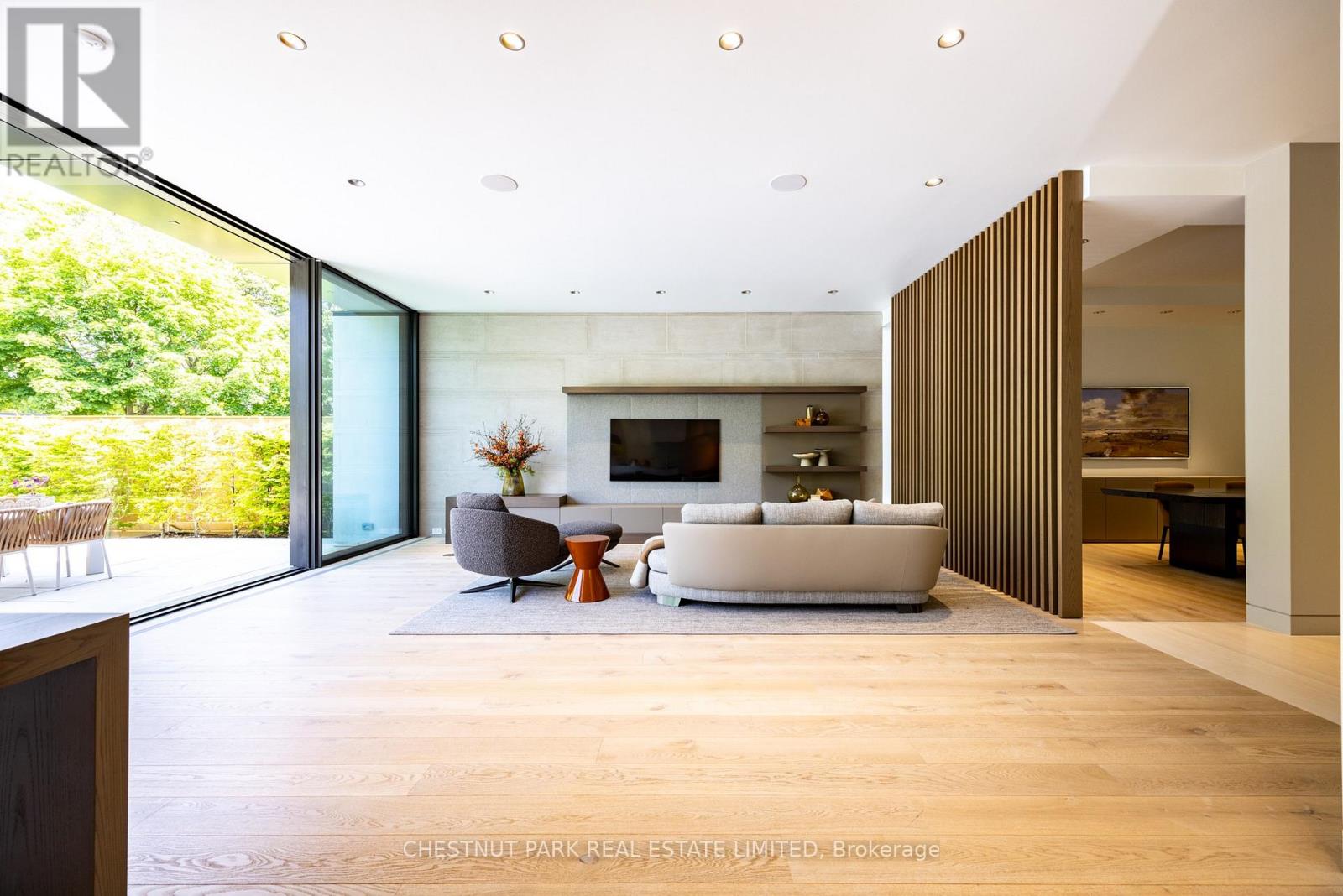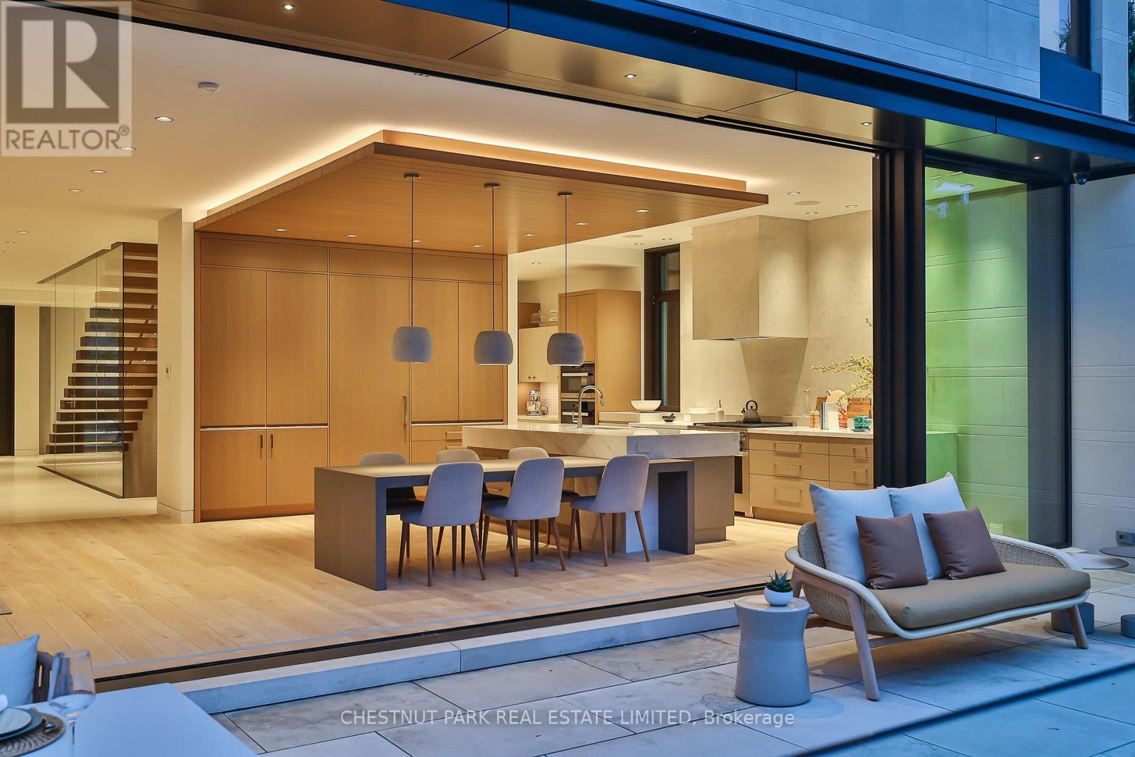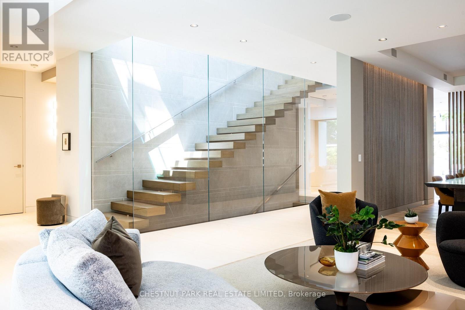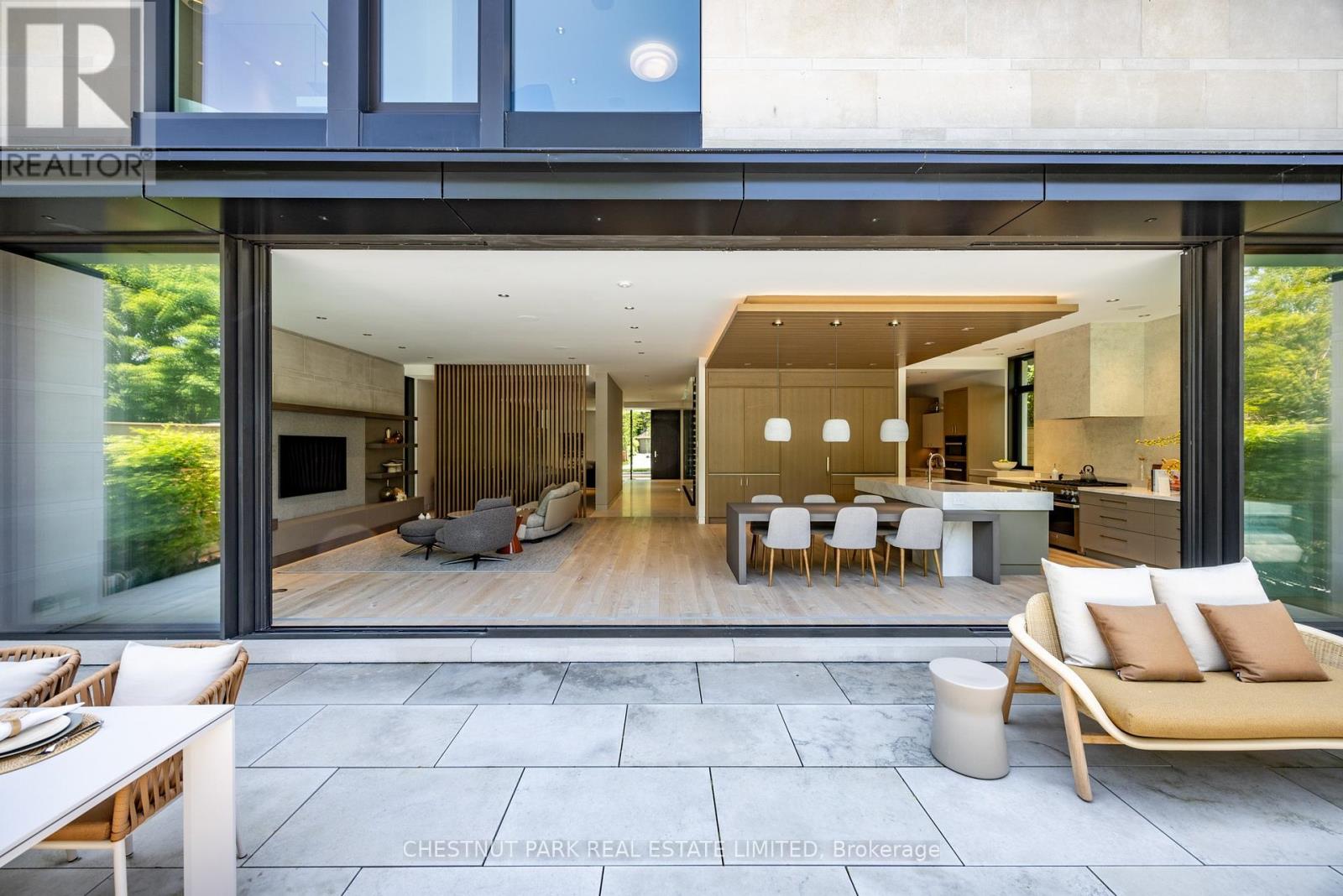 Infinity House is a masterclass in contemporary architecture - custom-built with state-of-the-art construction techniques and details to deliver a true high-performance house. This luxury home, with 4+1 bedrooms & 8 bathrooms (7,655 sf in total), offers the discerning buyer meticulously conceived interiors that harmonize natural materials with modern elements for the utmost in refined living. This coveted North Toronto location, with its unique blvd & mature tree canopy, is within walking distance to Yonge Lawrence Village & the greens of Rosedale Golf Club. Handcrafted bronze panels fronting the house signal a sublime presence on the street. The entry gallery captures the eye with a stunning living room fireplace with marble slab surround & stairs floating between soaring glass panels & a limestone wall - a true feat of engineering. Reminiscent of the exterior cladding & projecting toward the sky, this imposing feature wall intentionally serves as a central visual anchor. The optimal interior layout flows effortlessly to the professionally designed exteriors through a one-of-a-kind NanaWall of sleek glass panels, welcoming an abundance of natural light. The open concept makes clever use of a floating slat wall to create a sense of division for the dining and living rooms without compromising the bright, airy feel. The family room & adjoining chef's kitchen with pantry & servery is the hub of the home overlooking the backyard oasis with heated pool, terraces & gardens. A study, two powder rooms & a mudroom complete the main level. An elevator opens onto a light-filled 2nd floor, illuminated by custom architectural glazing & leads to 4 bedrooms, including a luxurious primary suite, 4 bathrooms & a well-appointed laundry room. An expansive lower level includes a media/recreation room, custom bar, wine cellar, exercise room with spa steam bath, nanny suite with 3-pc & a 2nd laundry room. EXTRAS: radiant floors, elevator, snowmelt, 2 car heated garage w/lower storage. (id:51158)