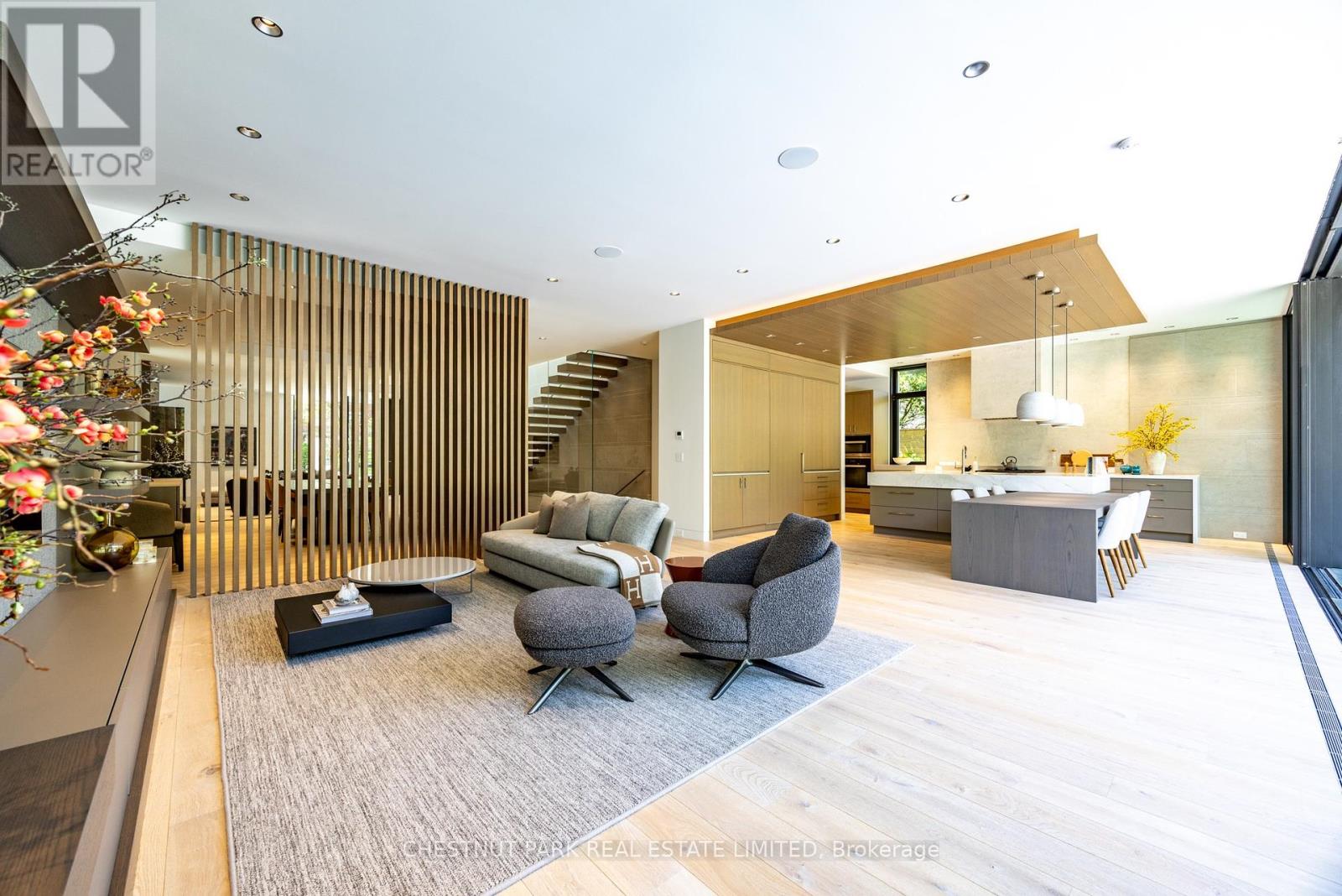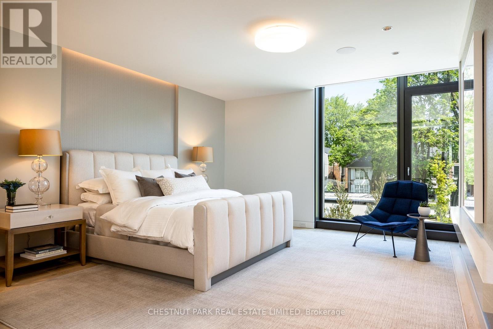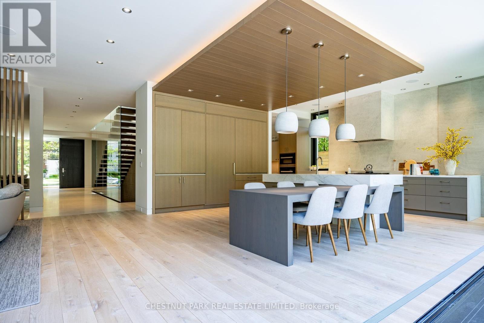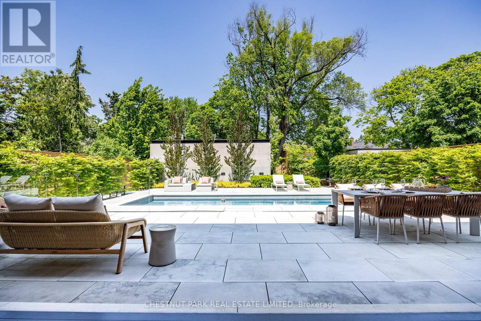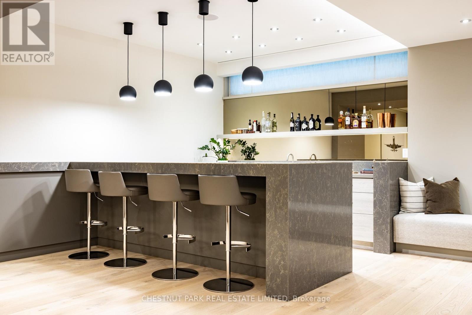 Infinity House is a masterclass in contemporary architecture - custom-built with state-of-the-art construction techniques and details to deliver a true high-performance house. This luxury home, with 4+1 bedrooms & 8 bathrooms (7,655 sf in total), offers the discerning buyer meticulously conceived interiors that harmonize natural materials with modern elements for the utmost in refined living. This coveted North Toronto location, with its unique blvd & mature tree canopy, is within walking distance to Yonge Lawrence Village & the greens of Rosedale Golf Club. Handcrafted bronze panels fronting the house signal a sublime presence on the street. The entry gallery captures the eye with a stunning living room fireplace with marble slab surround & stairs floating between soaring glass panels & a limestone wall - a true feat of engineering. Reminiscent of the exterior cladding & projecting toward the sky, this imposing feature wall intentionally serves as a central visual anchor. The optimal interior layout flows effortlessly to the professionally designed exteriors through a one-of-a-kind NanaWall of sleek glass panels, welcoming an abundance of natural light. The open concept makes clever use of a floating slat wall to create a sense of division for the dining and living rooms without compromising the bright, airy feel. The family room & adjoining chef's kitchen with pantry & servery is the hub of the home overlooking the backyard oasis with heated pool, terraces & gardens. A study, two powder rooms & a mudroom complete the main level. An elevator opens onto a light-filled 2nd floor, illuminated by custom architectural glazing & leads to 4 bedrooms, including a luxurious primary suite, 4 bathrooms & a well-appointed laundry room. An expansive lower level includes a media/recreation room, custom bar, wine cellar, exercise room with spa steam bath, nanny suite with 3-pc & a 2nd laundry room. EXTRAS: radiant floors, elevator, snowmelt, 2 car heated garage w/lower storage. (id:51158)