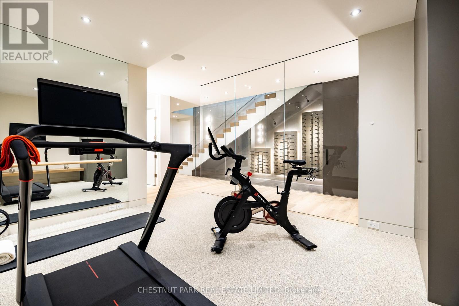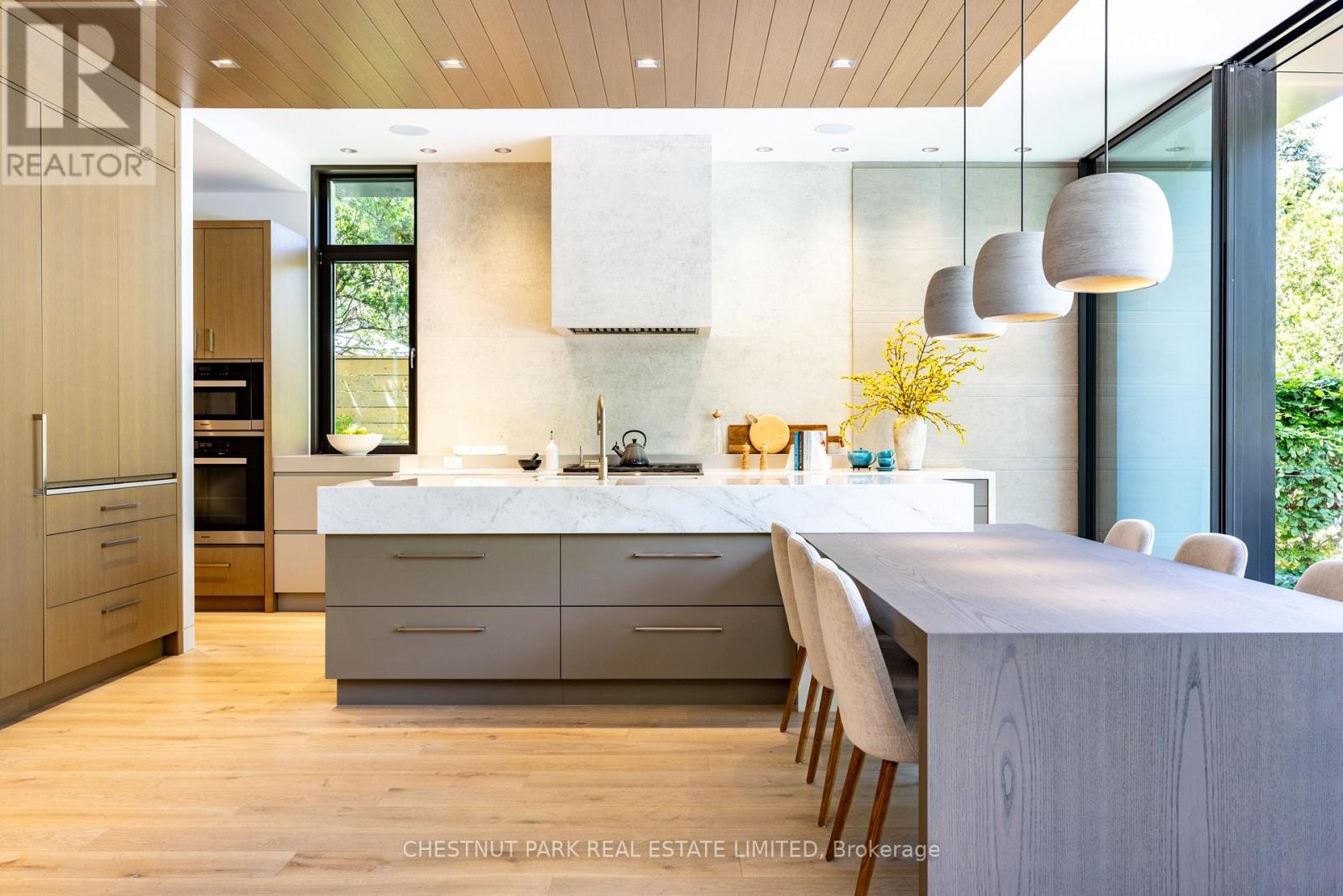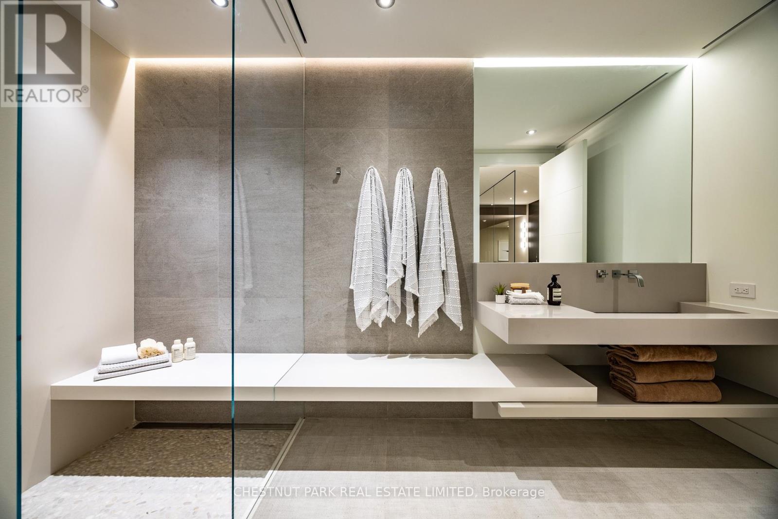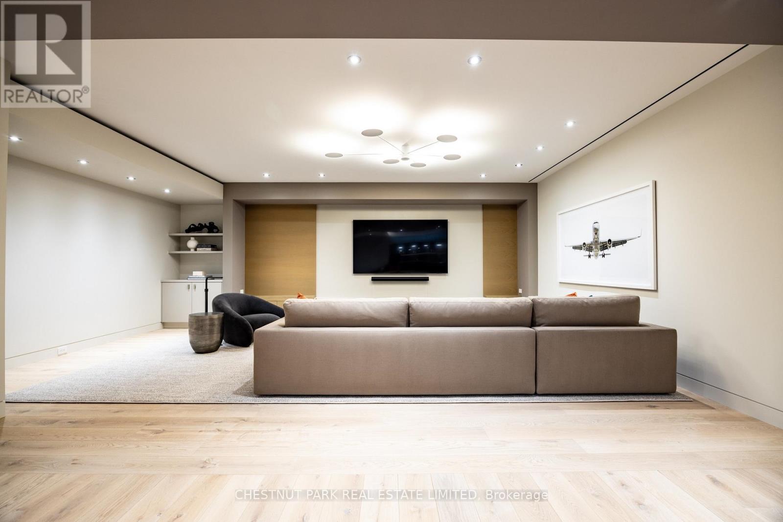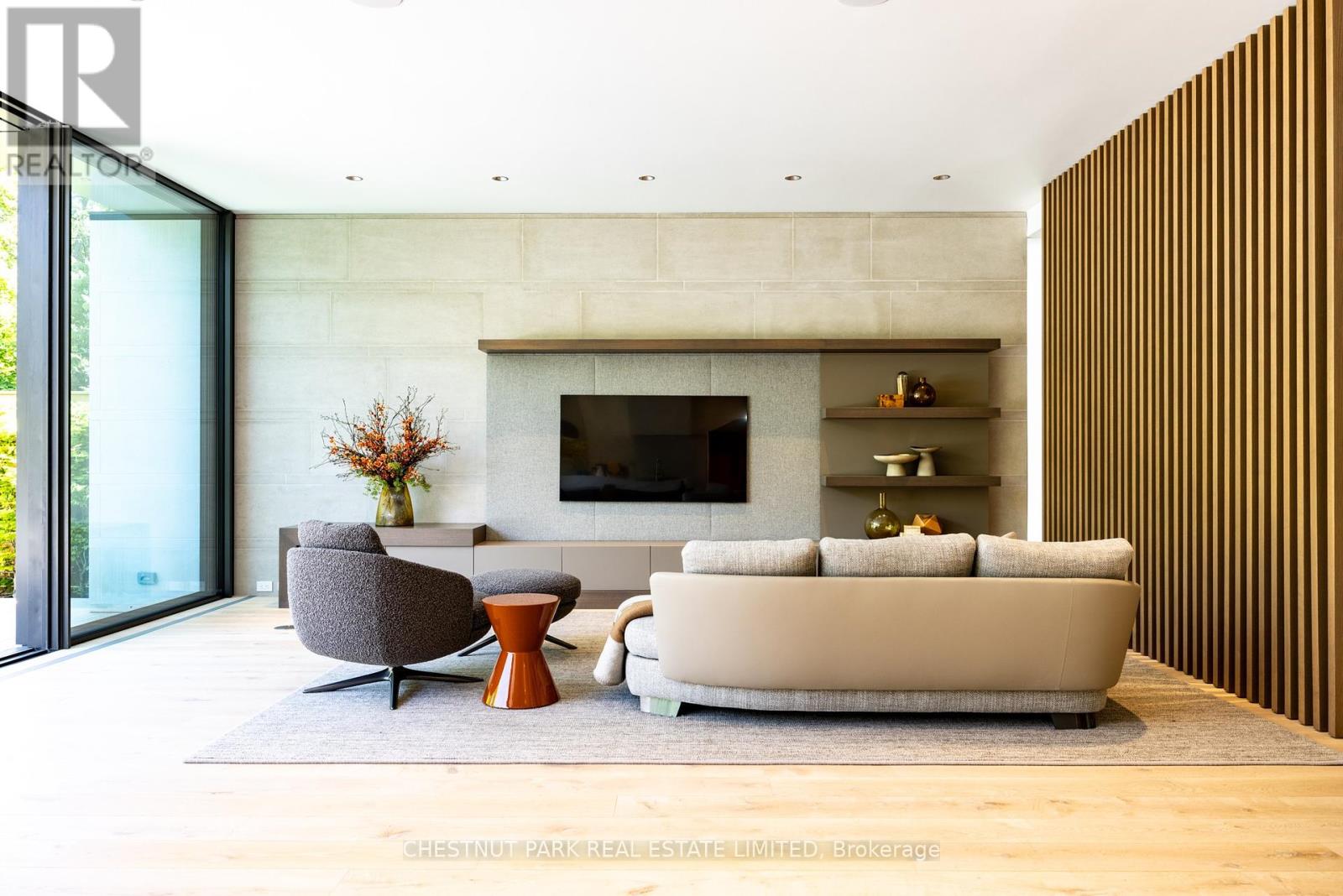 Infinity House is a masterclass in contemporary architecture - custom-built with state-of-the-art construction techniques and details to deliver a true high-performance house. This luxury home, with 4+1 bedrooms & 8 bathrooms (7,655 sf in total), offers the discerning buyer meticulously conceived interiors that harmonize natural materials with modern elements for the utmost in refined living. This coveted North Toronto location, with its unique blvd & mature tree canopy, is within walking distance to Yonge Lawrence Village & the greens of Rosedale Golf Club. Handcrafted bronze panels fronting the house signal a sublime presence on the street. The entry gallery captures the eye with a stunning living room fireplace with marble slab surround & stairs floating between soaring glass panels & a limestone wall - a true feat of engineering. Reminiscent of the exterior cladding & projecting toward the sky, this imposing feature wall intentionally serves as a central visual anchor. The optimal interior layout flows effortlessly to the professionally designed exteriors through a one-of-a-kind NanaWall of sleek glass panels, welcoming an abundance of natural light. The open concept makes clever use of a floating slat wall to create a sense of division for the dining and living rooms without compromising the bright, airy feel. The family room & adjoining chef's kitchen with pantry & servery is the hub of the home overlooking the backyard oasis with heated pool, terraces & gardens. A study, two powder rooms & a mudroom complete the main level. An elevator opens onto a light-filled 2nd floor, illuminated by custom architectural glazing & leads to 4 bedrooms, including a luxurious primary suite, 4 bathrooms & a well-appointed laundry room. An expansive lower level includes a media/recreation room, custom bar, wine cellar, exercise room with spa steam bath, nanny suite with 3-pc & a 2nd laundry room. EXTRAS: radiant floors, elevator, snowmelt, 2 car heated garage w/lower storage. (id:51158)