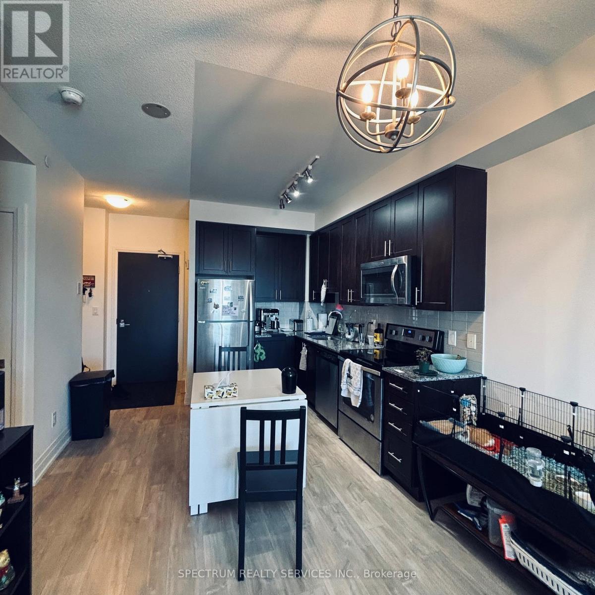 Welcome to Centro Condos! Convenience at its finest! All shopping is right out your front door! Movie theatre, restaurants, transportation, grocery anything you need, is a step away! Spacious open-concept layout: kitchen, dining, living flow together. Ideal for entertaining or for a more airy feel. Big windows letting in natural light, especially since its south-facing. Expect bright mornings & sunny afternoons. Stylish finishes: laminate floors throughout, modern cabinetry, granite counters in the kitchen with stainless steel appliances. Bedroom sized well enough for a queen bed plus room left over, with a semi walk-in closet and large window. One modern bathroom with tile around shower/tub, completed with upgraded fixtures. South facing balcony excellent light, and pleasant views of cityscape and greenery. Ensuite washer and dryer with underground parking! Amenities / Building Features24-hour concierge / security, Fitness Centre / gym, Indoor pool, plus a hot tub, sauna, steam room. Multi-purpose / party room for hosting guests, Outdoor terrace/rooftop space, with BBQs and lounge seating. Virtual golf, virtual simulators, games rooms, media rooms, Visitor parking / guest suites, Locker storage (underground), Underground parking for your car. Close proximity to transit (Bus / VRT / Viva / TTC extensions), shops, groceries, restaurants. (id:51158)