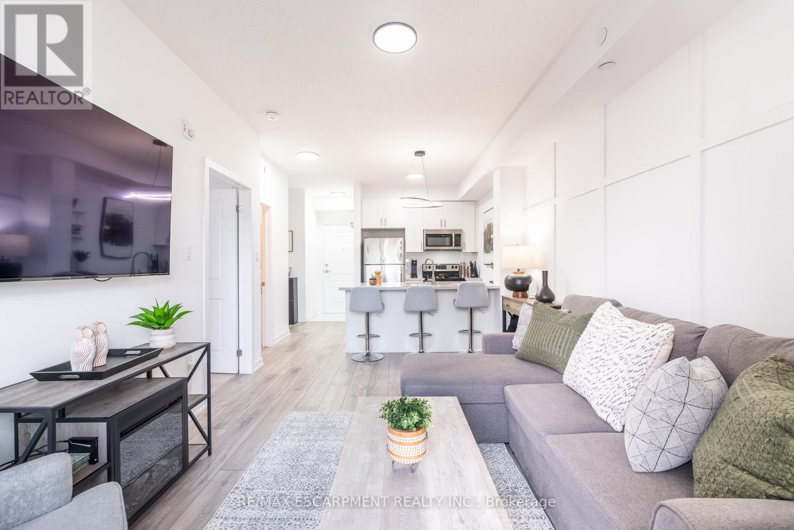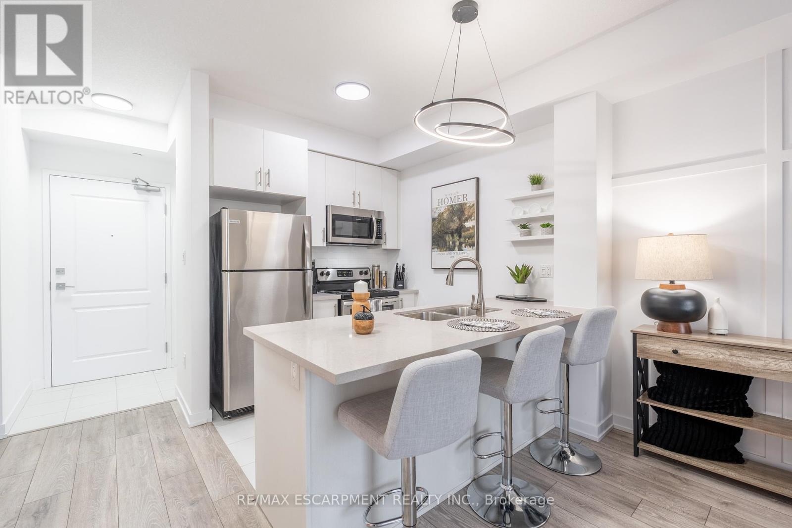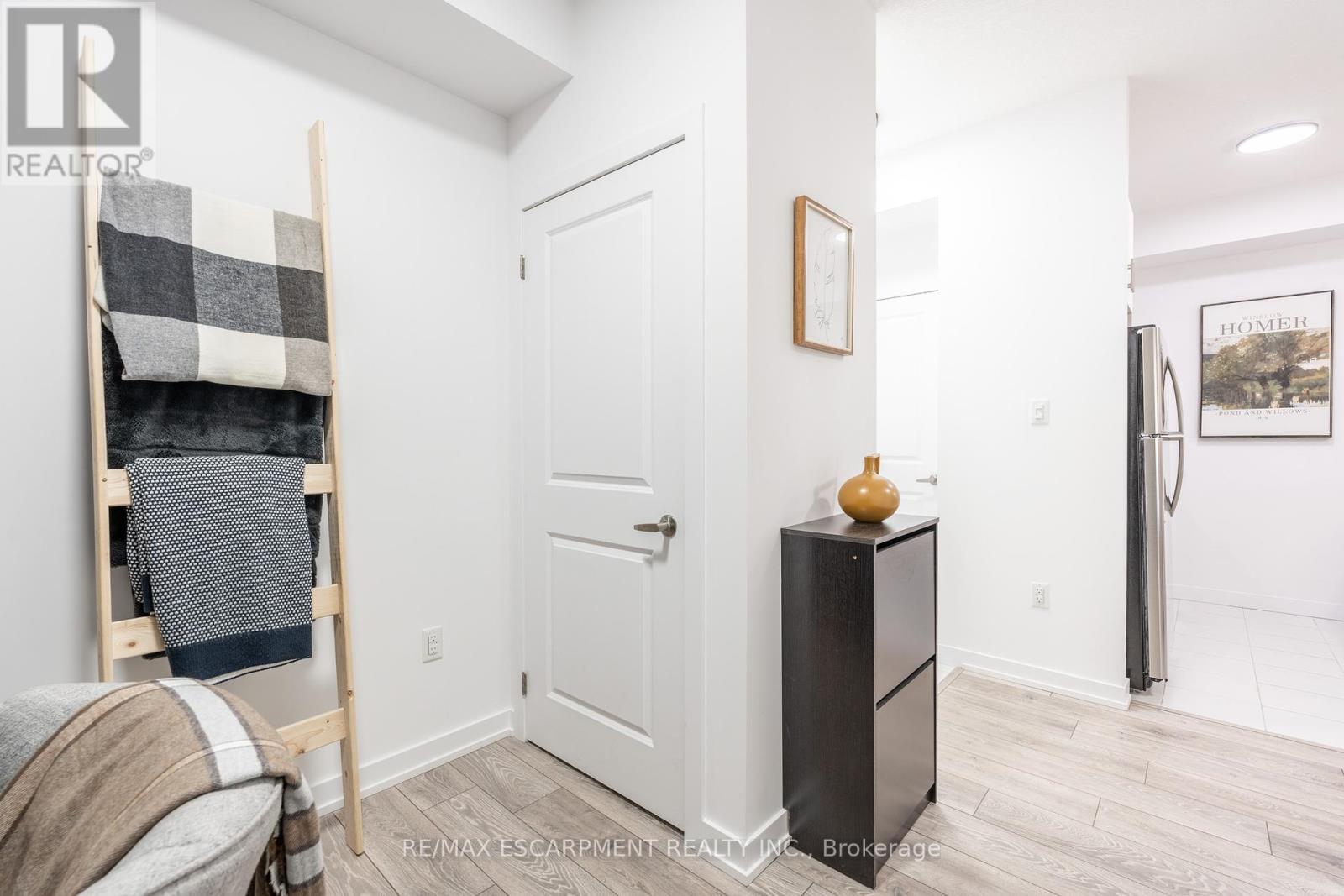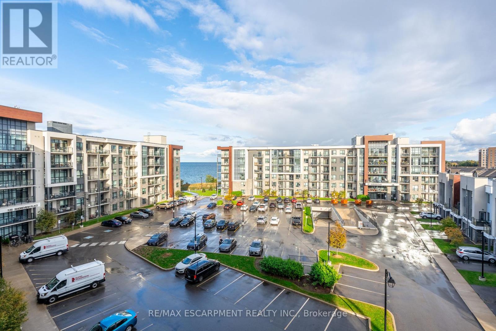 $536.93 MonthlyThis 668 square foot lakeside condo in the Community Beach area of Stoney Creek combines style and convenience. It features a bright, open layout with one bedroom and a flexible den- perfect for a home office or reading nook. The modern kitchen is equipped with quartz countertops, subway tile backsplash and stainless-steel appliances, while the living room is highlighted by a stylish feature wall. The primary bedroom comes with a walk-in closet and ceiling fan and the bathroom includes a quartz vanity. Not to be missed are the updated light fixtures, laminate floors that provide warmth and ease of maintenance, and floor-to-ceiling windows providing loads of natural sunlight. Step out onto your private balcony where you can take in views of Lake Ontario. Residents can enjoy building amenities such as a rooftop patio, gym, and a party room for gatherings. This unit comes with one underground parking space and one locker. You'll love the location being able to walk along the waterfront, going to the beach and parks and quick access to the highway. RSA. (id:51158)