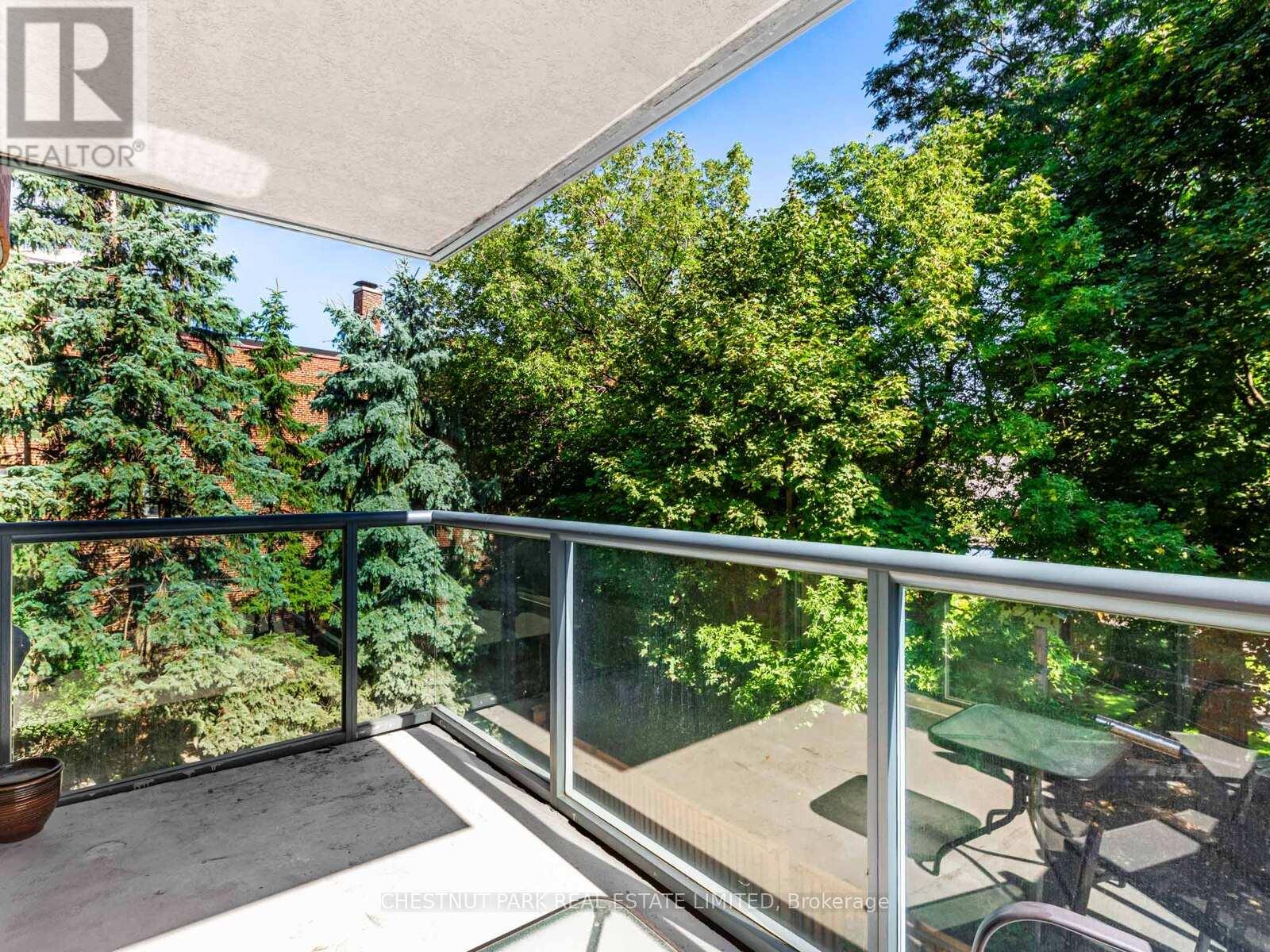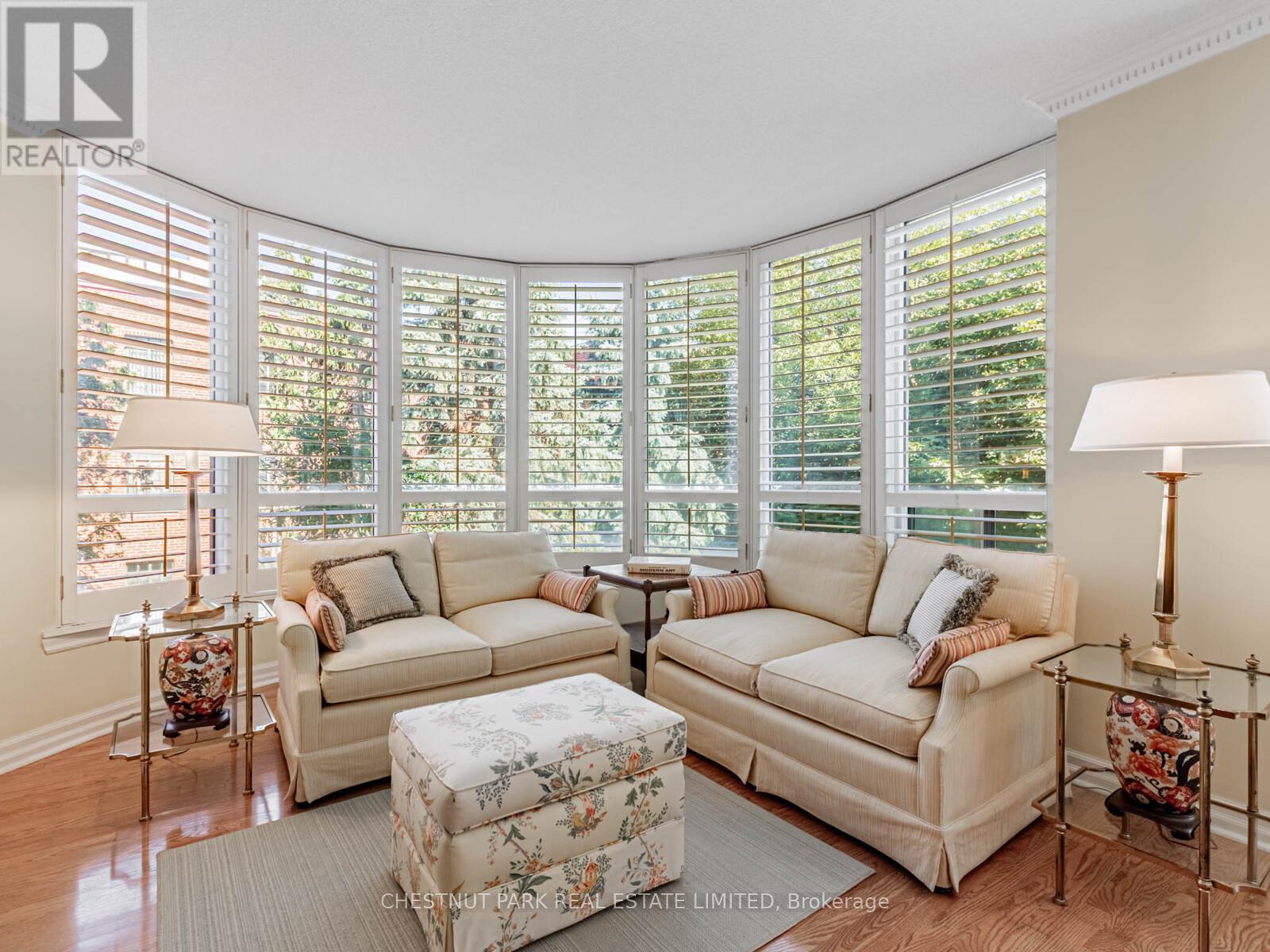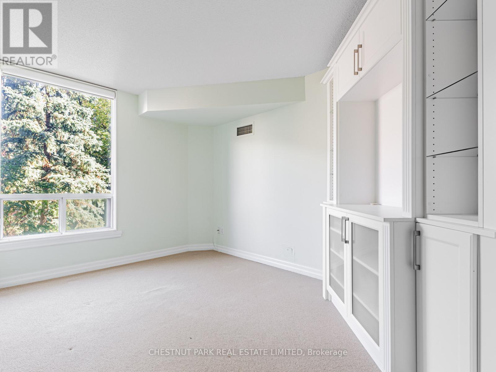 Spacious 1716 SF 2 bedroom, 2 bath condo in fabulous Lawrence Park. Rare offering, one owner, immaculately kept residence. Best exposure in the building. Enjoy serene views of green from east facing windows. This suite has space and scale for easy living. The eat-in kitchen is practical and well laid out, complete with granite counters, a large pantry and breakfast area with glass double French doors leading to the dining room. The elegant dining room easily holds a table for 10 or more and overlooks the living room, which has a gas fireplace (as is) and a patio door walk out to a 5 '7" x 11' 10" balcony with peaceful, treed views. The open concept den completes the space, providing wrap-around windows for light and views. The generously sized primary bedroom has two sets of double closets with organizers, a large east facing window overlooking trees and a marble-floored 6-piece ensuite bath with additional storage. The desirable split bedroom plan has the second bedroom easily closed off from the living space and is well defined in the home, boasting a large layout with built-ins, a closet with organizers, window and access to a 4-piece bath with marble flooring and storage. Includes parking and private locker room with door. An outstanding and sought-after building offering a resort-like experience with a skylit atrium and indoor pool, 24/7 concierge, exercise room, party/meeting room, sauna, rooftop garden with BBQs, library and visitor parking. There is an on-site property manager as well as a building superintendent. Superbly located within walking distance to excellent shops, restaurants, transit, Sheridan Nursery, Lawrence Park Ravine system, Sporting Life, and mins to 401. (id:51158)