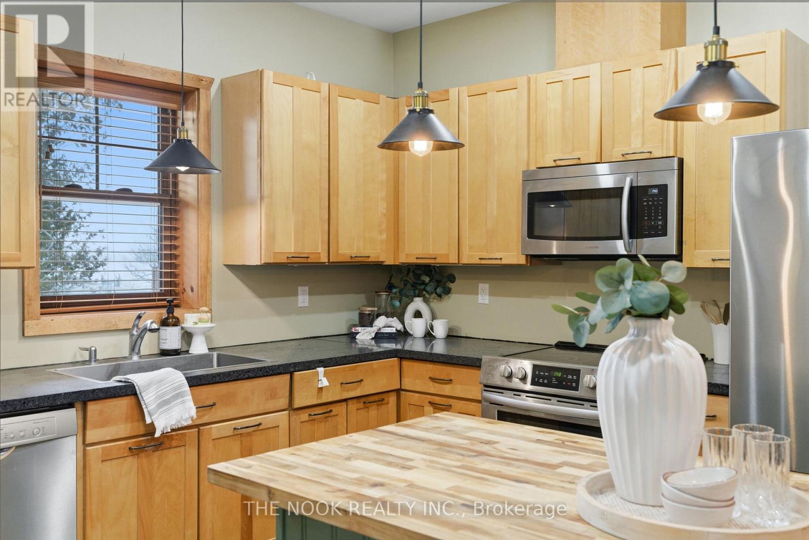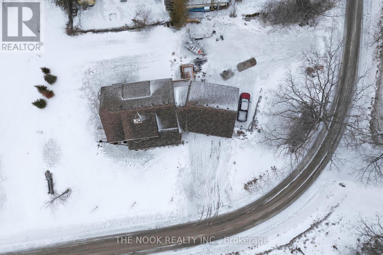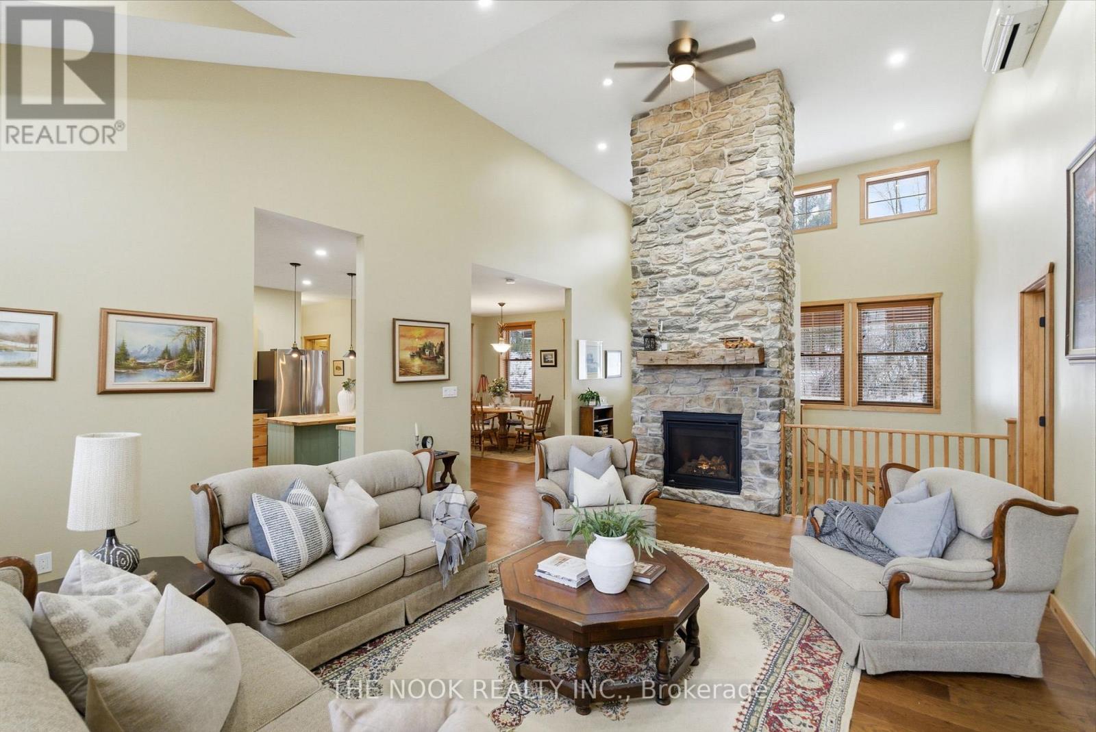 Set on just over half an acre in a quiet lakeside neighbourhood, this exceptional 4-year-old home offers stunning views of Rice Lake and an unparalleled indoor/outdoor lifestyle. A public dock and boat launch are conveniently located within 200 metres, making this an ideal property for boating and lake enthusiasts.Designed with a unique, sun-filled open-concept layout, the home offers approximately 2,400 sq ft of finished living space with 9' ceilings throughout and a dramatic 15' vaulted ceiling on the main floor. At the heart of the home is a massive central stone fireplace, complemented by a propane fireplace on the main level and a wood-burning fireplace in the lower level, creating warmth and character year-round.The main floor features a spacious primary bedroom with a private covered porch, a beautifully appointed ensuite, main floor laundry, and abundant storage and closet space. The finished walk out lower level offers two large bedrooms, a full bath, and additional living space ideal for family or guests. Hardwood and ceramic flooring flow throughout the home, adding timeless style and durability.Built for comfort and efficiency, the home boasts super-insulated walls and ceilings, in-floor hydronic heating on all levels, and a propane boiler providing both heat and hot water. Three mini-split units offer supplemental heating and air conditioning.Car, hobby, and recreational enthusiasts will appreciate the oversized four-car over/under garage, complete with a 9,000 lb Atlas two-post hoist, in-floor heat in the lower garage, propane radiant heat in the upper garage, air compressor plumbing on both levels, welder plug, RV hookups, and extensive storage for cars, boats, and campers.With covered front and rear porches, breathtaking lake views, and thoughtfully designed spaces throughout, this remarkable property offers comfort, functionality, and a lifestyle rarely found. (id:51158)