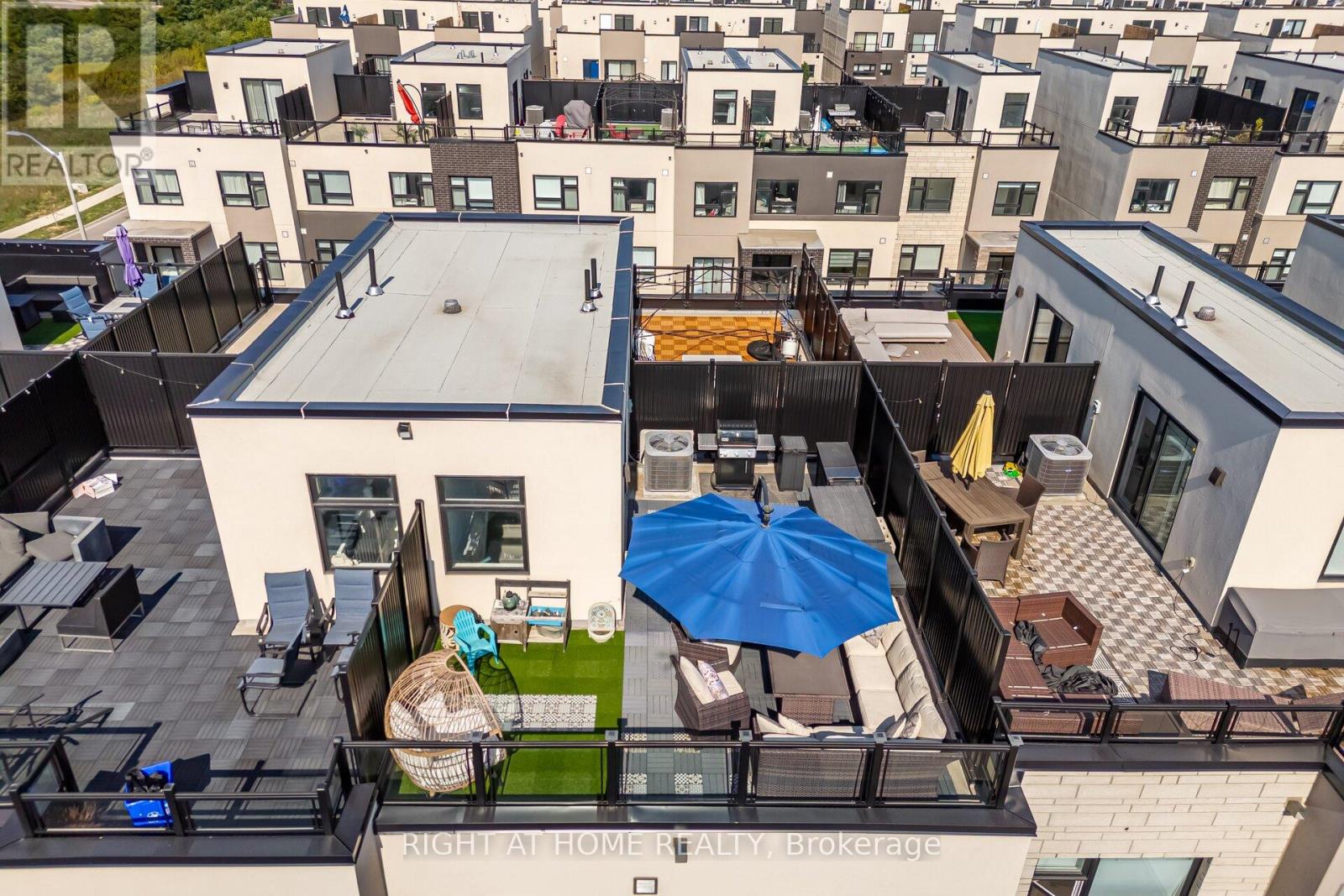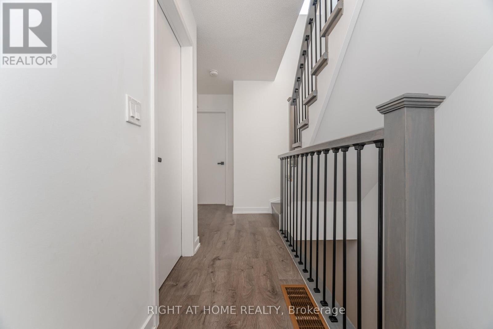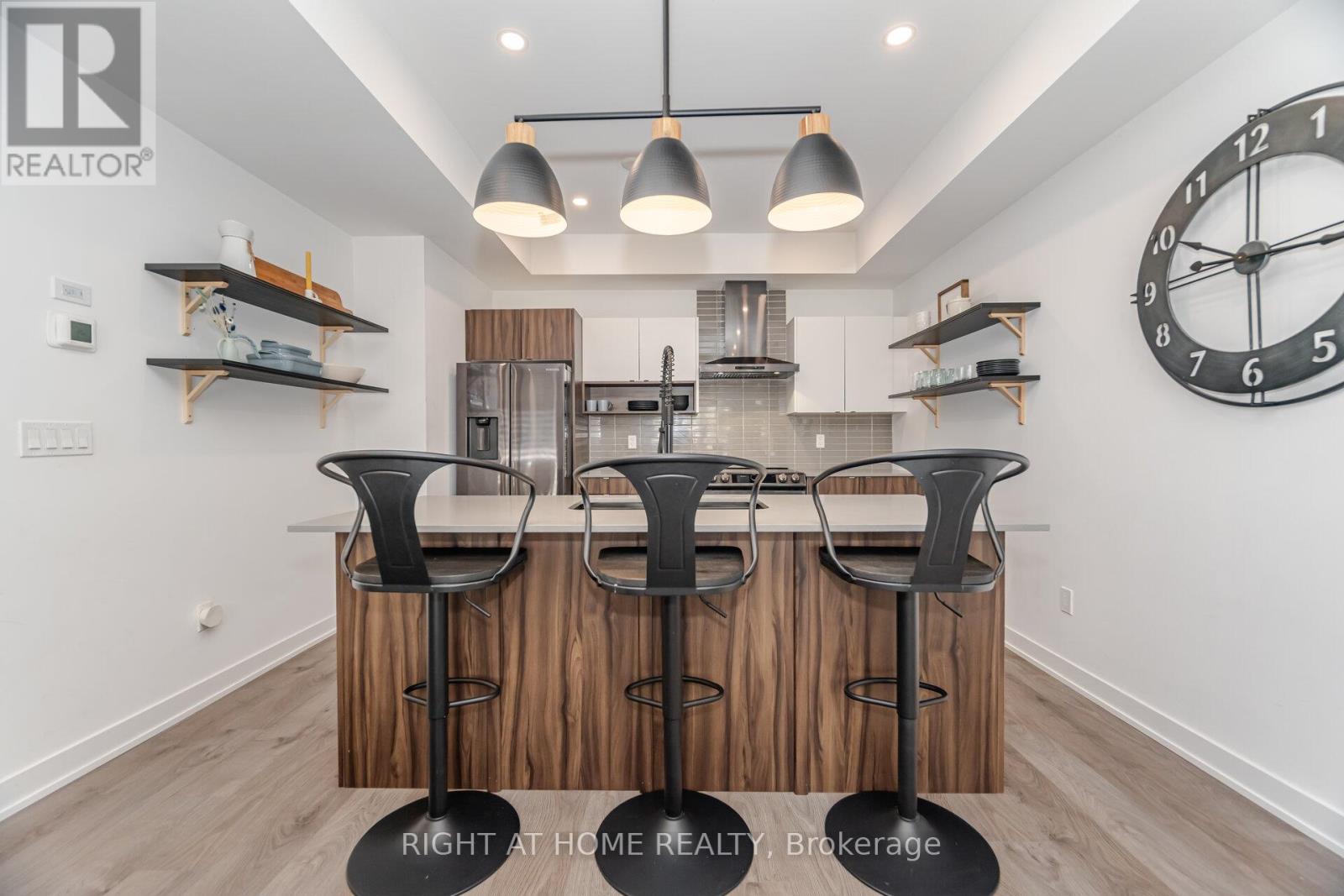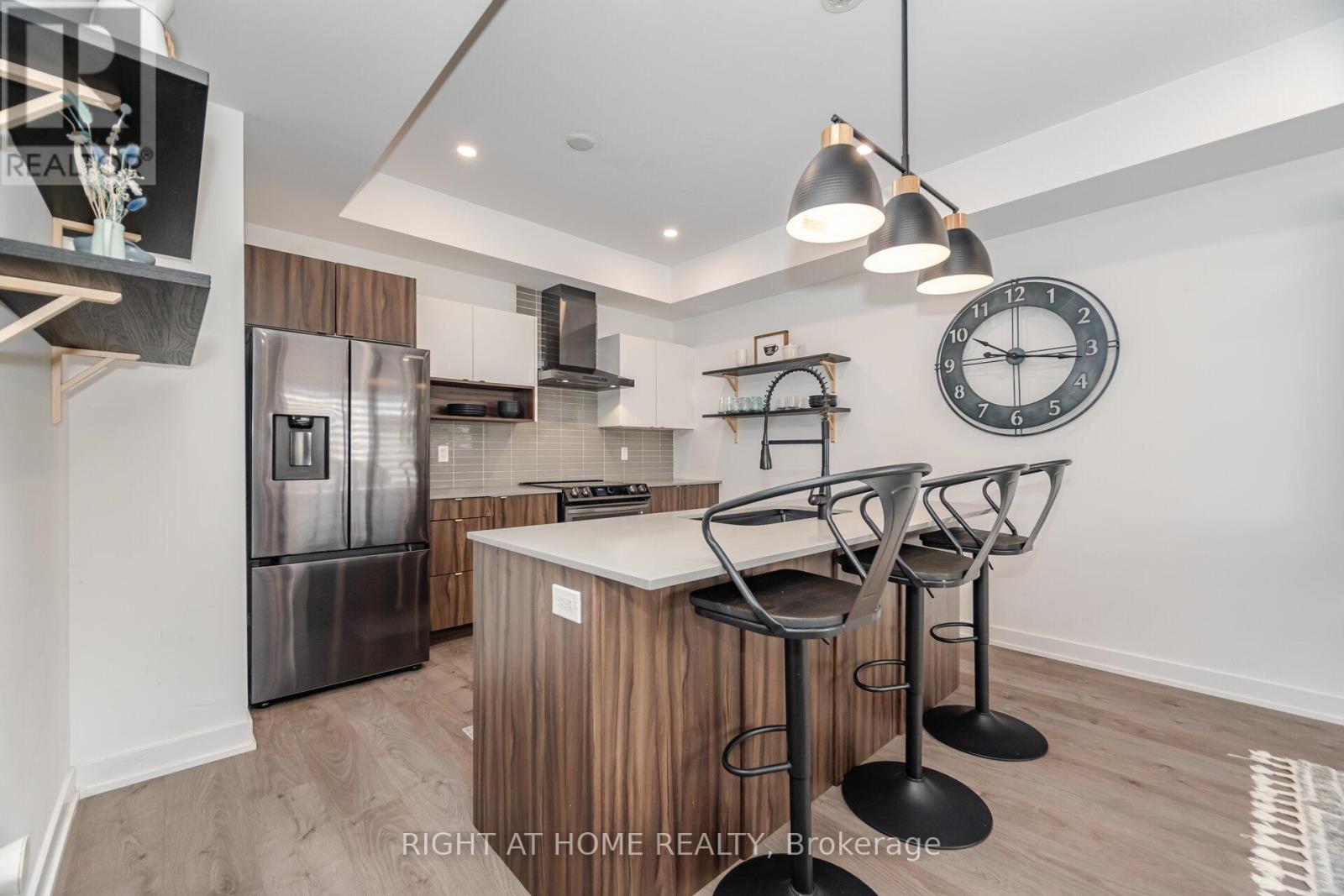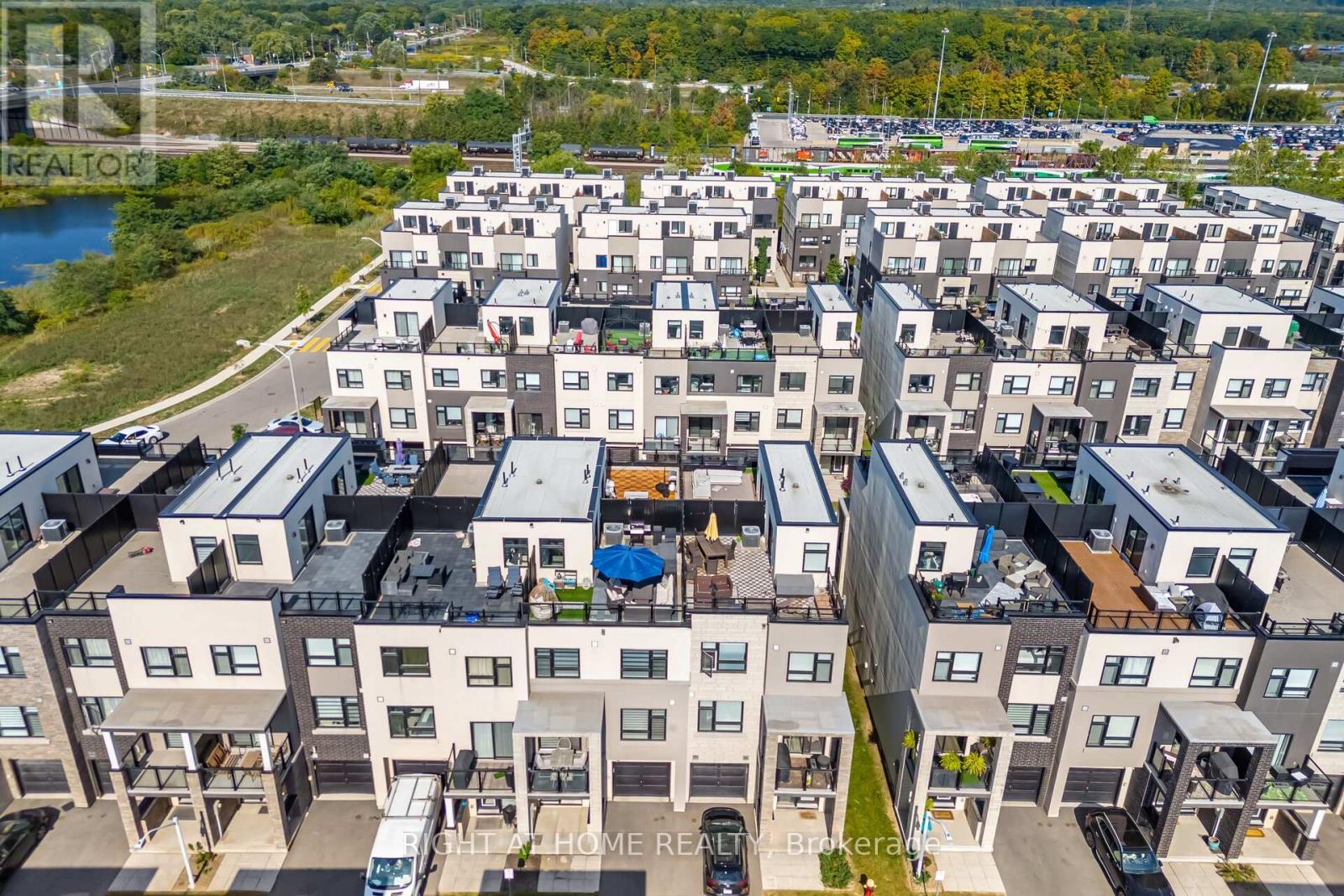 $334.21 Monthly*View Tour* Welcome to Station West a modern 3-storey townhome, perfectly located just minutes from the lake, parks, schools, and Aldershot GO Station. This upgraded 2 bedroom, 3 washroom 1,400+ sq. ft. of stylish, low-maintenance living space in one of Burlington's most desirable and commuter-friendly locations. This home has everything you're looking for, a rare hardwood oak staircase with black iron spindles from top to bottom. The potlights and upgraded light fixtures throughout bring a modern touch. Wide plank laminate flooring flows throughout the home, where large windows and a walkout to your private balcony flood the space with natural light. The second floor features a beautifully designed open-concept layout, with spacious living and dining area with a feature wall design that's perfect for entertaining and easy to furnish to suit your style. Step out to an additional balcony from the dining area for even more outdoor space. The kitchen has quartz countertops, a designer backsplash, upgraded black stainless steel appliances, and a large island with breakfast bar, built-in microwave, and built-in hood range. A upgraded 2-piece powder room is also located on this level. The third floor includes bright bedrooms, a full 3-piece bathroom, and bedroom-level laundry for added convenience. The top level boasts an oversized private rooftop terrace with stunning views of Burlington's. (id:51158)