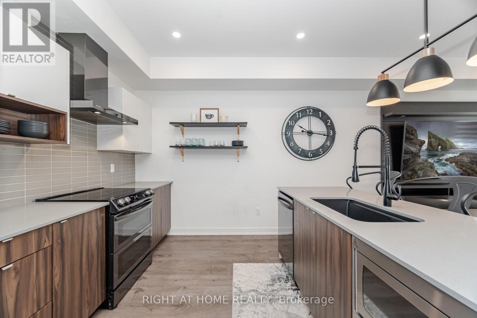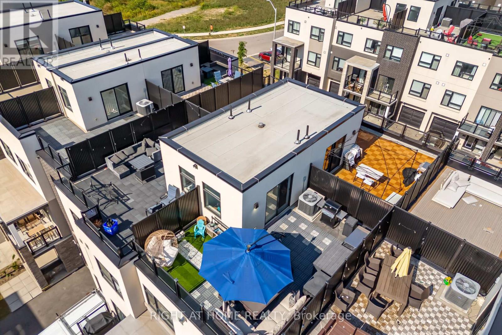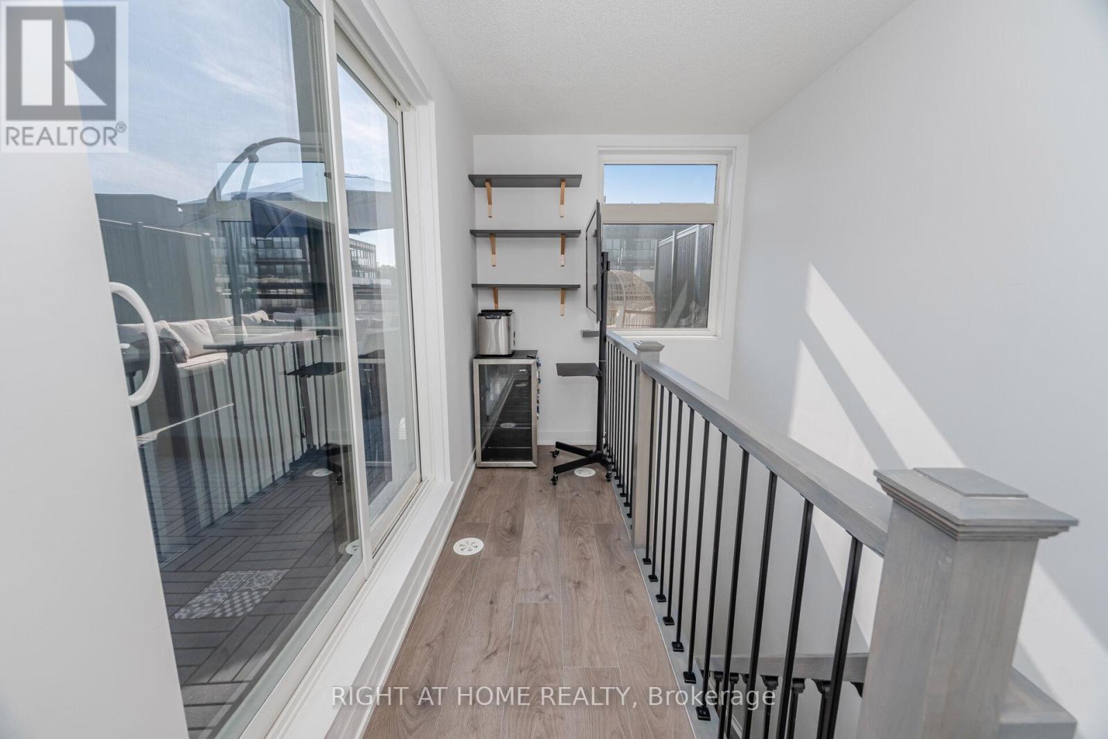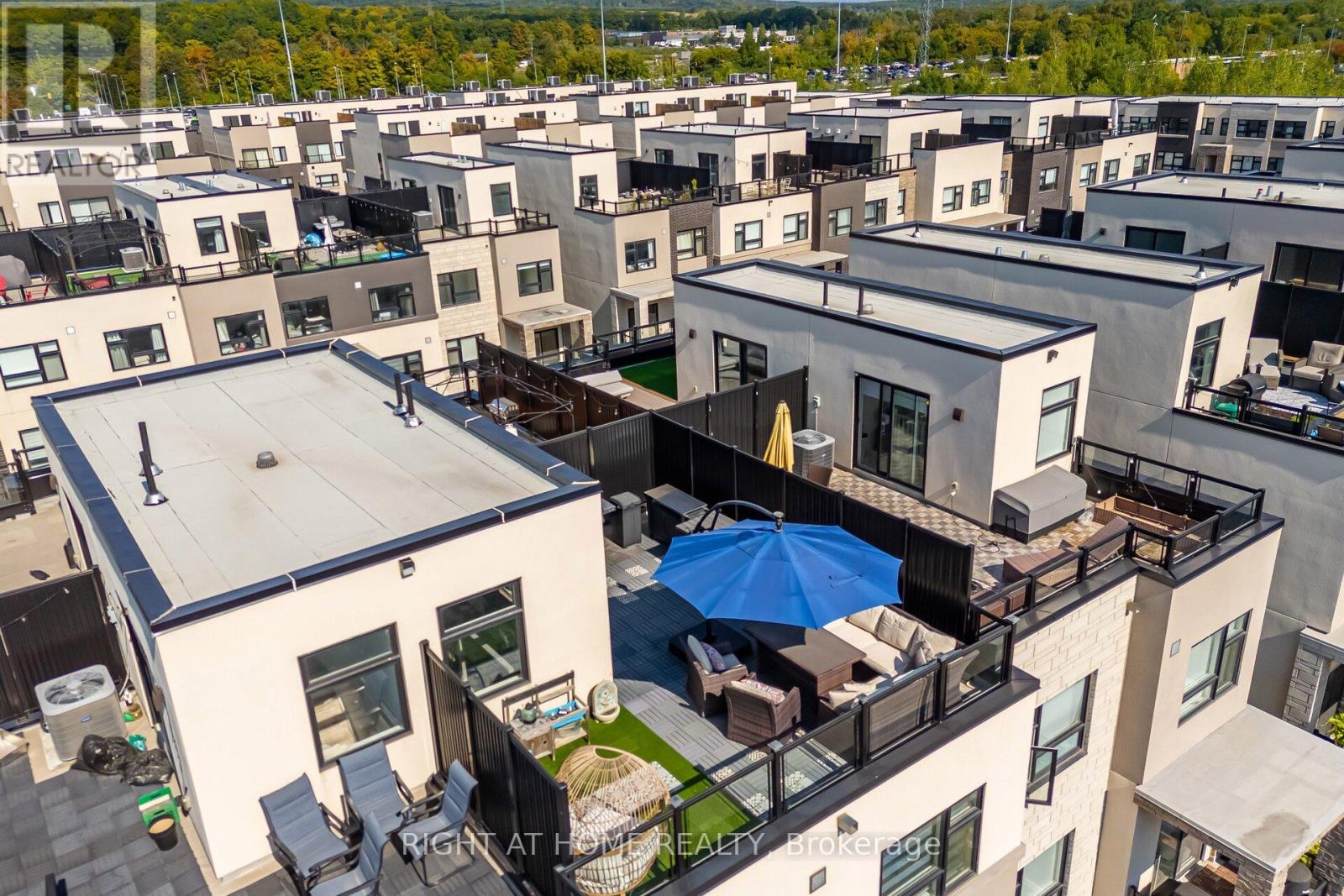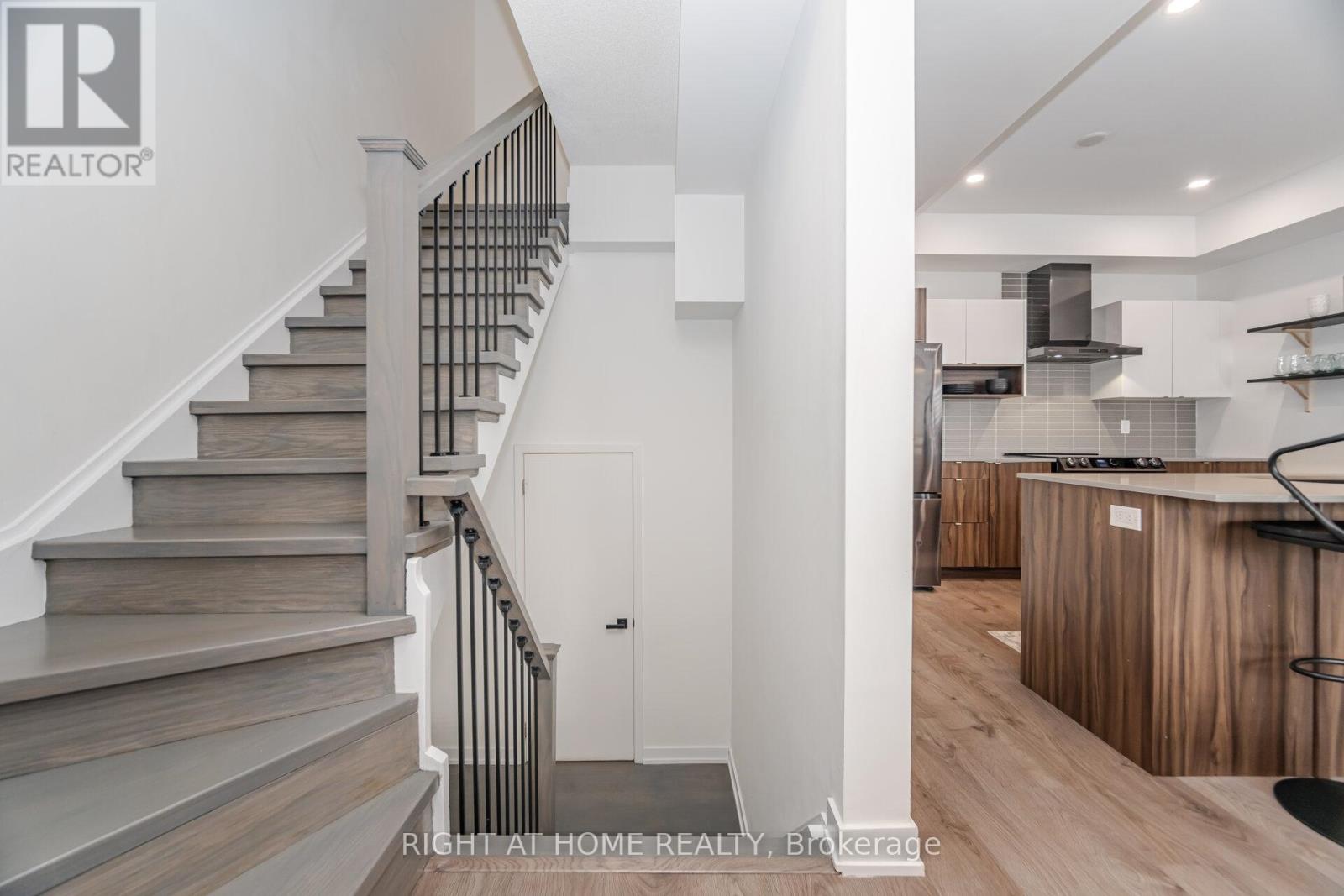 $334.21 Monthly*View Tour* Welcome to Station West a modern 3-storey townhome, perfectly located just minutes from the lake, parks, schools, and Aldershot GO Station. This upgraded 2 bedroom, 3 washroom 1,400+ sq. ft. of stylish, low-maintenance living space in one of Burlington's most desirable and commuter-friendly locations. This home has everything you're looking for, a rare hardwood oak staircase with black iron spindles from top to bottom. The potlights and upgraded light fixtures throughout bring a modern touch. Wide plank laminate flooring flows throughout the home, where large windows and a walkout to your private balcony flood the space with natural light. The second floor features a beautifully designed open-concept layout, with spacious living and dining area with a feature wall design that's perfect for entertaining and easy to furnish to suit your style. Step out to an additional balcony from the dining area for even more outdoor space. The kitchen has quartz countertops, a designer backsplash, upgraded black stainless steel appliances, and a large island with breakfast bar, built-in microwave, and built-in hood range. A upgraded 2-piece powder room is also located on this level. The third floor includes bright bedrooms, a full 3-piece bathroom, and bedroom-level laundry for added convenience. The top level boasts an oversized private rooftop terrace with stunning views of Burlington's. (id:51158)