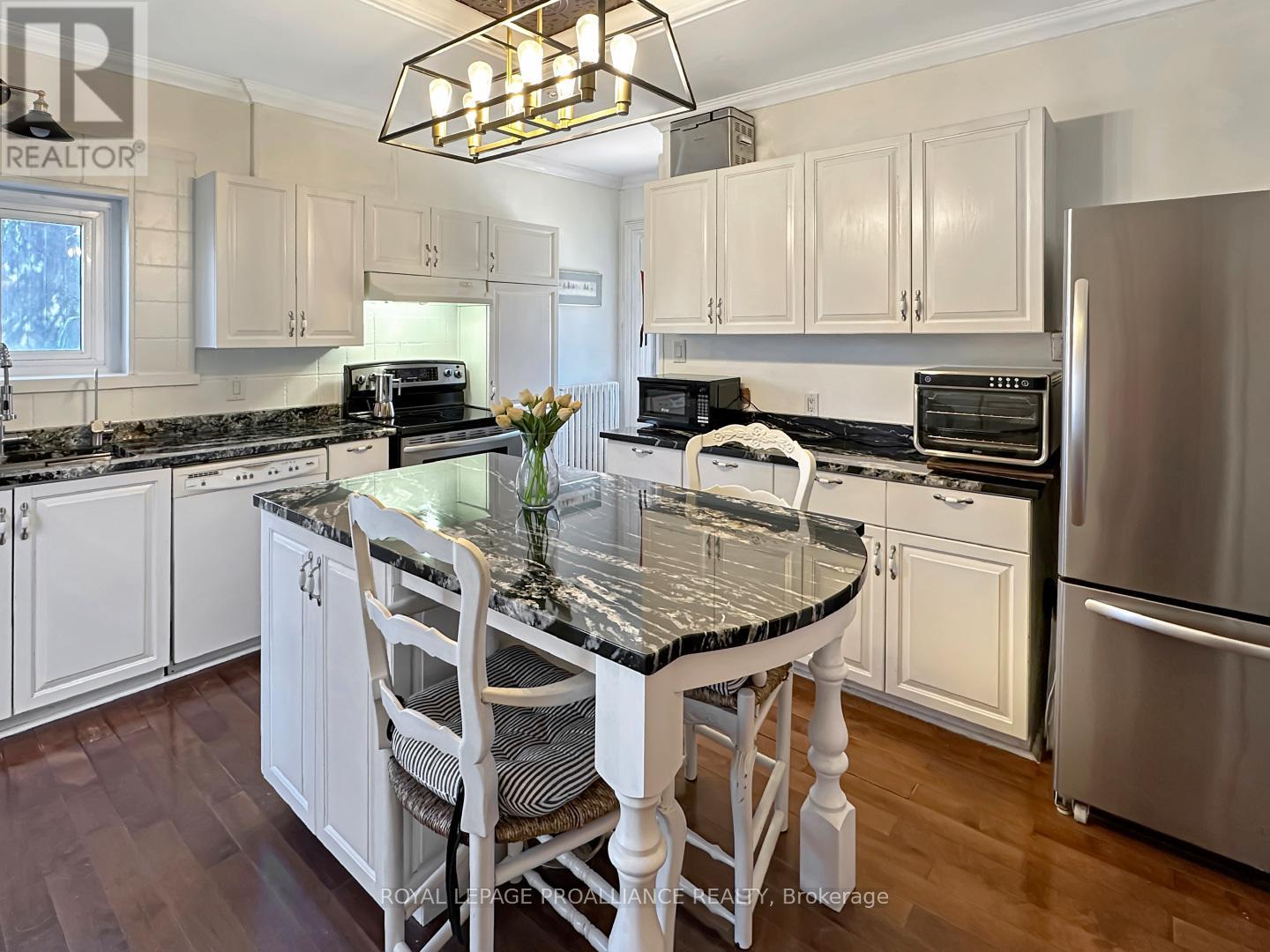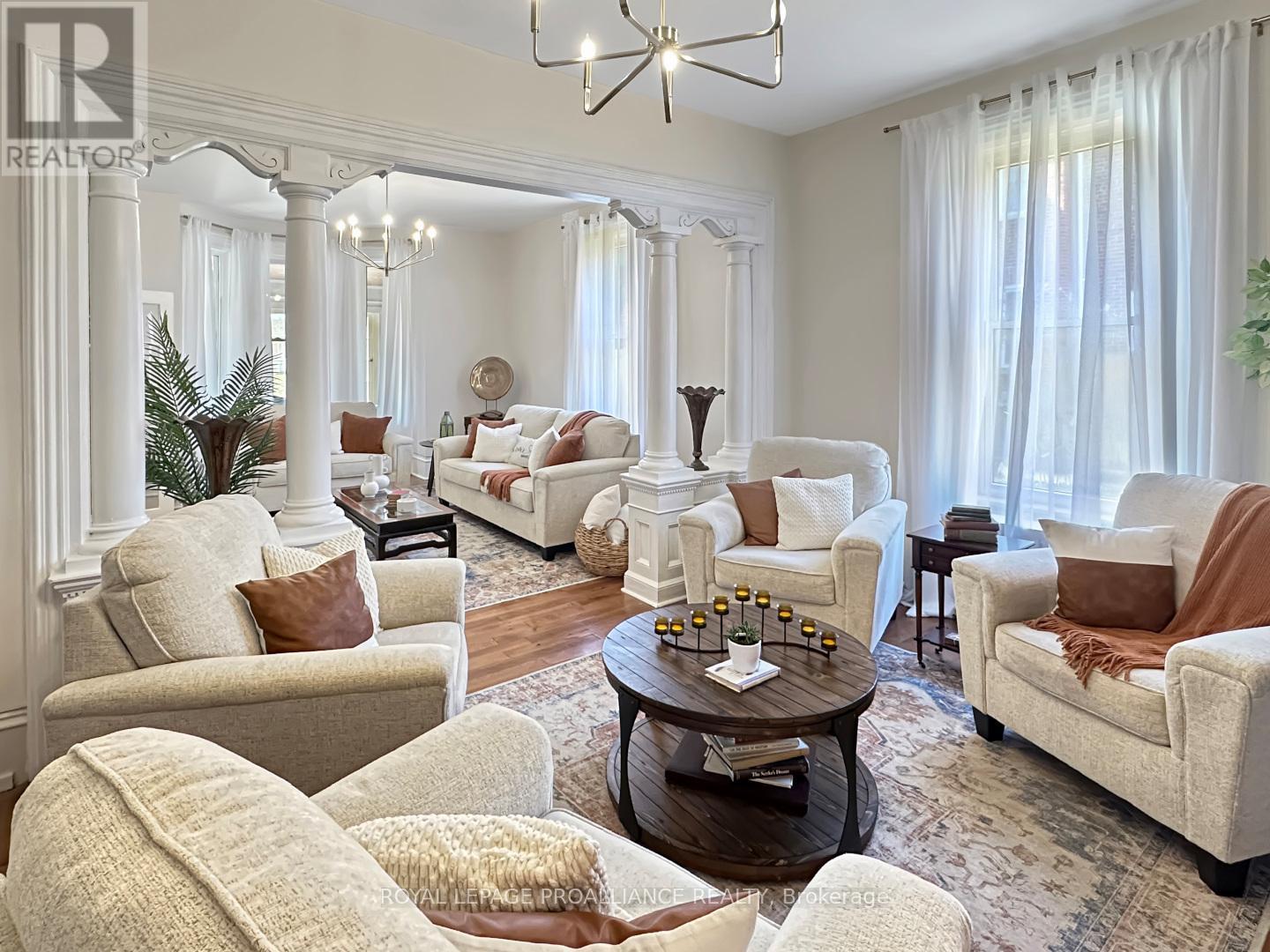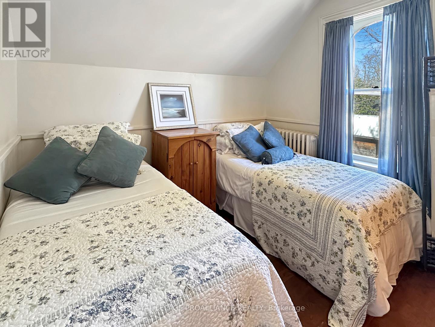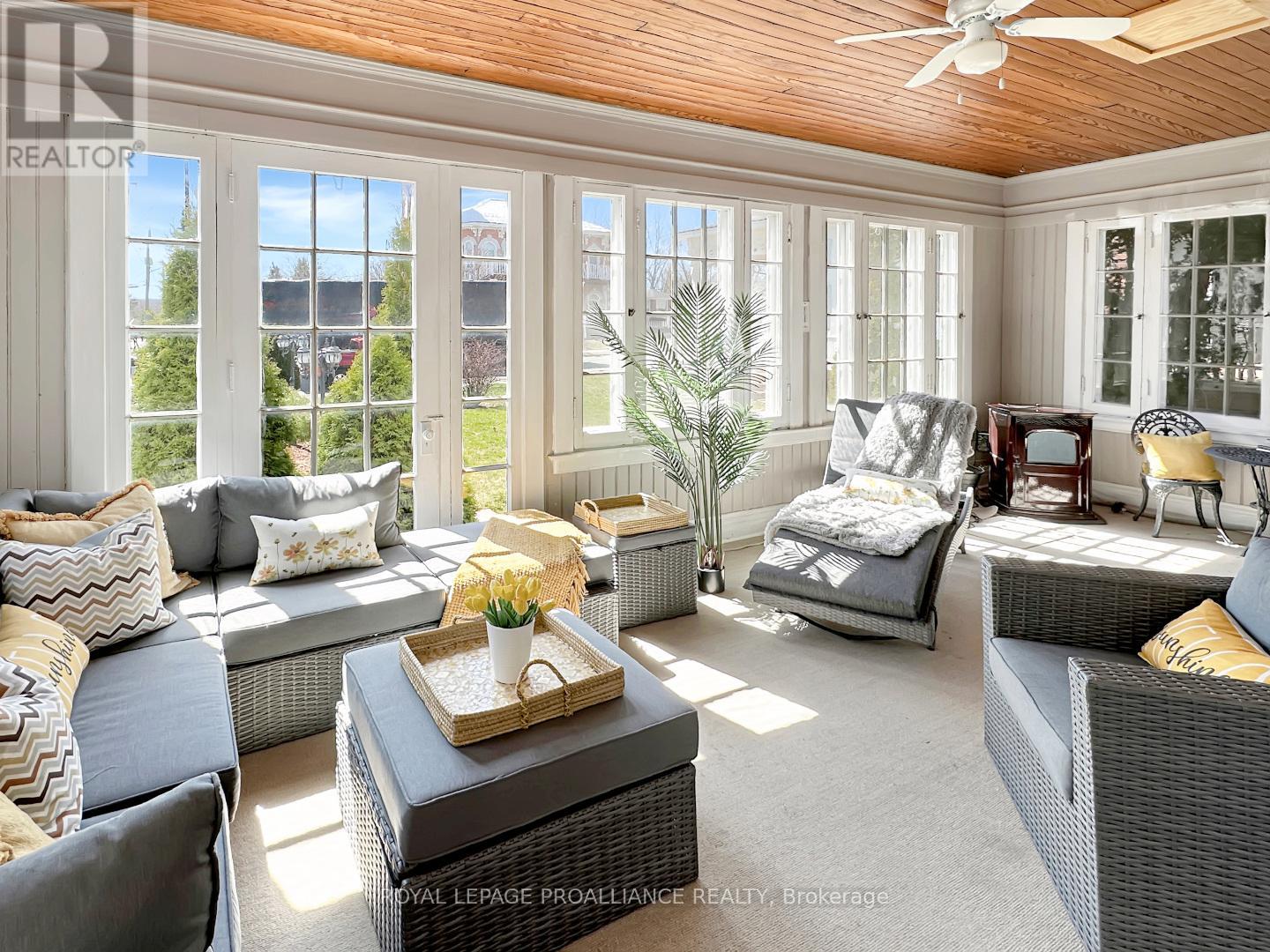 Welcome to this beautifully updated two-story brick century home, nestled in the downtown community of Stirling. Rich in character yet thoughtfully modernized, this spacious property offers incredible versatility. Step inside to discover a generous main level featuring a bright front sun-room, a large and inviting living room, a cozy fireplace readying room, a formal dining room, and a stylishly updated kitchen complete with ample cabinetry and a center island perfect for everyday living and entertaining. A cozy den, family room, office, and a full three-piece bathroom complete this level, with a layout that could easily be converted into a self-contained in-law suite. The second floor is accessible by two separate staircases and boasts five well-sized bedrooms, a stunning five-piece bathroom with a soaker tub, and convenient second-floor laundry. Beautiful hardwood flooring runs throughout the home, adding warmth and timeless elegance. Outside, enjoy a fully fenced backyard with a spacious deck ideal for relaxing or hosting guests. The property also includes a charming carriage house with parking for two vehicles, plenty of storage, and a loft that offers even more potential. Ample parking and a prime location just steps from Stirling's shops, cafes, and local amenities make this home the perfect blend of heritage charm and modern convenience.But it is more than just a home. It is a lifestyle centered in the downtown core, offering unparalleled walking accessibility to theaters, restaurants, coffee shops, grocery stores, and much more-all just steps away. This village is truly a community of support and care, known affectionately as the village with a big heart. The pictures simply don't do it justice. It's a must-see grand home from the 1800s that offers spacious living and a large backyard, blending historic charm with modern convenience. (id:51158)